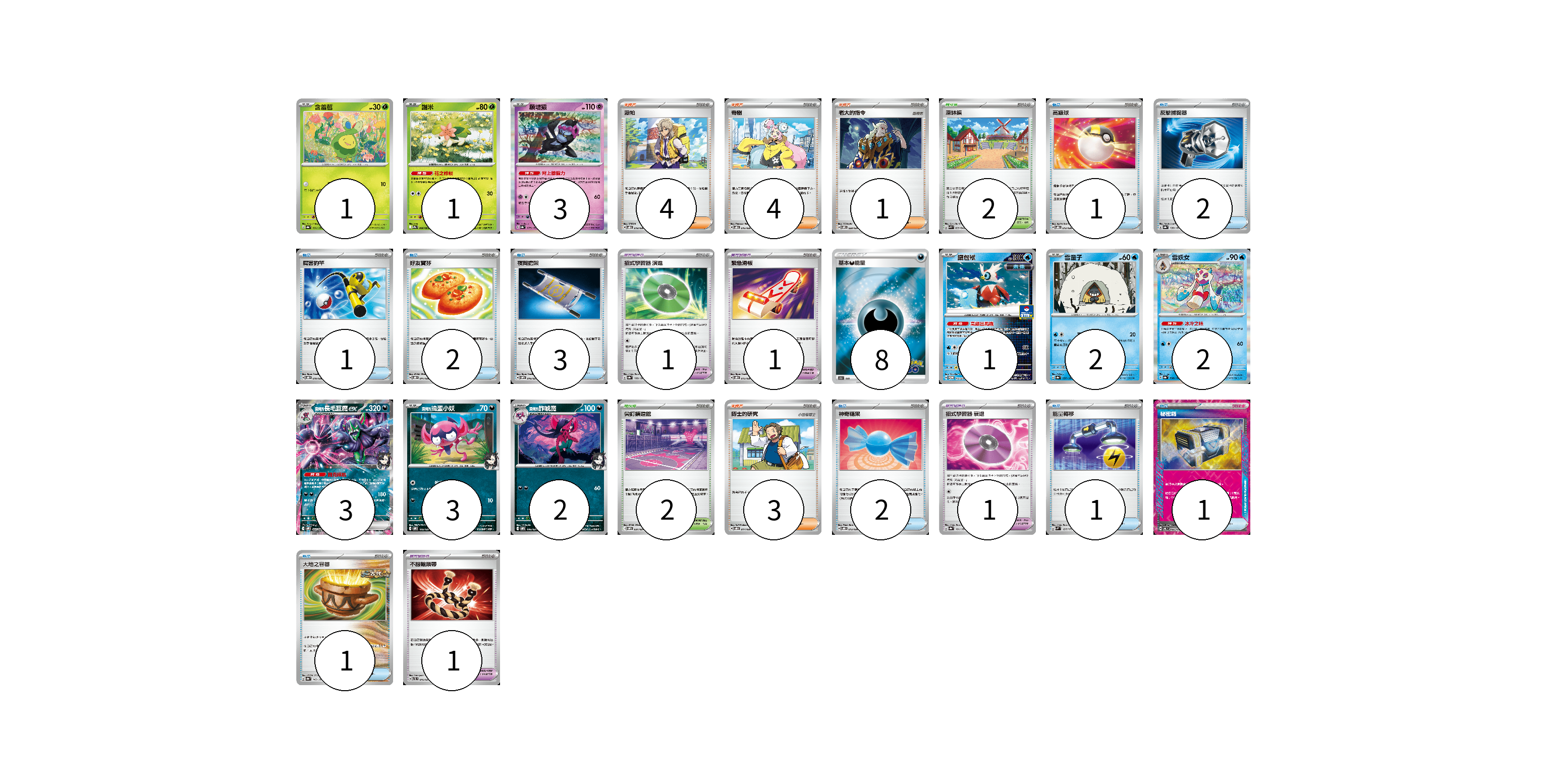 牌組構築方案 以此牌組為基礎新構築牌組 顯示卡面 顯示列表 寶可夢卡(18) 1 1 3 1 2 2 3 3 2 寶可夢道具(4) 1 1 1 1 物品卡(14) 1 2 1 2 3 2 1 1 1 支援者卡(12) 4 4 1 3 競技場卡(4) 2 2 能量卡(8) 8 寶可夢卡(18) 卡牌名稱 張數 卡牌名稱 張數 含羞苞 SV8a 001/187 01 謝米 SV9a 006/063 01 願增猿 SV8a 075/187 03 鐵包袱 SV-P 175/SV-P 01 雪童子 SV8a 037/187 02 雪妖女 SV8a 038/187 02 <瑪俐的>長毛巨魔ex SVOM 007/021 03 <瑪俐的>搗蛋小妖 SVOM 005/021 03 <瑪俐的>詐唬魔 SVOM 006/021 02 寶可夢道具(4) 卡牌名稱 張數 卡牌名稱 張數 招式學習器 演進 SV8a 160/187 01 緊急滑板 SVOD 015/020 01 招式學習器 衰退 SV8a 161/187 01 不服輸頭帶 SVTL 016/021 01 物品卡(14) 卡牌名稱 張數 卡牌名稱 張數 高級球 SVOD 012/020 01 反擊捕捉器 SV8a 139/187 02 厲害釣竿 SVOD 010/020 01 好友寶芬 SVOD 011/020 02 夜間擔架 SVOM 016/021 03 神奇糖果 SVOD 013/020 02 能量轉移 SVM 127/175 01 秘密箱 SV6 092/101 01 大地之容器 SV8a 143/187 01 支援者卡(12) 卡牌名稱 張數 卡牌名稱 張數 派帕 SVOD 018/020 04 奇樹 SVOD 016/020 04 老大的指令 SVOM 020/021 01 博士的研究 SVOD 017/020 03 競技場卡(4) 卡牌名稱 張數 卡牌名稱 張數 深缽鎮 SVK 039/042 02 尖釘鎮道館 SVOM 021/021 02 能量卡(8) 卡牌名稱 張數 卡牌名稱 張數 基本惡能量 S10b DAR 08 以此牌組為基礎新構築牌組 牌組編碼 kWsOMy-AyFzPp-yEIDsZ copy 列印牌組單 牌組編碼已複製 分享至SNS