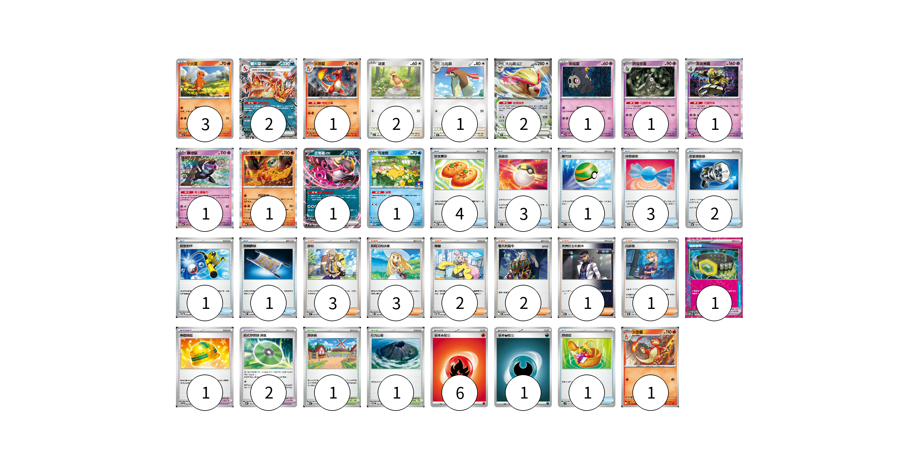 牌組構築方案 以此牌組為基礎新構築牌組 顯示卡面 顯示列表 寶可夢卡(19) 3 2 1 2 1 2 1 1 1 1 1 1 1 1 寶可夢道具(4) 1 1 2 物品卡(16) 4 3 1 3 2 1 1 1 支援者卡(12) 3 3 2 2 1 1 競技場卡(2) 1 1 能量卡(7) 6 1 寶可夢卡(19) 卡牌名稱 張數 卡牌名稱 張數 小火龍 SV4a 025/190 03 噴火龍ex SVTL 006/021 02 火恐龍 SVTL 002/021 01 波波 SV3 087/108 02 比比鳥 SVK 004/042 01 大比鳥ex SVK 005/042 02 夜巡靈 SV6a 018/064 01 彷徨夜靈 SV6a 019/064 01 黑夜魔靈 SV6a 020/064 01 願增猿 SV8a 075/187 01 古玉魚 SV8a 025/187 01 吉雉雞ex SVOD 004/020 01 可達鴨 SV-P 220/SV-P 01 火恐龍 M2 012/080 01 寶可夢道具(4) 卡牌名稱 張數 卡牌名稱 張數 極限腰帶 SV8a 159/187 01 幸運頭盔 SV5a 060/066 01 招式學習器 演進 SV8a 160/187 02 物品卡(16) 卡牌名稱 張數 卡牌名稱 張數 好友寶芬 MBG 011/022 04 高級球 SVM 134/175 03 巢穴球 SVM 133/175 01 神奇糖果 SVK 019/042 03 反擊捕捉器 SV8a 139/187 02 厲害釣竿 SVOD 010/020 01 夜間擔架 MBD 016/022 01 野餐籃 SV1V 071/078 01 支援者卡(12) 卡牌名稱 張數 卡牌名稱 張數 派帕 SVK 035/042 03 莉莉艾的決意 MBD 021/022 03 奇樹 SVOD 016/020 02 老大的指令 MBD 020/022 02 弗圖博士的劇本 SV8a 175/187 01 白蕾雅 SV8a 176/187 01 競技場卡(2) 卡牌名稱 張數 卡牌名稱 張數 深缽鎮 SVK 039/042 01 引力山岳 SV8 106/106 01 能量卡(7) 卡牌名稱 張數 卡牌名稱 張數 基本火能量 sv-p FIR 06 基本惡能量 sv-p DAR 01 以此牌組為基礎新構築牌組 牌組編碼 kXVkkf-uYFQNX-qQQJQQ copy 列印牌組單 牌組編碼已複製 分享至SNS