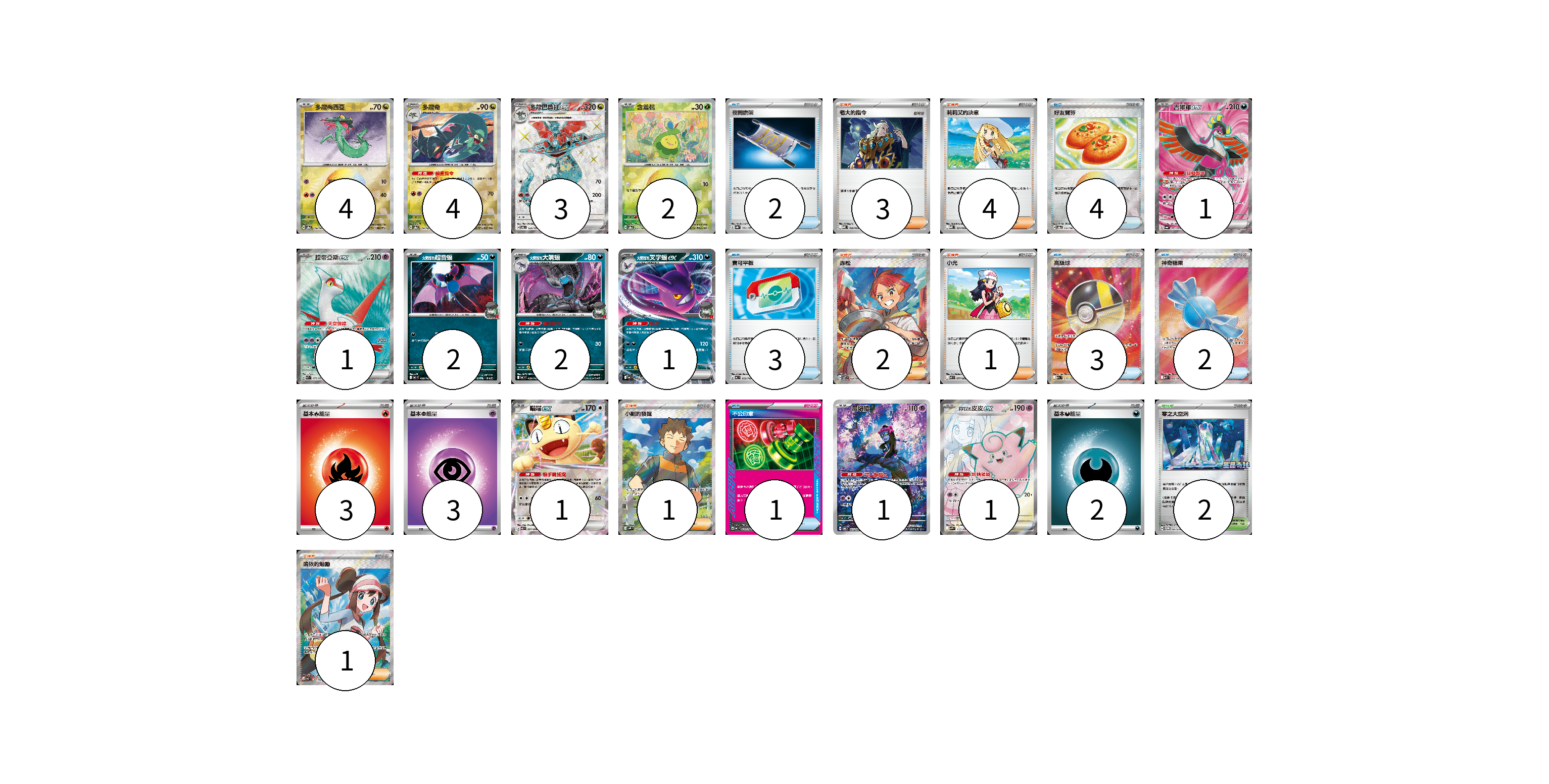 牌組構築方案 以此牌組為基礎新構築牌組 顯示卡面 顯示列表 寶可夢卡(23) 4 4 3 2 1 1 2 2 1 1 1 1 物品卡(15) 2 4 3 3 2 1 支援者卡(12) 3 4 2 1 1 1 競技場卡(2) 2 能量卡(8) 3 3 2 寶可夢卡(23) 卡牌名稱 張數 卡牌名稱 張數 多龍梅西亞 SV8a 118/187 04 多龍奇 SV8a 119/187 04 多龍巴魯托ex SV6 120/101 03 含羞苞 SV8a 001/187 02 吉雉雞ex SV6a 081/064 01 拉帝亞斯ex SV7a 078/064 01 <火箭隊的>超音蝠 MC 438/742 02 <火箭隊的>大嘴蝠 MC 439/742 02 <火箭隊的>叉字蝠ex MC 440/742 01 喵喵ex M3 061/080 01 願增猿 SV6 107/101 01 莉莉艾的皮皮ex SV9 115/100 01 物品卡(15) 卡牌名稱 張數 卡牌名稱 張數 夜間擔架 SV8a 151/187 02 好友寶芬 SV8a 147/187 04 寶可平板 MC 662/742 03 高級球 M2a 216/193 03 神奇糖果 M1S 082/063 02 不公印章 MC 633/742 01 支援者卡(12) 卡牌名稱 張數 卡牌名稱 張數 老大的指令 MBD 020/022 03 莉莉艾的決意 MBD 021/022 04 赤松 SV7 123/102 02 小光 M2 077/080 01 小剛的發掘 SV9 123/100 01 鳴依的勉勵 M3 107/080 01 競技場卡(2) 卡牌名稱 張數 卡牌名稱 張數 零之大空洞 SV-P 151/SV-P 02 能量卡(8) 卡牌名稱 張數 卡牌名稱 張數 基本【火】能量 MC FIR 03 基本【超】能量 MC PSY 03 基本【惡】能量 MC DAR 02 以此牌組為基礎新構築牌組 牌組編碼 kYADQM-XaNyDy-DfqrAj copy 列印牌組單 牌組編碼已複製 分享至SNS