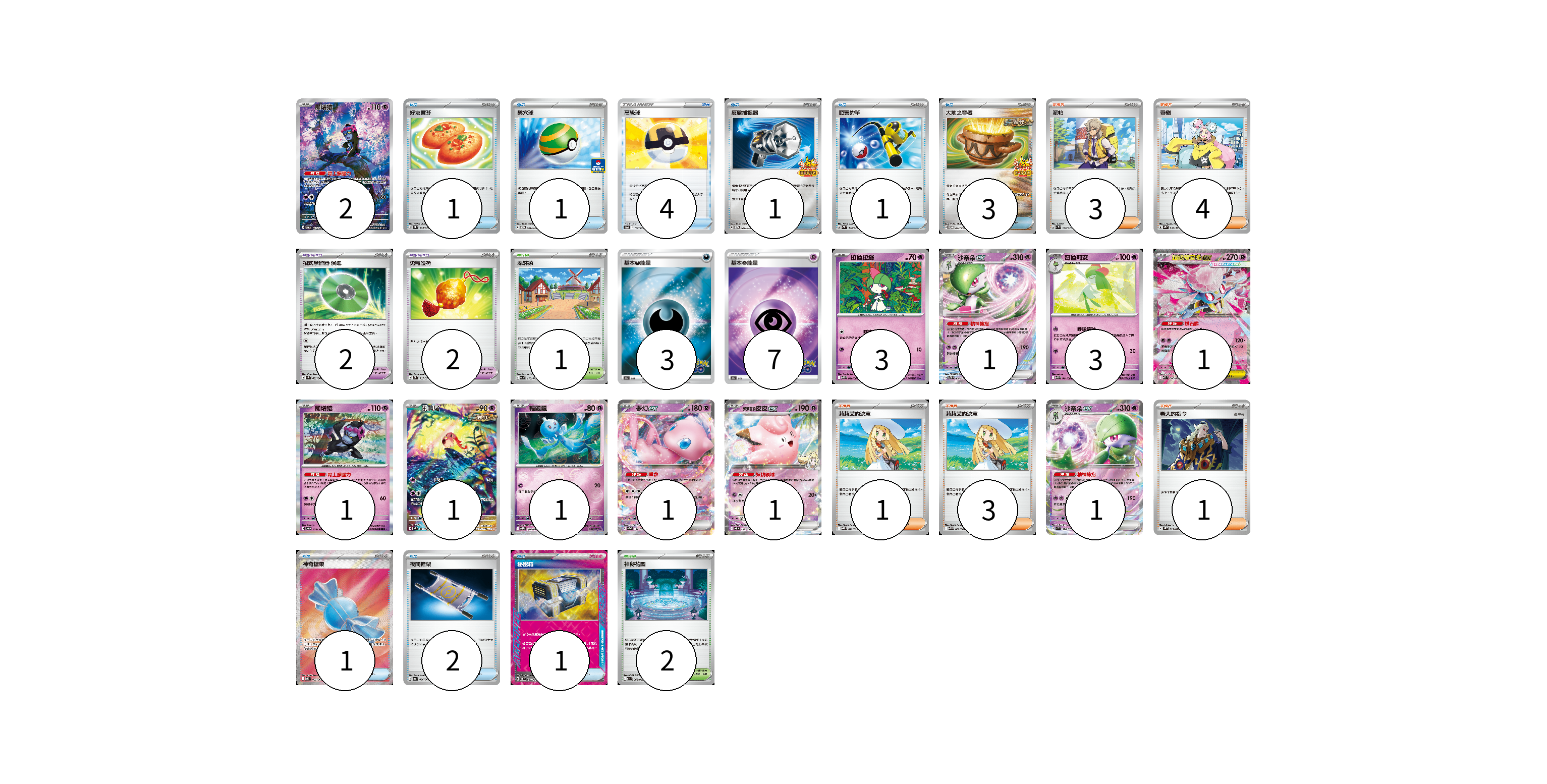牌組構築方案 以此牌組為基礎新構築牌組 顯示卡面 顯示列表 寶可夢卡(16) 2 3 1 3 1 1 1 1 1 1 1 寶可夢道具(4) 2 2 物品卡(15) 1 1 4 1 1 3 1 2 1 支援者卡(12) 3 4 1 3 1 競技場卡(3) 1 2 能量卡(10) 3 7 寶可夢卡(16) 卡牌名稱 張數 卡牌名稱 張數 願增猿 SV6 107/101 02 拉魯拉絲 M1S 040/063 03 沙奈朵ex SVTS 004/022 01 奇魯莉安 M1S 041/063 03 超級蒂安希ex MBD 006/022 01 願增猿 SV6 055/101 01 吼叫尾 SV4K 071/066 01 輕飄飄 SV11W 041/086 01 夢幻ex SV2a 151/165 01 莉莉艾的皮皮ex SV9 033/100 01 沙奈朵ex SV1S 028/078 01 寶可夢道具(4) 卡牌名稱 張數 卡牌名稱 張數 招式學習器 演進 SV4M 063/066 02 勇氣護符 SV2D 067/071 02 物品卡(15) 卡牌名稱 張數 卡牌名稱 張數 好友寶芬 SV5K 063/071 01 巢穴球 SV-P 091/SV-P 01 高級球 S12a 138/172 04 反擊捕捉器 SV-P 083/SV-P 01 厲害釣竿 SV2P 066/071 01 大地之容器 SV-P 084/SV-P 03 神奇糖果 M1S 082/063 01 夜間擔架 SV6a 056/064 02 秘密箱 SV6 092/101 01 支援者卡(12) 卡牌名稱 張數 卡牌名稱 張數 派帕 SV1V 076/078 03 奇樹 SV2D 069/071 04 莉莉艾的決意 MBG 022/022 01 莉莉艾的決意 M1L 062/063 03 老大的指令 SVHK 022/022 01 競技場卡(3) 卡牌名稱 張數 卡牌名稱 張數 深缽鎮 SV1a 070/073 01 神秘花園 M1S 063/063 02 能量卡(10) 卡牌名稱 張數 卡牌名稱 張數 基本惡能量 S10b DAR 03 基本超能量 S10b PSY 07 以此牌組為基礎新構築牌組 牌組編碼 kYcCpe-bjDsfo-iXGcOz copy 列印牌組單 牌組編碼已複製 分享至SNS