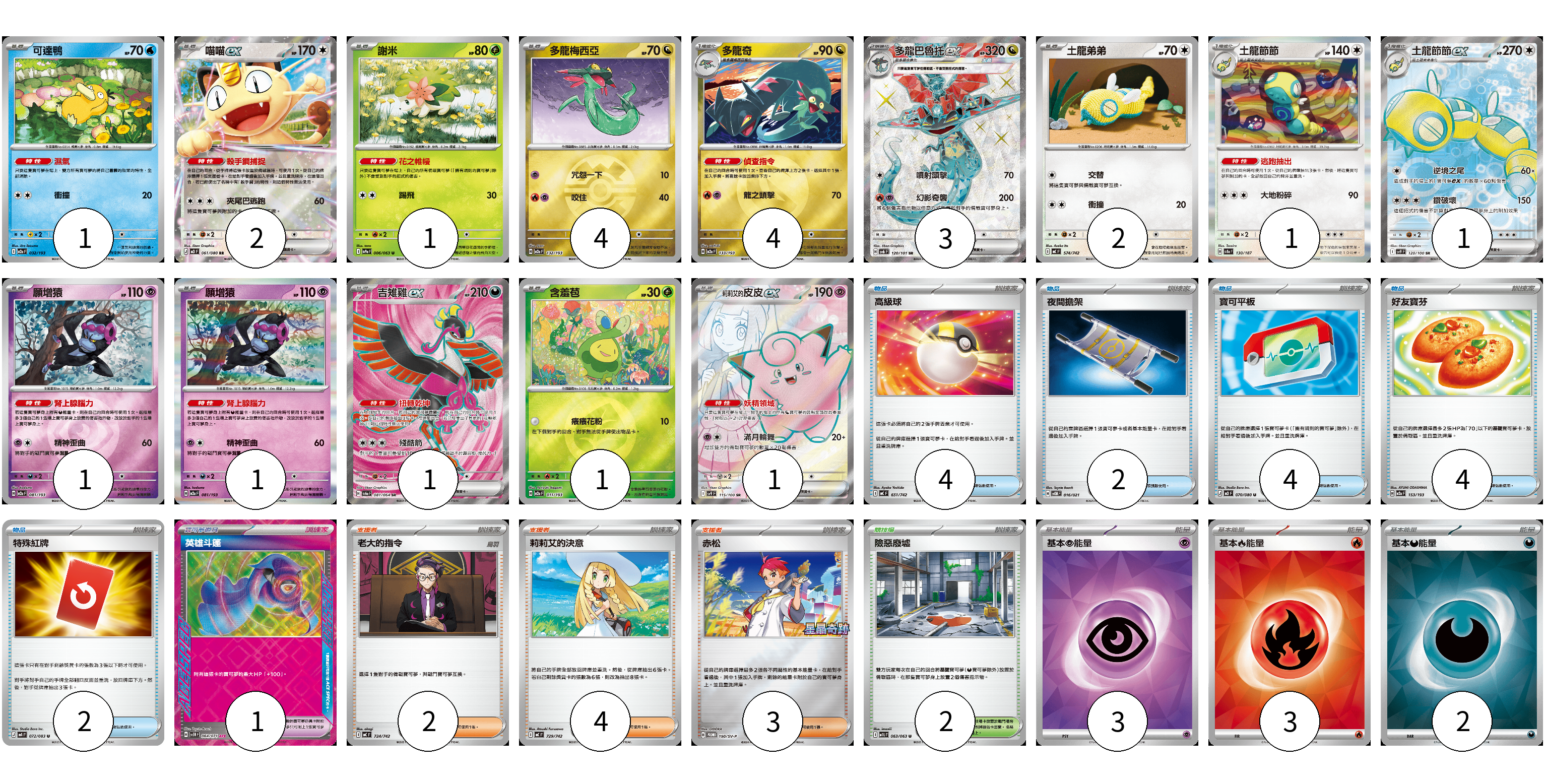 牌組構築方案 以此牌組為基礎新構築牌組 顯示卡面 顯示列表 寶可夢卡(24) 1 2 1 4 4 3 2 1 1 1 1 1 1 1 寶可夢道具(1) 1 物品卡(16) 4 2 4 4 2 支援者卡(9) 2 4 3 競技場卡(2) 2 能量卡(8) 3 3 2 寶可夢卡(24) 卡牌名稱 張數 卡牌名稱 張數 可達鴨 M2a 032/193 01 喵喵ex M3 061/080 02 謝米 SV9a 006/063 01 多龍梅西亞 M2a 132/193 04 多龍奇 M2a 133/193 04 多龍巴魯托ex SV6 120/101 03 土龍弟弟 MC 574/742 02 土龍節節 SV8a 130/187 01 土龍節節ex SV9 120/100 01 願增猿 M2a 081/193 01 願增猿 M2a 081/193 01 吉雉雞ex SV6a 081/064 01 含羞苞 M2a 011/193 01 莉莉艾的皮皮ex SV9 115/100 01 寶可夢道具(1) 卡牌名稱 張數 卡牌名稱 張數 英雄斗篷 SV5M 064/071 01 物品卡(16) 卡牌名稱 張數 卡牌名稱 張數 高級球 MC 651/742 04 夜間擔架 SVOM 016/021 02 寶可平板 M3 070/080 04 好友寶芬 M2a 153/193 04 特殊紅牌 M4 072/083 02 支援者卡(9) 卡牌名稱 張數 卡牌名稱 張數 老大的指令 MC 724/742 02 莉莉艾的決意 MC 729/742 04 赤松 SV-P 150/SV-P 03 競技場卡(2) 卡牌名稱 張數 卡牌名稱 張數 險惡廢墟 M1L 063/063 02 能量卡(8) 卡牌名稱 張數 卡牌名稱 張數 基本【超】能量 SVOD PSY 03 基本【火】能量 SVQL FIR 03 基本【惡】能量 SVM DAR 02 以此牌組為基礎新構築牌組 牌組編碼 kYpFJo-ylqGBH-KYMbqd copy 列印牌組單 牌組編碼已複製 分享至SNS