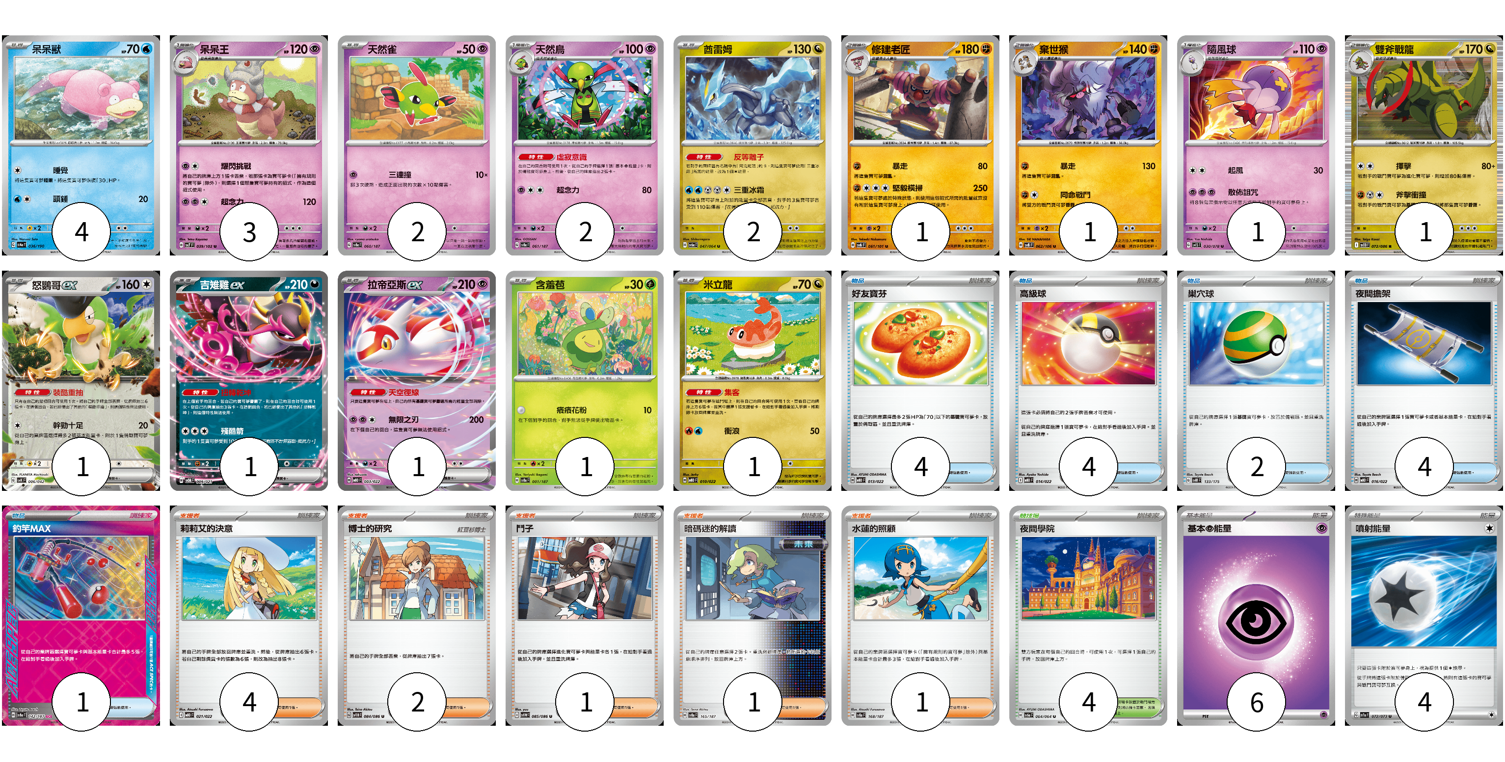 牌組構築方案 以此牌組為基礎新構築牌組 顯示卡面 顯示列表 寶可夢卡(22) 4 3 2 2 2 1 1 1 1 1 1 1 1 1 物品卡(15) 4 4 2 4 1 支援者卡(9) 4 2 1 1 1 競技場卡(4) 4 能量卡(10) 6 4 寶可夢卡(22) 卡牌名稱 張數 卡牌名稱 張數 呆呆獸 SV4a 036/190 04 呆呆王 SV7 039/102 03 天然雀 SV8a 060/187 02 天然鳥 SV8a 061/187 02 酋雷姆 SV6a 047/064 02 修建老匠 SV6 061/101 01 棄世猴 SV8 062/106 01 隨風球 SV1S 030/078 01 雙斧戰龍 SV11B 072/086 01 怒鸚哥ex SVK 006/042 01 吉雉雞ex SVOM 009/021 01 拉帝亞斯ex MBD 003/022 01 含羞苞 SV8a 001/187 01 米立龍 MBD 010/022 01 物品卡(15) 卡牌名稱 張數 卡牌名稱 張數 好友寶芬 MBD 013/022 04 高級球 MBD 014/022 04 巢穴球 SVM 133/175 02 夜間擔架 MBD 016/022 04 釣竿MAX SV8a 142/187 01 支援者卡(9) 卡牌名稱 張數 卡牌名稱 張數 莉莉艾的決意 MBD 021/022 04 博士的研究 SV11B 084/086 02 鬥子 SV11W 085/086 01 暗碼迷的解讀 SV8a 165/187 01 水蓮的照顧 SV8a 168/187 01 競技場卡(4) 卡牌名稱 張數 卡牌名稱 張數 夜間學院 SV6a 064/064 04 能量卡(10) 卡牌名稱 張數 卡牌名稱 張數 基本【超】能量 MBD PSY 06 噴射能量 SV1a 072/073 04 以此牌組為基礎新構築牌組 牌組編碼 kaQKAF-MRZYog-BBeUXH copy 列印牌組單 牌組編碼已複製 分享至SNS