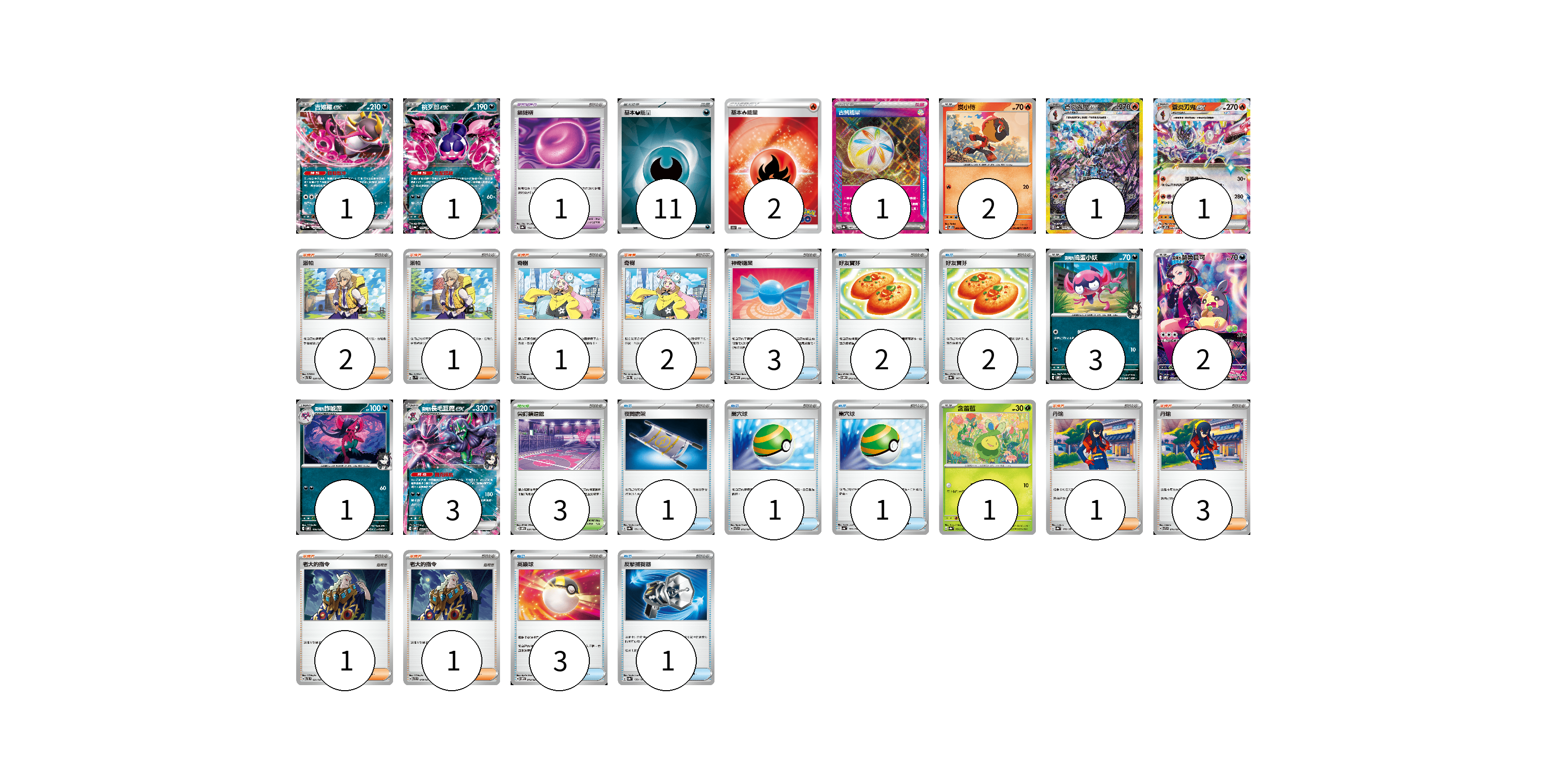 牌組構築方案 以此牌組為基礎新構築牌組 顯示卡面 顯示列表 寶可夢卡(16) 1 1 2 1 1 3 2 1 3 1 寶可夢道具(2) 1 1 物品卡(14) 3 2 2 1 1 1 3 1 支援者卡(11) 2 1 2 1 3 1 1 競技場卡(3) 3 能量卡(14) 11 2 1 寶可夢卡(16) 卡牌名稱 張數 卡牌名稱 張數 吉雉雞ex SV8a 104/187 01 桃歹郎ex SV8a 105/187 01 炭小侍 SVPS 005/008 02 蒼炎刃鬼ex SV8a 203/187 01 蒼炎刃鬼ex SVPS 006/008 01 <瑪俐的>搗蛋小妖 SVOM 005/021 03 <瑪俐的>莫魯貝可 SVOM 022/021 02 <瑪俐的>詐唬魔 SVOM 006/021 01 <瑪俐的>長毛巨魔ex SVOM 007/021 03 含羞苞 SV8a 001/187 01 寶可夢道具(2) 卡牌名稱 張數 卡牌名稱 張數 鎖鏈糬 SV8a 154/187 01 奇樹 SVTL 018/021 01 物品卡(14) 卡牌名稱 張數 卡牌名稱 張數 神奇糖果 SVOM 014/021 03 好友寶芬 SVOM 012/021 02 好友寶芬 SV8a 147/187 02 夜間擔架 SV8a 151/187 01 巢穴球 SVTR 013/021 01 巢穴球 SV4a 159/190 01 高級球 SVOM 013/021 03 反擊捕捉器 SV8a 139/187 01 支援者卡(11) 卡牌名稱 張數 卡牌名稱 張數 派帕 SVTL 020/021 02 派帕 SV1V 076/078 01 奇樹 SVEM 017/020 02 丹瑜 SV8a 170/187 01 丹瑜 SVTR 016/021 03 老大的指令 SVTL 021/021 01 老大的指令 SVTR 019/021 01 競技場卡(3) 卡牌名稱 張數 卡牌名稱 張數 尖釘鎮道館 SVOM 021/021 03 能量卡(14) 卡牌名稱 張數 卡牌名稱 張數 基本【惡】能量 SVOM DAR 11 基本火能量 S10b FIR 02 古舊能量 SV8a 187/187 01 以此牌組為基礎新構築牌組 牌組編碼 kcIJVK-jMICLt-PzUAFG copy 列印牌組單 牌組編碼已複製 分享至SNS