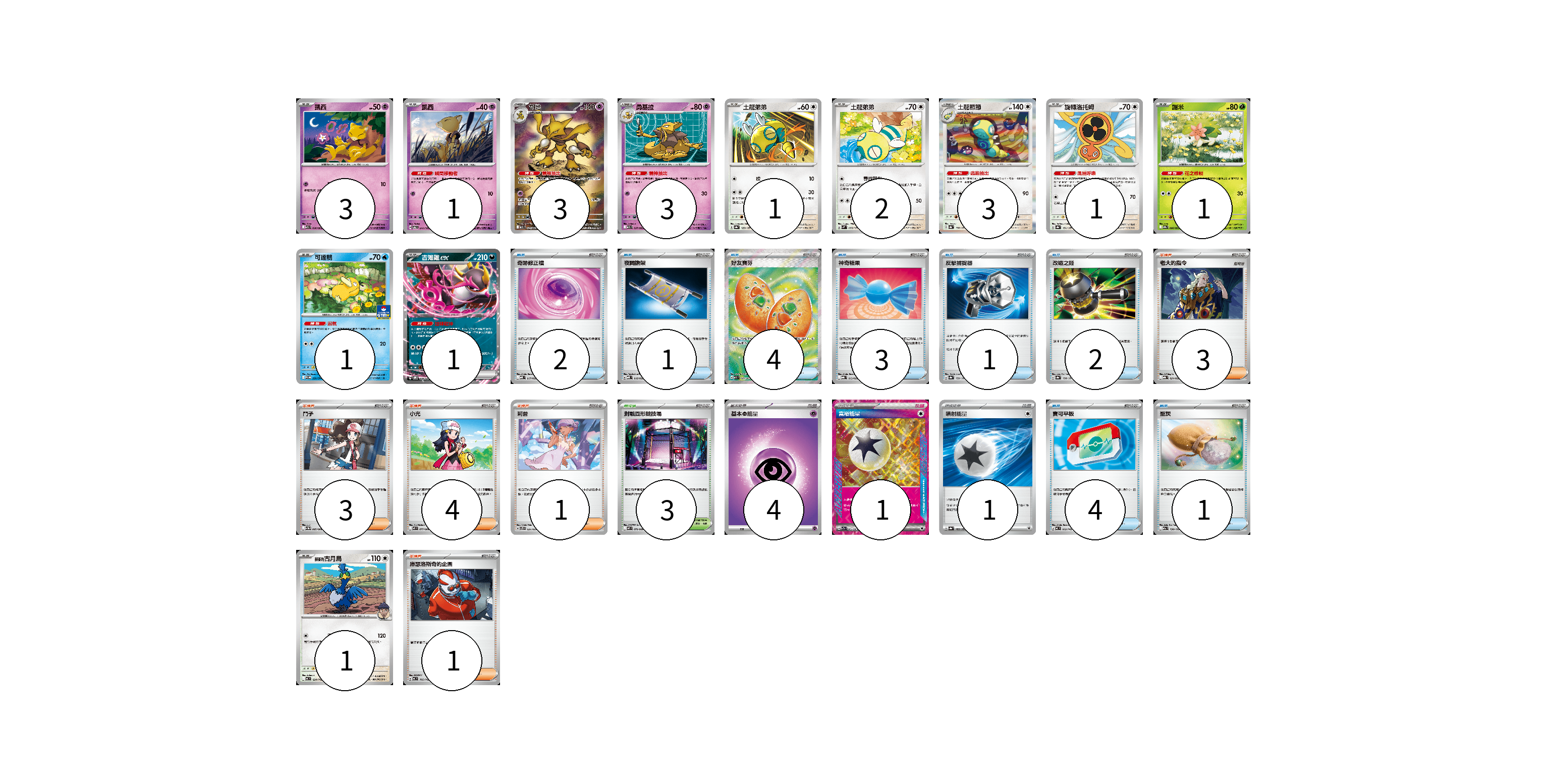 牌組構築方案 以此牌組為基礎新構築牌組 顯示卡面 顯示列表 寶可夢卡(21) 3 1 3 3 1 2 3 1 1 1 1 1 物品卡(18) 2 1 4 3 1 2 4 1 支援者卡(12) 3 3 4 1 1 競技場卡(3) 3 能量卡(6) 4 1 1 寶可夢卡(21) 卡牌名稱 張數 卡牌名稱 張數 凱西 M1S 036/063 03 凱西 SV6 047/101 01 胡地 M1S 071/063 03 勇基拉 M1S 037/063 03 土龍弟弟 SV8a 129/187 01 土龍弟弟 SVM 095/175 02 土龍節節 SV8a 130/187 03 旋轉洛托姆 SV8a 131/187 01 謝米 SV9a 006/063 01 可達鴨 SV-P 220/SV-P 01 吉雉雞ex SVOM 009/021 01 <赫普的>古月鳥 MC 624/742 01 物品卡(18) 卡牌名稱 張數 卡牌名稱 張數 奇跡修正檔 MBD 017/022 02 夜間擔架 MBD 016/022 01 好友寶芬 M1S 081/063 04 神奇糖果 MBG 013/022 03 反擊捕捉器 SV8a 139/187 01 改造之錘 SV8a 138/187 02 寶可平板 MC 662/742 04 聖灰 M2a 150/193 01 支援者卡(12) 卡牌名稱 張數 卡牌名稱 張數 老大的指令 MBG 021/022 03 鬥子 SV11W 085/086 03 小光 M2 077/080 04 莉普 SVTS 021/022 01 庫瑟洛斯奇的企圖 MC 705/742 01 競技場卡(3) 卡牌名稱 張數 卡牌名稱 張數 對戰圓形競技場 M2 079/080 03 能量卡(6) 卡牌名稱 張數 卡牌名稱 張數 基本【超】能量 MBD PSY 04 富裕能量 SV7a 064/064 01 噴射能量 SV8a 185/187 01 以此牌組為基礎新構築牌組 牌組編碼 keBCGn-fOardy-DuzAFe copy 列印牌組單 牌組編碼已複製 分享至SNS