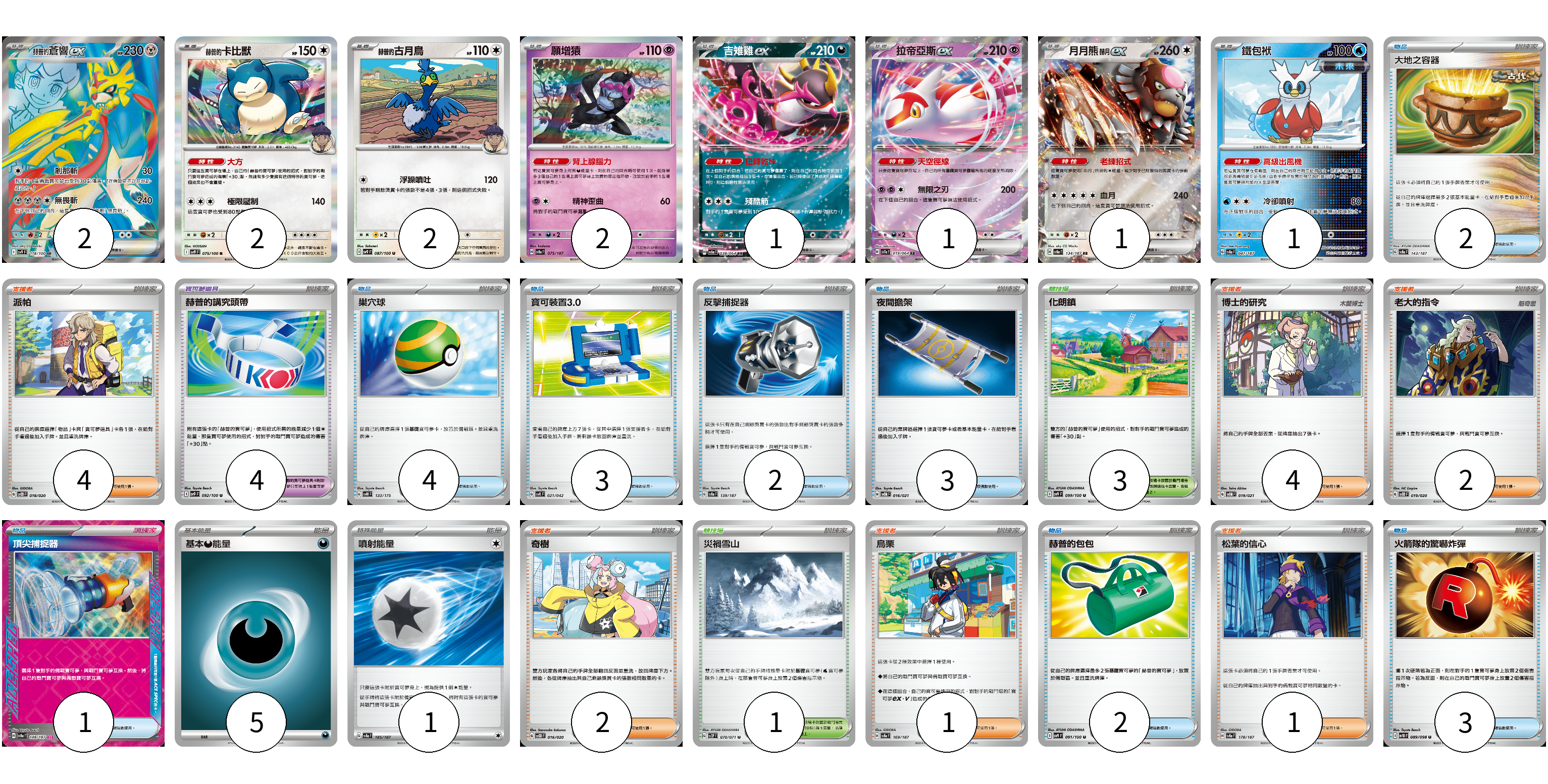 牌組構築方案 以此牌組為基礎新構築牌組 顯示卡面 顯示列表 寶可夢卡(12) 2 2 2 2 1 1 1 1 寶可夢道具(4) 4 物品卡(20) 2 4 3 2 3 1 2 3 支援者卡(14) 4 4 2 2 1 1 競技場卡(4) 3 1 能量卡(6) 5 1 寶可夢卡(12) 卡牌名稱 張數 卡牌名稱 張數 赫普的蒼響ex SV9 118/100 02 赫普的卡比獸 SV9 075/100 02 赫普的古月鳥 SV9 087/100 02 願增猿 SV8a 075/187 02 吉雉雞ex SV6a 038/064 01 拉帝亞斯ex SV7a 019/064 01 月月熊 赫月ex SV8a 134/187 01 鐵包袱 SV8a 047/187 01 寶可夢道具(4) 卡牌名稱 張數 卡牌名稱 張數 赫普的講究頭帶 SV9 092/100 04 物品卡(20) 卡牌名稱 張數 卡牌名稱 張數 大地之容器 SV8a 143/187 02 巢穴球 SVM 133/175 04 寶可裝置3.0 SVK 021/042 03 反擊捕捉器 SV8a 139/187 02 夜間擔架 SVOM 016/021 03 頂尖捕捉器 SV8a 148/187 01 赫普的包包 SV9 091/100 02 火箭隊的驚嚇炸彈 SV10 089/098 03 支援者卡(14) 卡牌名稱 張數 卡牌名稱 張數 派帕 SVOD 018/020 04 博士的研究 SVOM 019/021 04 老大的指令 SVOD 019/020 02 奇樹 SVOD 016/020 02 烏栗 SV8a 169/187 01 松葉的信心 SV8a 178/187 01 競技場卡(4) 卡牌名稱 張數 卡牌名稱 張數 化朗鎮 SV9 099/100 03 災禍雪山 SV2P 070/071 01 能量卡(6) 卡牌名稱 張數 卡牌名稱 張數 基本惡能量 sv-p DAR 05 噴射能量 SV8a 185/187 01 以此牌組為基礎新構築牌組 牌組編碼 keXWZe-TfCTEu-UHrrWT copy 列印牌組單 牌組編碼已複製 分享至SNS