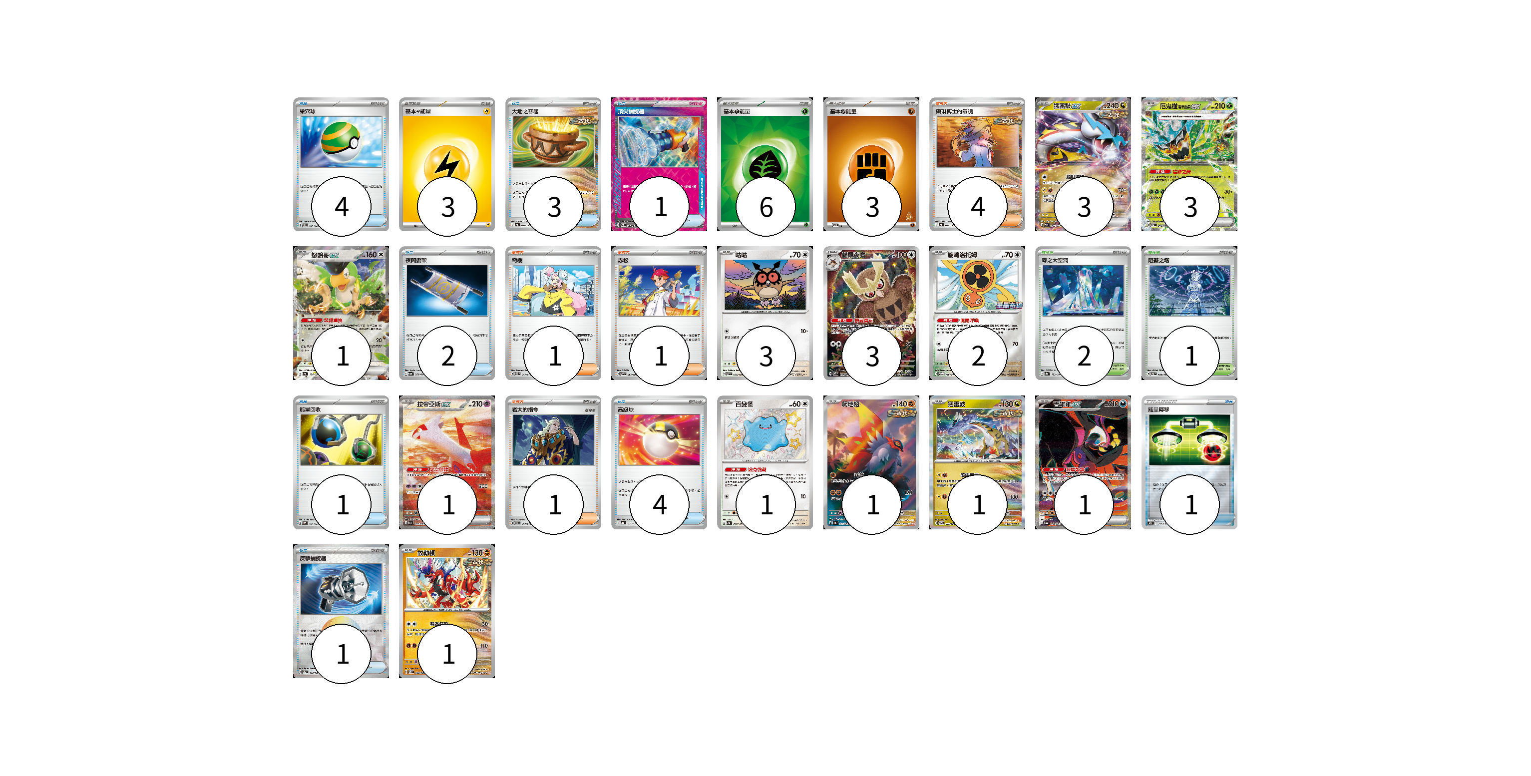 牌組構築方案 以此牌組為基礎新構築牌組 顯示卡面 顯示列表 寶可夢卡(21) 3 3 1 3 3 2 1 1 1 1 1 1 物品卡(17) 4 3 1 2 1 4 1 1 支援者卡(7) 4 1 1 1 競技場卡(3) 2 1 能量卡(12) 3 6 3 寶可夢卡(21) 卡牌名稱 張數 卡牌名稱 張數 猛雷鼓ex SV5K 053/071 03 厄鬼椪 碧草面具ex SV6 016/101 03 怒鸚哥ex SV4a 154/190 01 咕咕 SV7 076/102 03 貓頭夜鷹 SV7 114/102 03 旋轉洛托姆 SV-P 146/SV-P 02 拉帝亞斯ex SV7a 087/064 01 百變怪 SV4a 309/190 01 爬地翅 SV4K 074/066 01 猛雷鼓 SV7 075/102 01 吉雉雞ex SV6a 089/064 01 故勒頓 SV8 069/106 01 物品卡(17) 卡牌名稱 張數 卡牌名稱 張數 巢穴球 SVEL 011/020 04 大地之容器 SV4K 060/066 03 頂尖捕捉器 SV5M 062/071 01 夜間擔架 SV6a 056/064 02 能量回收 SVAW 011/023 01 高級球 SVHK 013/022 04 能量轉移 SO 017/030 01 反擊捕捉器 SV8a 139/187 01 支援者卡(7) 卡牌名稱 張數 卡牌名稱 張數 奧琳博士的氣魄 SV4K 064/066 04 奇樹 SVTG 017/019 01 赤松 SV7 097/102 01 老大的指令 SVTH 017/018 01 競技場卡(3) 卡牌名稱 張數 卡牌名稱 張數 零之大空洞 SV8a 182/187 02 阻礙之塔 SV6 100/101 01 能量卡(12) 卡牌名稱 張數 卡牌名稱 張數 基本【雷】能量 SVF LIG 03 基本【草】能量 SVK GRA 06 基本【鬥】能量 SVI FIG 03 以此牌組為基礎新構築牌組 牌組編碼 keYlct-MTeQHD-YZJkKa copy 列印牌組單 牌組編碼已複製 分享至SNS