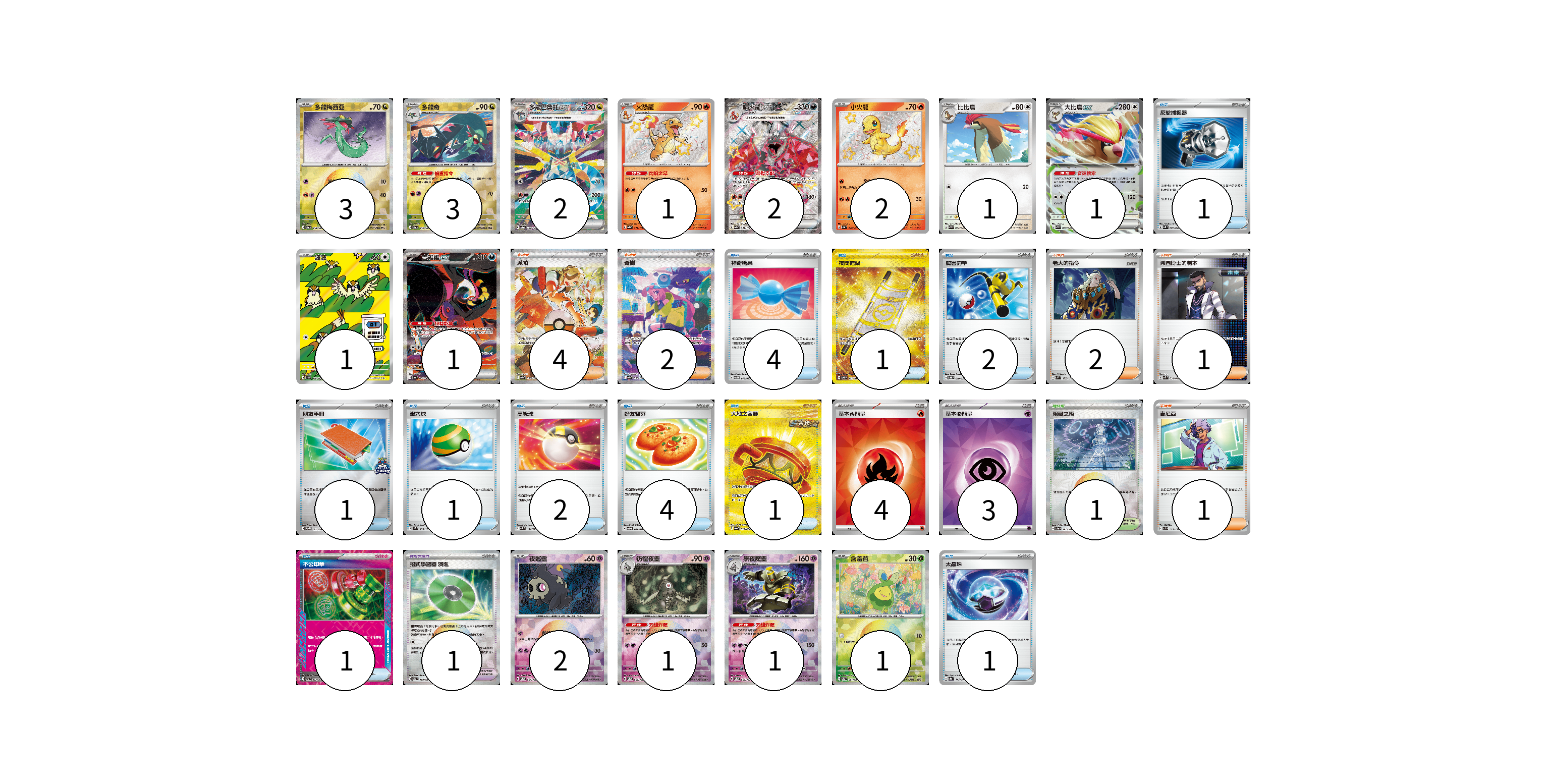 牌組構築方案 以此牌組為基礎新構築牌組 顯示卡面 顯示列表 寶可夢卡(22) 3 3 2 1 2 2 1 1 1 1 2 1 1 1 寶可夢道具(1) 1 物品卡(19) 1 4 1 2 1 1 2 4 1 1 1 支援者卡(10) 4 2 2 1 1 競技場卡(1) 1 能量卡(7) 4 3 寶可夢卡(22) 卡牌名稱 張數 卡牌名稱 張數 多龍梅西亞 SV8a 118/187 03 多龍奇 SV8a 119/187 03 多龍巴魯托ex SV8a 221/187 02 火恐龍 SV4a 211/190 01 噴火龍ex SV4a 331/190 02 小火龍 SV4a 210/190 02 比比鳥 SVK 004/042 01 大比鳥ex SVK 005/042 01 波波 SV3 118/108 01 吉雉雞ex SV6a 089/064 01 夜巡靈 SV8a 064/187 02 彷徨夜靈 SV8a 065/187 01 黑夜魔靈 SV8a 066/187 01 含羞苞 SV8a 001/187 01 寶可夢道具(1) 卡牌名稱 張數 卡牌名稱 張數 招式學習器 演進 SV8a 160/187 01 物品卡(19) 卡牌名稱 張數 卡牌名稱 張數 反擊捕捉器 SVK 009/042 01 神奇糖果 SVTM 013/022 04 夜間擔架 SV8 137/106 01 厲害釣竿 SVOD 010/020 02 朋友手冊 SV-P 182/SV-P 01 巢穴球 SVM 133/175 01 高級球 SVM 134/175 02 好友寶芬 SVOD 011/020 04 大地之容器 SV6a 093/064 01 不公印章 SV5a 053/066 01 太晶珠 SV8a 145/187 01 支援者卡(10) 卡牌名稱 張數 卡牌名稱 張數 派帕 SV4a 353/190 04 奇樹 SV4a 350/190 02 老大的指令 SVM 172/175 02 弗圖博士的劇本 SVK 034/042 01 吉尼亞 SVD 129/139 01 競技場卡(1) 卡牌名稱 張數 卡牌名稱 張數 阻礙之塔 SV8a 181/187 01 能量卡(7) 卡牌名稱 張數 卡牌名稱 張數 基本【火】能量 SVM FIR 04 基本【超】能量 SVM PSY 03 以此牌組為基礎新構築牌組 牌組編碼 kfhLkK-YPAqmB-mzaYic copy 列印牌組單 牌組編碼已複製 分享至SNS