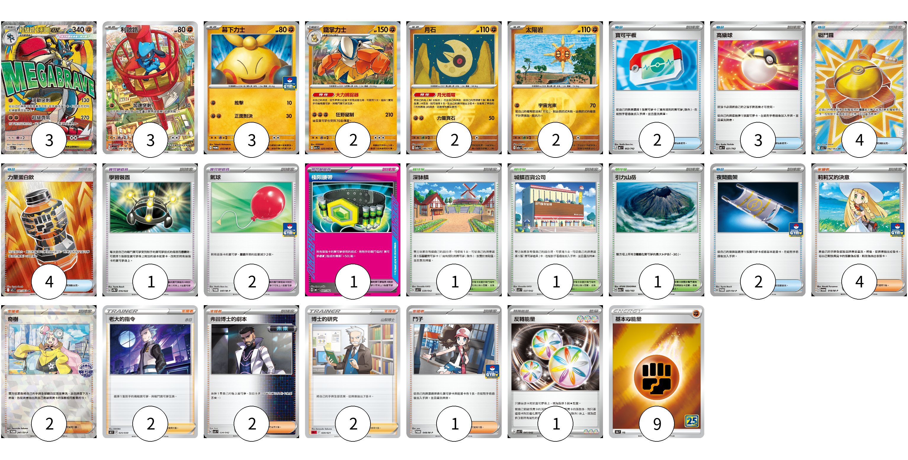 牌組構築方案 以此牌組為基礎新構築牌組 顯示卡面 顯示列表 寶可夢卡(15) 3 3 3 2 2 2 寶可夢道具(4) 1 2 1 物品卡(15) 2 3 4 4 2 支援者卡(13) 4 2 2 2 2 1 競技場卡(3) 1 1 1 能量卡(10) 1 9 寶可夢卡(15) 卡牌名稱 張數 卡牌名稱 張數 超級路卡利歐ex M2a 228/193 03 利歐路 M1L 068/063 03 幕下力士 M-P 015/M-P 03 鐵掌力士 M1L 025/063 02 月石 M2a 086/193 02 太陽岩 M2a 087/193 02 寶可夢道具(4) 卡牌名稱 張數 卡牌名稱 張數 學習裝置 SVTM 016/022 01 氣球 M-P 047/M-P 02 極限腰帶 MC 691/742 01 物品卡(15) 卡牌名稱 張數 卡牌名稱 張數 寶可平板 MC 662/742 02 高級球 MC 651/742 03 戰鬥鑼 M1L 082/063 04 力量蛋白飲 M1L 081/063 04 夜間擔架 SV-P 227/SV-P 02 支援者卡(13) 卡牌名稱 張數 卡牌名稱 張數 莉莉艾的決意 M-P 018/M-P 04 奇樹 SV-P 247/SV-P 02 老大的指令(赤日) SK 025/030 02 弗圖博士的劇本 SVK 034/042 02 博士的研究(山梨博士) SDL 020/021 02 鬥子 M-P 048/M-P 01 競技場卡(3) 卡牌名稱 張數 卡牌名稱 張數 深缽鎮 SVK 039/042 01 城鎮百貨公司 SVK 037/042 01 引力山岳 M2a 183/193 01 能量卡(10) 卡牌名稱 張數 卡牌名稱 張數 反轉能量 SVK 041/042 01 基本鬥能量 S8a FIG 09 以此牌組為基礎新構築牌組 牌組編碼 kgSZBa-JBuNKk-VkvnMe copy 列印牌組單 牌組編碼已複製 分享至SNS