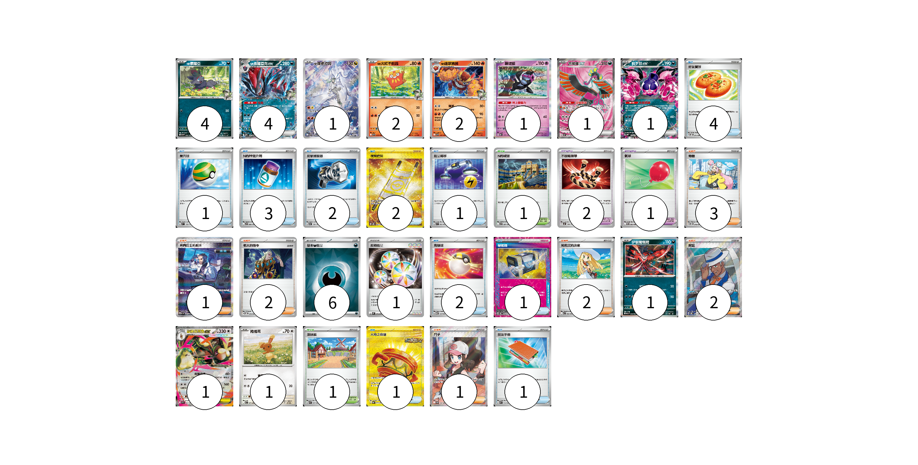 牌組構築方案 以此牌組為基礎新構築牌組 顯示卡面 顯示列表 寶可夢卡(19) 4 4 1 2 2 1 1 1 1 1 1 寶可夢道具(3) 2 1 物品卡(18) 4 1 3 2 2 1 2 1 1 1 支援者卡(11) 3 1 2 2 2 1 競技場卡(2) 1 1 能量卡(7) 6 1 寶可夢卡(19) 卡牌名稱 張數 卡牌名稱 張數 N的索羅亞 SV9 060/100 04 N的索羅亞克ex SV9 061/100 04 N的萊希拉姆 SV9 109/100 01 N的火紅不倒翁 SV9 015/100 02 N的達摩狒狒 SV9 016/100 02 願增猿 SV8a 075/187 01 吉雉雞ex SV6a 081/064 01 桃歹郎ex SV8a 105/187 01 伊裴爾塔爾 M1L 040/063 01 超級長耳兔ex M2 072/080 01 捲捲耳 M2 071/080 01 寶可夢道具(3) 卡牌名稱 張數 卡牌名稱 張數 不服輸頭帶 SV4a 168/190 02 氣球 SV11B 082/086 01 物品卡(18) 卡牌名稱 張數 卡牌名稱 張數 好友寶芬 SVOD 011/020 04 巢穴球 SVM 133/175 01 N的PP提升劑 SV9 089/100 03 反擊捕捉器 SV8a 139/187 02 夜間擔架 SV8 137/106 02 能量轉移 SVK 008/042 01 高級球 SVQP 015/023 02 秘密箱 SV6 092/101 01 大地之容器 SV6a 093/064 01 朋友手冊 SVK 014/042 01 支援者卡(11) 卡牌名稱 張數 卡牌名稱 張數 奇樹 SVOM 018/021 03 弗圖博士的劇本 SV4M 091/066 01 老大的指令 SVOD 019/020 02 莉莉艾的決意 M1L 062/063 02 席藍 SV8 127/106 02 鬥子 SV11W 166/086 01 競技場卡(2) 卡牌名稱 張數 卡牌名稱 張數 N的城堡 SV9 097/100 01 深缽鎮 SVK 039/042 01 能量卡(7) 卡牌名稱 張數 卡牌名稱 張數 基本【惡】能量 SVOM DAR 06 反轉能量 SV2P 071/071 01 以此牌組為基礎新構築牌組 牌組編碼 khYNxH-WxBivB-dYilfX copy 列印牌組單 牌組編碼已複製 分享至SNS
