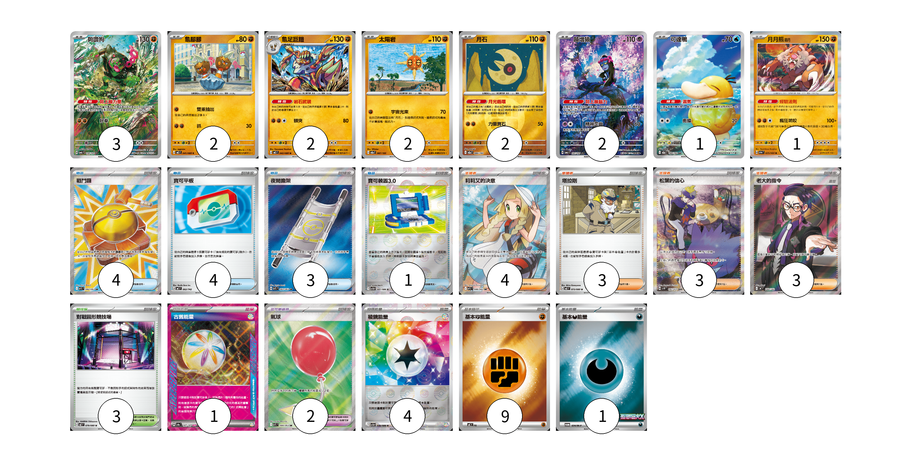 牌組構築方案 以此牌組為基礎新構築牌組 顯示卡面 顯示列表 寶可夢卡(15) 3 2 2 2 2 2 1 1 寶可夢道具(2) 2 物品卡(12) 4 4 3 1 支援者卡(13) 4 3 3 3 競技場卡(3) 3 能量卡(15) 1 4 9 1 寶可夢卡(15) 卡牌名稱 張數 卡牌名稱 張數 夠讚狗 SV6 110/101 03 龜腳腳 M3 041/080 02 龜足巨鎧 M3 042/080 02 太陽岩 M2a 087/193 02 月石 M2a 086/193 02 願增猿 SV6 107/101 02 可達鴨 M2a 199/193 01 月月熊 赫月 SV6a 025/064 01 寶可夢道具(2) 卡牌名稱 張數 卡牌名稱 張數 氣球 M1L 084/063 02 物品卡(12) 卡牌名稱 張數 卡牌名稱 張數 戰鬥鑼 M1L 082/063 04 寶可平板 MC 662/742 04 夜間擔架 M1L 083/063 03 寶可裝置3.0 SV11B 081/086 01 支援者卡(13) 卡牌名稱 張數 卡牌名稱 張數 莉莉艾的決意 M1L 086/063 04 塔拉剛 M3 073/080 03 松葉的信心 SV5K 097/071 03 老大的指令(烏羽) MC 760/742 03 競技場卡(3) 卡牌名稱 張數 卡牌名稱 張數 對戰圓形競技場 M2 079/080 03 能量卡(15) 卡牌名稱 張數 卡牌名稱 張數 古舊能量 SV8a 187/187 01 稜鏡能量 SV11B 086/086 04 基本【鬥】能量 MC FIG 09 基本【惡】能量 M-P 034/M-P 01 以此牌組為基礎新構築牌組 牌組編碼 kjPaFB-CivMHi-piLwzR copy 列印牌組單 牌組編碼已複製 分享至SNS