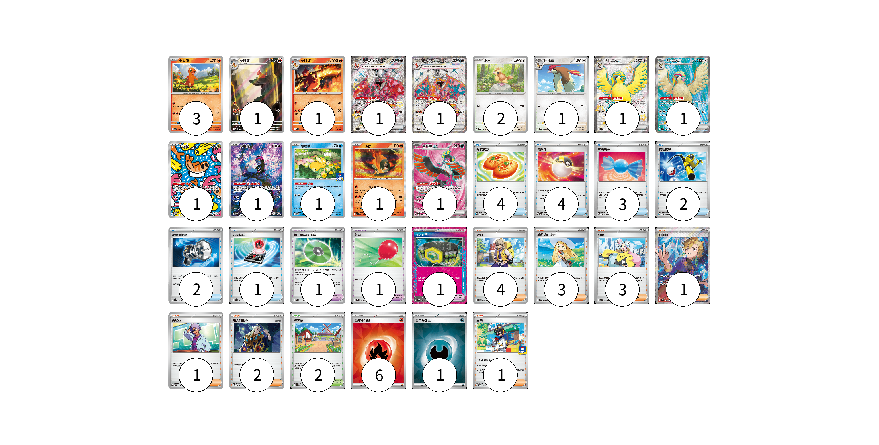 牌組構築方案 以此牌組為基礎新構築牌組 顯示卡面 顯示列表 寶可夢卡(17) 3 1 1 1 1 2 1 1 1 1 1 1 1 1 寶可夢道具(3) 1 1 1 物品卡(16) 4 4 3 2 2 1 支援者卡(15) 4 3 3 1 1 2 1 競技場卡(2) 2 能量卡(7) 6 1 寶可夢卡(17) 卡牌名稱 張數 卡牌名稱 張數 小火龍 SVTL 001/021 03 火恐龍 SV2a 169/165 01 火恐龍 SV2a 005/165 01 噴火龍ex SV4a 331/190 01 噴火龍ex SV3 125/108 01 波波 SV3 087/108 02 比比鳥 SVK 004/042 01 大比鳥ex SV4a 335/190 01 大比鳥ex SV3 128/108 01 米立龍 SV6 112/101 01 願增猿 SV6 107/101 01 可達鴨 SV-P 220/SV-P 01 古玉魚 SV4K 016/066 01 吉雉雞ex SV6a 081/064 01 寶可夢道具(3) 卡牌名稱 張數 卡牌名稱 張數 招式學習器 演進 SV8a 160/187 01 氣球 SV11B 082/086 01 極限腰帶 SV8a 159/187 01 物品卡(16) 卡牌名稱 張數 卡牌名稱 張數 好友寶芬 SVOD 011/020 04 高級球 SVQL 015/022 04 神奇糖果 SVOD 013/020 03 厲害釣竿 SVOD 010/020 02 反擊捕捉器 SV8a 139/187 02 能量輸送 SVM 128/175 01 支援者卡(15) 卡牌名稱 張數 卡牌名稱 張數 派帕 SVOD 018/020 04 莉莉艾的決意 M1L 062/063 03 奇樹 SVOD 016/020 03 白蕾雅 SV7 126/102 01 吉尼亞 SVD 129/139 01 老大的指令 SVOD 019/020 02 烏栗 SV-P 229/SV-P 01 競技場卡(2) 卡牌名稱 張數 卡牌名稱 張數 深缽鎮 SVK 039/042 02 能量卡(7) 卡牌名稱 張數 卡牌名稱 張數 基本【火】能量 SVQL FIR 06 基本【惡】能量 SVOM DAR 01 以此牌組為基礎新構築牌組 牌組編碼 klrxOs-akQhFC-sKfsLn copy 列印牌組單 牌組編碼已複製 分享至SNS