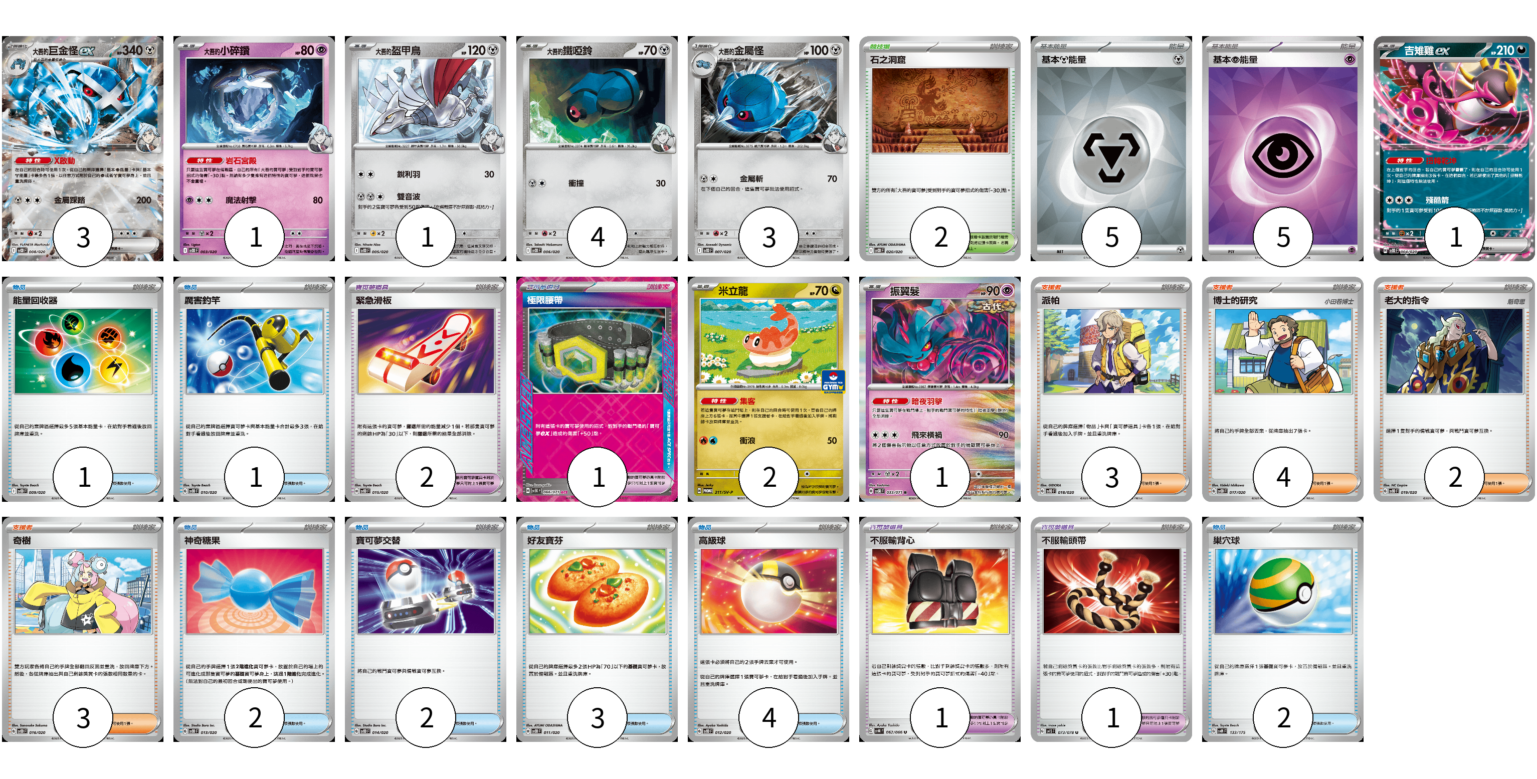 牌組構築方案 以此牌組為基礎新構築牌組 顯示卡面 顯示列表 寶可夢卡(16) 3 1 1 4 3 1 2 1 寶可夢道具(5) 2 1 1 1 物品卡(15) 1 1 2 2 3 4 2 支援者卡(12) 3 4 2 3 競技場卡(2) 2 能量卡(10) 5 5 寶可夢卡(16) 卡牌名稱 張數 卡牌名稱 張數 <大吾的>巨金怪ex SVOD 008/020 03 <大吾的>小碎鑽 SVOD 003/020 01 <大吾的>盔甲鳥 SVOD 005/020 01 <大吾的>鐵啞鈴 SVOD 006/020 04 <大吾的>金屬怪 SVOD 007/020 03 吉雉雞ex SVOD 004/020 01 米立龍 SV-P 211/SV-P 02 振翼髮 SV5K 033/071 01 寶可夢道具(5) 卡牌名稱 張數 卡牌名稱 張數 緊急滑板 SVOD 015/020 02 極限腰帶 SV5K 066/071 01 不服輸背心 SV4K 062/066 01 不服輸頭帶 SV1S 073/078 01 物品卡(15) 卡牌名稱 張數 卡牌名稱 張數 能量回收器 SVOD 009/020 01 厲害釣竿 SVOD 010/020 01 神奇糖果 SVOD 013/020 02 寶可夢交替 SVOD 014/020 02 好友寶芬 SVOD 011/020 03 高級球 SVOD 012/020 04 巢穴球 SVM 133/175 02 支援者卡(12) 卡牌名稱 張數 卡牌名稱 張數 派帕 SVOD 018/020 03 博士的研究 SVOD 017/020 04 老大的指令 SVOD 019/020 02 奇樹 SVOD 016/020 03 競技場卡(2) 卡牌名稱 張數 卡牌名稱 張數 石之洞窟 SVOD 020/020 02 能量卡(10) 卡牌名稱 張數 卡牌名稱 張數 基本【鋼】能量 SVOD MET 05 基本【超】能量 SVOD PSY 05 以此牌組為基礎新構築牌組 牌組編碼 kmTvAS-xGsTZU-tiPYyp copy 列印牌組單 牌組編碼已複製 分享至SNS