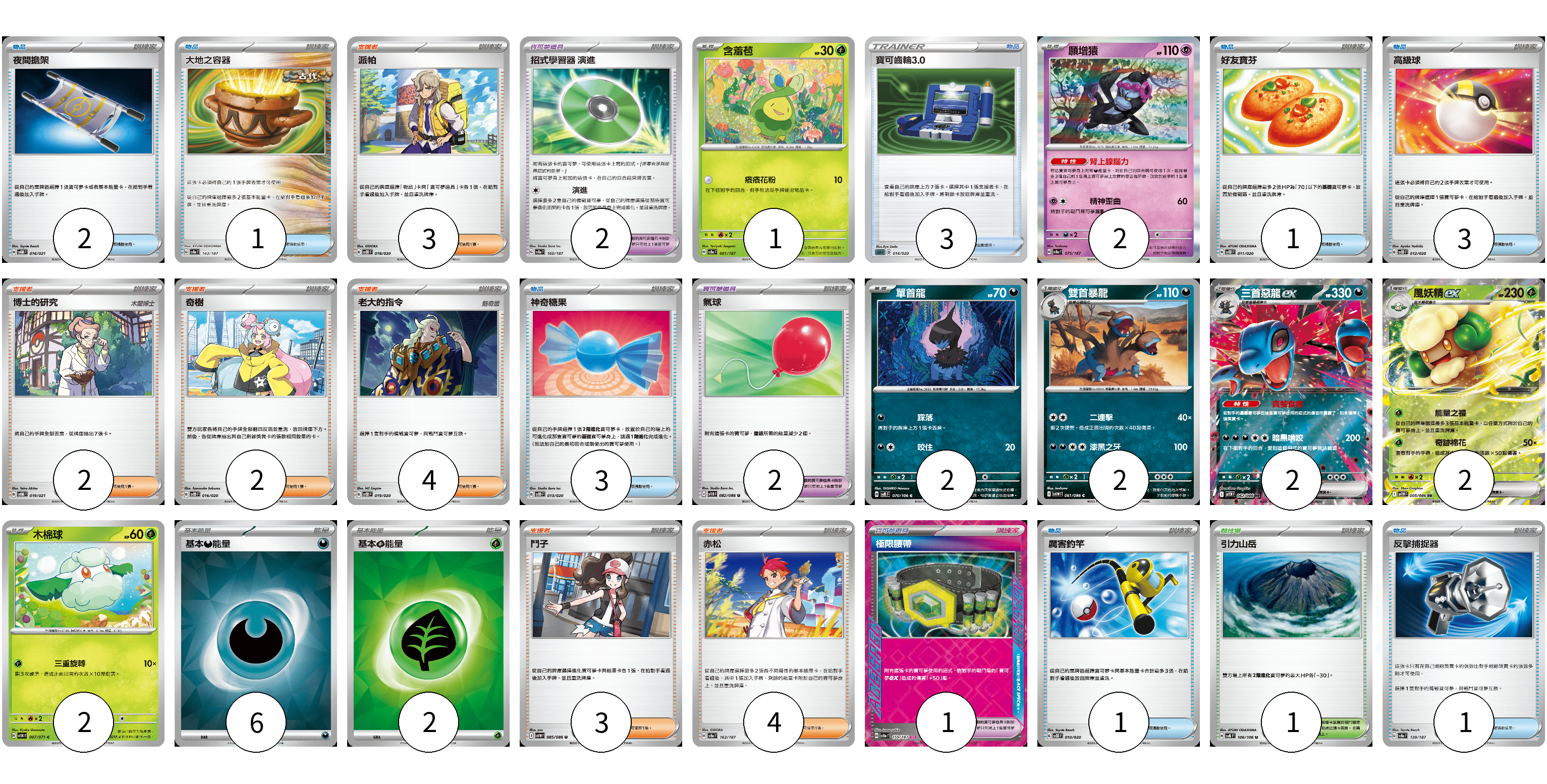 牌組構築方案 以此牌組為基礎新構築牌組 顯示卡面 顯示列表 寶可夢卡(13) 1 2 2 2 2 2 2 寶可夢道具(5) 2 2 1 物品卡(15) 2 1 3 1 3 3 1 1 支援者卡(18) 3 2 2 4 3 4 競技場卡(1) 1 能量卡(8) 6 2 寶可夢卡(13) 卡牌名稱 張數 卡牌名稱 張數 含羞苞 SV8a 001/187 01 願增猿 SV8a 075/187 02 單首龍 SV8 070/106 02 雙首暴龍 SV11W 061/086 02 三首惡龍ex SV11W 062/086 02 風妖精ex SV11W 005/086 02 木棉球 SV5K 007/071 02 寶可夢道具(5) 卡牌名稱 張數 卡牌名稱 張數 招式學習器 演進 SV8a 160/187 02 氣球 SV11B 082/086 02 極限腰帶 SV8a 159/187 01 物品卡(15) 卡牌名稱 張數 卡牌名稱 張數 夜間擔架 SVOM 016/021 02 大地之容器 SV8a 143/187 01 寶可齒輪3.0 SLD 014/020 03 好友寶芬 SVOD 011/020 01 高級球 SVOD 012/020 03 神奇糖果 SVOD 013/020 03 厲害釣竿 SVOD 010/020 01 反擊捕捉器 SV8a 139/187 01 支援者卡(18) 卡牌名稱 張數 卡牌名稱 張數 派帕 SVOD 018/020 03 博士的研究 SVOM 019/021 02 奇樹 SVOD 016/020 02 老大的指令 SVOD 019/020 04 鬥子 SV11W 085/086 03 赤松 SV8a 163/187 04 競技場卡(1) 卡牌名稱 張數 卡牌名稱 張數 引力山岳 SV8 106/106 01 能量卡(8) 卡牌名稱 張數 卡牌名稱 張數 基本【惡】能量 SVOM DAR 06 基本【草】能量 SVM GRA 02 以此牌組為基礎新構築牌組 牌組編碼 kqClBa-QmbysL-OmZbxU copy 列印牌組單 牌組編碼已複製 分享至SNS