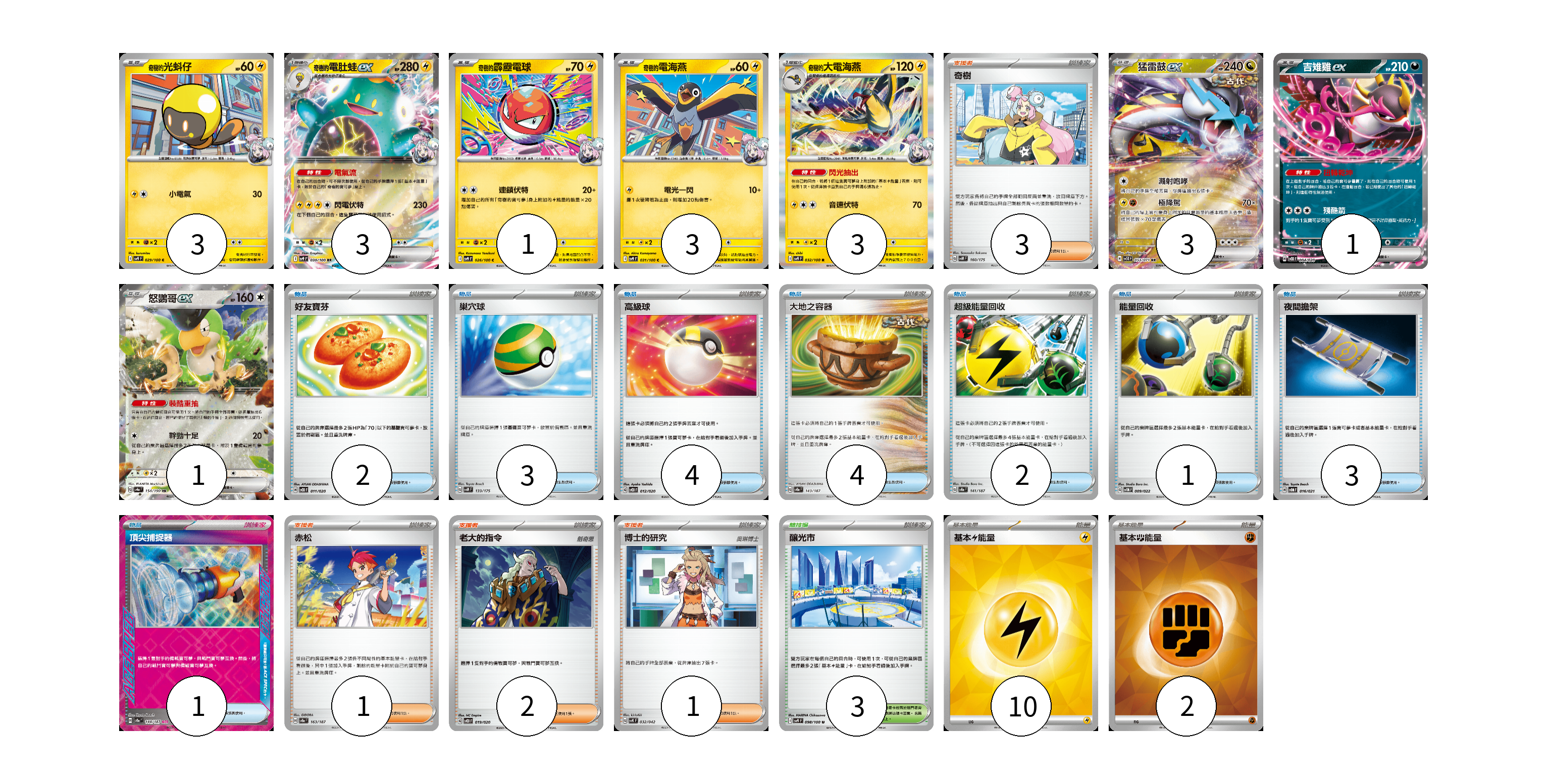 牌組構築方案 以此牌組為基礎新構築牌組 顯示卡面 顯示列表 寶可夢卡(18) 3 3 1 3 3 3 1 1 物品卡(20) 2 3 4 4 2 1 3 1 支援者卡(7) 3 1 2 1 競技場卡(3) 3 能量卡(12) 10 2 寶可夢卡(18) 卡牌名稱 張數 卡牌名稱 張數 奇樹的光蚪仔 SV9 029/100 03 奇樹的電肚蛙ex SV9 030/100 03 奇樹的霹靂電球 SV9 026/100 01 奇樹的電海燕 SV9 031/100 03 奇樹的大電海燕 SV9 032/100 03 猛雷鼓ex SV5K 053/071 03 吉雉雞ex SVOD 004/020 01 怒鸚哥ex SV4a 154/190 01 物品卡(20) 卡牌名稱 張數 卡牌名稱 張數 好友寶芬 SVOD 011/020 02 巢穴球 SVM 133/175 03 高級球 SVOD 012/020 04 大地之容器 SV8a 143/187 04 超級能量回收 SV8a 141/187 02 能量回收 SVTM 009/022 01 夜間擔架 SVOM 016/021 03 頂尖捕捉器 SV8a 148/187 01 支援者卡(7) 卡牌名稱 張數 卡牌名稱 張數 奇樹 SVM 160/175 03 赤松 SV8a 163/187 01 老大的指令 SVOD 019/020 02 博士的研究 SVK 032/042 01 競技場卡(3) 卡牌名稱 張數 卡牌名稱 張數 釀光市 SV9 098/100 03 能量卡(12) 卡牌名稱 張數 卡牌名稱 張數 基本【雷】能量 SVK LIG 10 基本【鬥】能量 SVK FIG 02 以此牌組為基礎新構築牌組 牌組編碼 kvgyah-QUhIri-UnpUYR copy 列印牌組單 牌組編碼已複製 分享至SNS