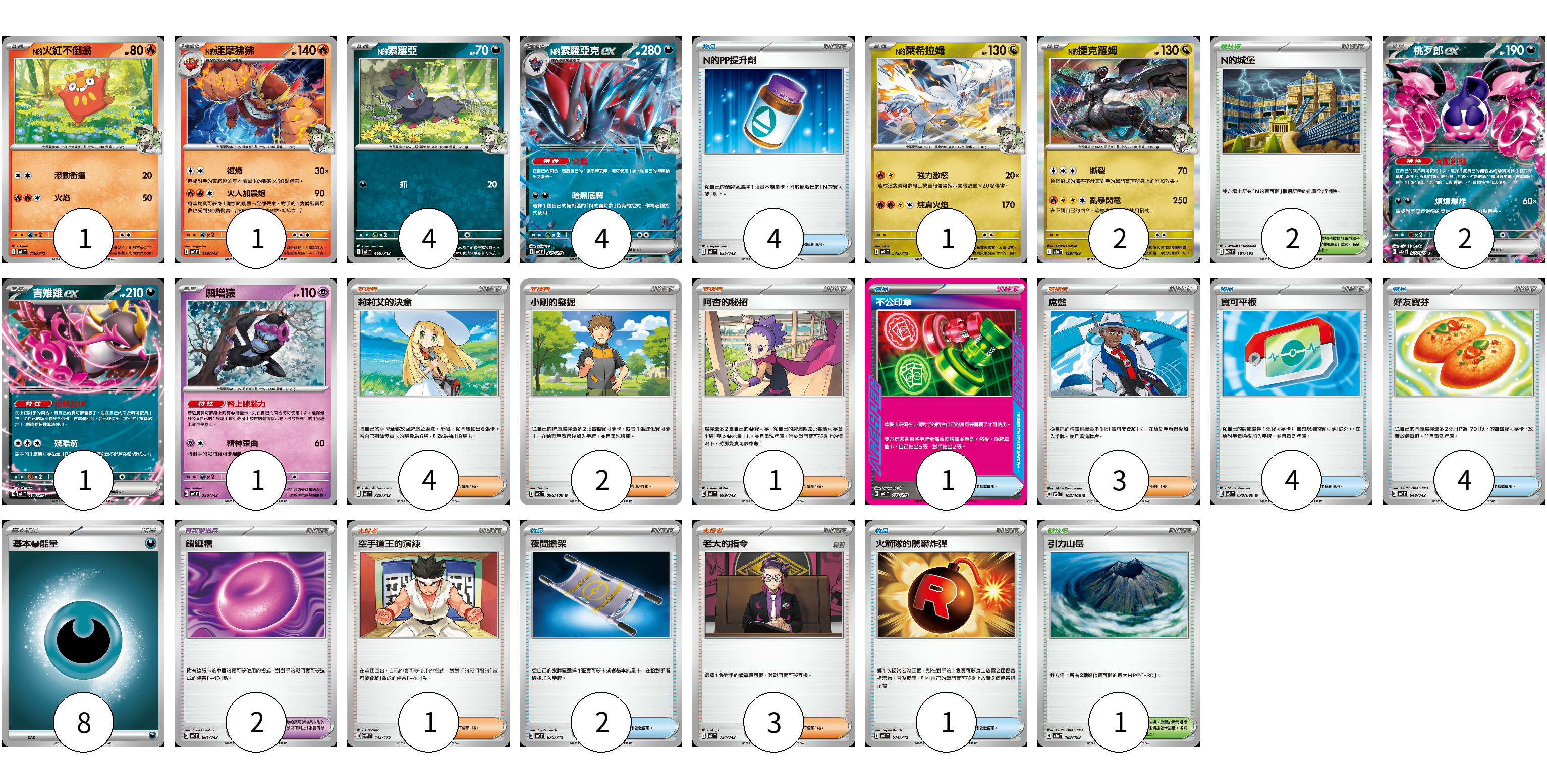 牌組構築方案 以此牌組為基礎新構築牌組 顯示卡面 顯示列表 寶可夢卡(17) 1 1 4 4 1 2 2 1 1 寶可夢道具(2) 2 物品卡(16) 4 1 4 4 2 1 支援者卡(14) 4 2 1 3 1 3 競技場卡(3) 2 1 能量卡(8) 8 寶可夢卡(17) 卡牌名稱 張數 卡牌名稱 張數 N的火紅不倒翁 MC 118/742 01 N的達摩狒狒 MC 119/742 01 <N的>索羅亞 MC 469/742 04 <N的>索羅亞克ex MC 470/742 04 <N的>萊希拉姆 MC 545/742 01 N的捷克羅姆 M2a 129/193 02 桃歹郎ex SV8a 105/187 02 吉雉雞ex MC 489/742 01 願增猿 MC 358/742 01 寶可夢道具(2) 卡牌名稱 張數 卡牌名稱 張數 鎖鏈糬 MC 681/742 02 物品卡(16) 卡牌名稱 張數 卡牌名稱 張數 N的PP提升劑 MC 635/742 04 不公印章 MC 633/742 01 寶可平板 M3 070/080 04 好友寶芬 MC 648/742 04 夜間擔架 MC 670/742 02 火箭隊的驚嚇炸彈 MC 674/742 01 支援者卡(14) 卡牌名稱 張數 卡牌名稱 張數 莉莉艾的決意 MC 729/742 04 小剛的發掘 SV9 096/100 02 阿杏的秘招 MC 699/742 01 席藍 SV8 102/106 03 空手道王的演練 SVM 143/175 01 老大的指令 MC 724/742 03 競技場卡(3) 卡牌名稱 張數 卡牌名稱 張數 N的城堡 M2a 181/193 02 引力山岳 M2a 183/193 01 能量卡(8) 卡牌名稱 張數 卡牌名稱 張數 基本【惡】能量 MC DAR 08 以此牌組為基礎新構築牌組 牌組編碼 kwihKh-ucRtdw-JUNYgi copy 列印牌組單 牌組編碼已複製 分享至SNS
