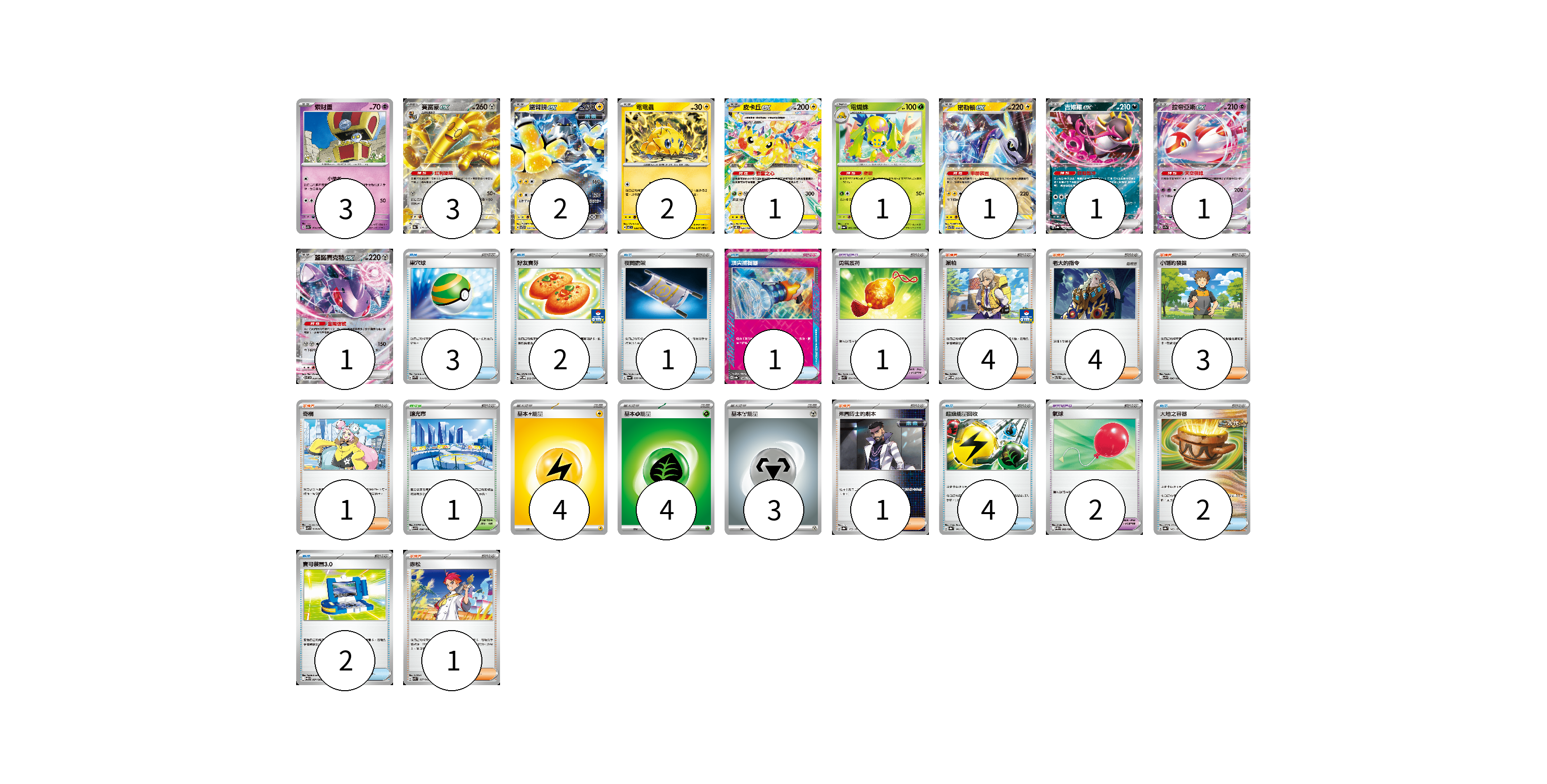 牌組構築方案 以此牌組為基礎新構築牌組 顯示卡面 顯示列表 寶可夢卡(16) 3 3 2 2 1 1 1 1 1 1 寶可夢道具(3) 1 2 物品卡(15) 3 2 1 1 4 2 2 支援者卡(14) 4 4 3 1 1 1 競技場卡(1) 1 能量卡(11) 4 4 3 寶可夢卡(16) 卡牌名稱 張數 卡牌名稱 張數 索財靈 SV7a 024/064 03 賽富豪ex SV8a 117/187 03 鐵臂膀ex SVTR 007/021 02 電電蟲 SV7 032/102 02 皮卡丘ex SV8 033/106 01 電蜘蛛 SV6a 002/064 01 密勒頓ex SVTR 008/021 01 吉雉雞ex SV8a 104/187 01 拉帝亞斯ex SV7a 019/064 01 蓋諾賽克特ex SV11B 069/086 01 寶可夢道具(3) 卡牌名稱 張數 卡牌名稱 張數 勇氣護符 SVK 024/042 01 氣球 SV11B 082/086 02 物品卡(15) 卡牌名稱 張數 卡牌名稱 張數 巢穴球 SVAW 014/023 03 好友寶芬 SV-P 212/SV-P 02 夜間擔架 SV6a 056/064 01 頂尖捕捉器 SV8a 148/187 01 超級能量回收 SV8a 141/187 04 大地之容器 SV8a 143/187 02 寶可裝置3.0 SV11B 081/086 02 支援者卡(14) 卡牌名稱 張數 卡牌名稱 張數 派帕 SV-P 213/SV-P 04 老大的指令 SVTL 021/021 04 小剛的發掘 SV9 096/100 03 奇樹 SVHM 018/022 01 弗圖博士的劇本 SV8a 175/187 01 赤松 SVK 027/042 01 競技場卡(1) 卡牌名稱 張數 卡牌名稱 張數 釀光市 SV9 098/100 01 能量卡(11) 卡牌名稱 張數 卡牌名稱 張數 基本雷能量 sv-p LIG 04 基本草能量 sv-p GRA 04 基本鋼能量 sv-p MET 03 以此牌組為基礎新構築牌組 牌組編碼 kxAMjg-CSTmDK-OpyViN copy 列印牌組單 牌組編碼已複製 分享至SNS