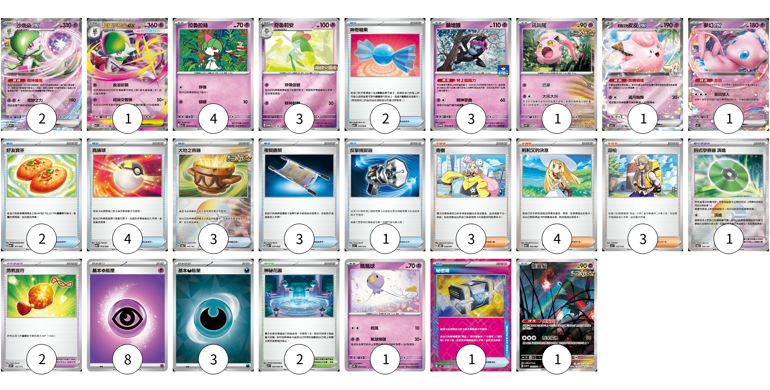 牌組構築方案 以此牌組為基礎新構築牌組 顯示卡面 顯示列表 寶可夢卡(18) 2 1 4 3 3 1 1 1 1 1 寶可夢道具(3) 1 2 物品卡(16) 2 2 4 3 3 1 1 支援者卡(10) 3 4 3 競技場卡(2) 2 能量卡(11) 8 3 寶可夢卡(18) 卡牌名稱 張數 卡牌名稱 張數 沙奈朵ex SVTS 004/022 02 超級沙奈朵ex M1S 042/063 01 拉魯拉絲 M1S 040/063 04 奇魯莉安 M-P 006/M-P 03 願增猿 M-P 014/M-P 03 吼叫尾 SVTS 007/022 01 莉莉艾的皮皮ex SV9 033/100 01 夢幻ex SVK 001/042 01 飄飄球 SVTS 005/022 01 振翼髮 SV5K 076/071 01 寶可夢道具(3) 卡牌名稱 張數 卡牌名稱 張數 招式學習器 演進 SV8a 160/187 01 勇氣護符 SVM 142/175 02 物品卡(16) 卡牌名稱 張數 卡牌名稱 張數 神奇糖果 MBG 013/022 02 好友寶芬 MBG 011/022 02 高級球 MBG 012/022 04 大地之容器 SV8a 143/187 03 夜間擔架 MBG 017/022 03 反擊捕捉器 SVK 009/042 01 秘密箱 SV6 092/101 01 支援者卡(10) 卡牌名稱 張數 卡牌名稱 張數 奇樹 SVOM 018/021 03 莉莉艾的決意 MBG 022/022 04 派帕 SVK 035/042 03 競技場卡(2) 卡牌名稱 張數 卡牌名稱 張數 神秘花園 M1S 063/063 02 能量卡(11) 卡牌名稱 張數 卡牌名稱 張數 基本【超】能量 M-P PSY 08 基本【惡】能量 SVOM DAR 03 以此牌組為基礎新構築牌組 牌組編碼 kxcxTN-OXgxgK-uKDikD copy 列印牌組單 牌組編碼已複製 分享至SNS