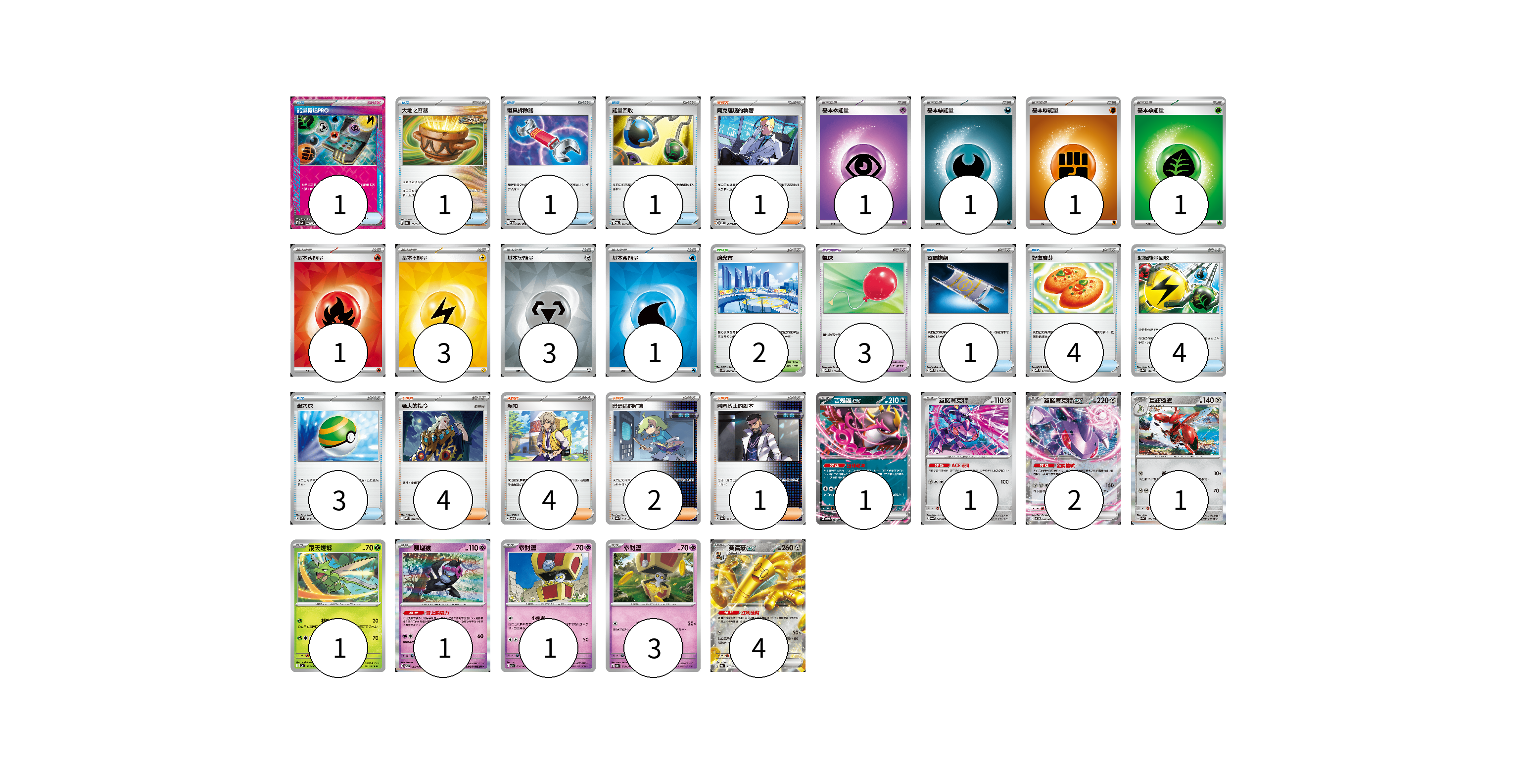 牌組構築方案 以此牌組為基礎新構築牌組 顯示卡面 顯示列表 寶可夢卡(15) 1 1 2 1 1 1 1 3 4 寶可夢道具(3) 3 物品卡(16) 1 1 1 1 1 4 4 3 支援者卡(12) 1 4 4 2 1 競技場卡(2) 2 能量卡(12) 1 1 1 1 1 3 3 1 寶可夢卡(15) 卡牌名稱 張數 卡牌名稱 張數 吉雉雞ex SVOD 004/020 01 蓋諾賽克特 SV6a 040/064 01 蓋諾賽克特ex SV11B 069/086 02 巨鉗螳螂 SV4a 129/190 01 飛天螳螂 SV2a 123/165 01 願增猿 SV6 055/101 01 索財靈 SV7a 024/064 01 索財靈 SV8a 073/187 03 賽富豪ex SV8a 117/187 04 寶可夢道具(3) 卡牌名稱 張數 卡牌名稱 張數 氣球 MBD 018/022 03 物品卡(16) 卡牌名稱 張數 卡牌名稱 張數 能量輸送PRO SV7a 052/064 01 大地之容器 SV8a 143/187 01 道具拆除器 SV11W 080/086 01 能量回收 SVQL 012/022 01 夜間擔架 MBD 016/022 01 好友寶芬 MBD 013/022 04 超級能量回收 SV8a 141/187 04 巢穴球 SVM 133/175 03 支援者卡(12) 卡牌名稱 張數 卡牌名稱 張數 阿克羅瑪的執著 SVOM 017/021 01 老大的指令 MBD 020/022 04 派帕 SVOD 018/020 04 暗碼迷的解讀 SV8a 165/187 02 弗圖博士的劇本 SV8a 175/187 01 競技場卡(2) 卡牌名稱 張數 卡牌名稱 張數 釀光市 SV9 098/100 02 能量卡(12) 卡牌名稱 張數 卡牌名稱 張數 基本【超】能量 MBD PSY 01 基本【惡】能量 MBG DAR 01 基本【鬥】能量 M-P FIG 01 基本【草】能量 M-P GRA 01 基本【火】能量 SVQL FIR 01 基本【雷】能量 SVQP LIG 03 基本【鋼】能量 SVOD MET 03 基本【水】能量 SVK WAT 01 以此牌組為基礎新構築牌組 牌組編碼 kxrZhQ-qWHzGl-xHhIgp copy 列印牌組單 牌組編碼已複製 分享至SNS