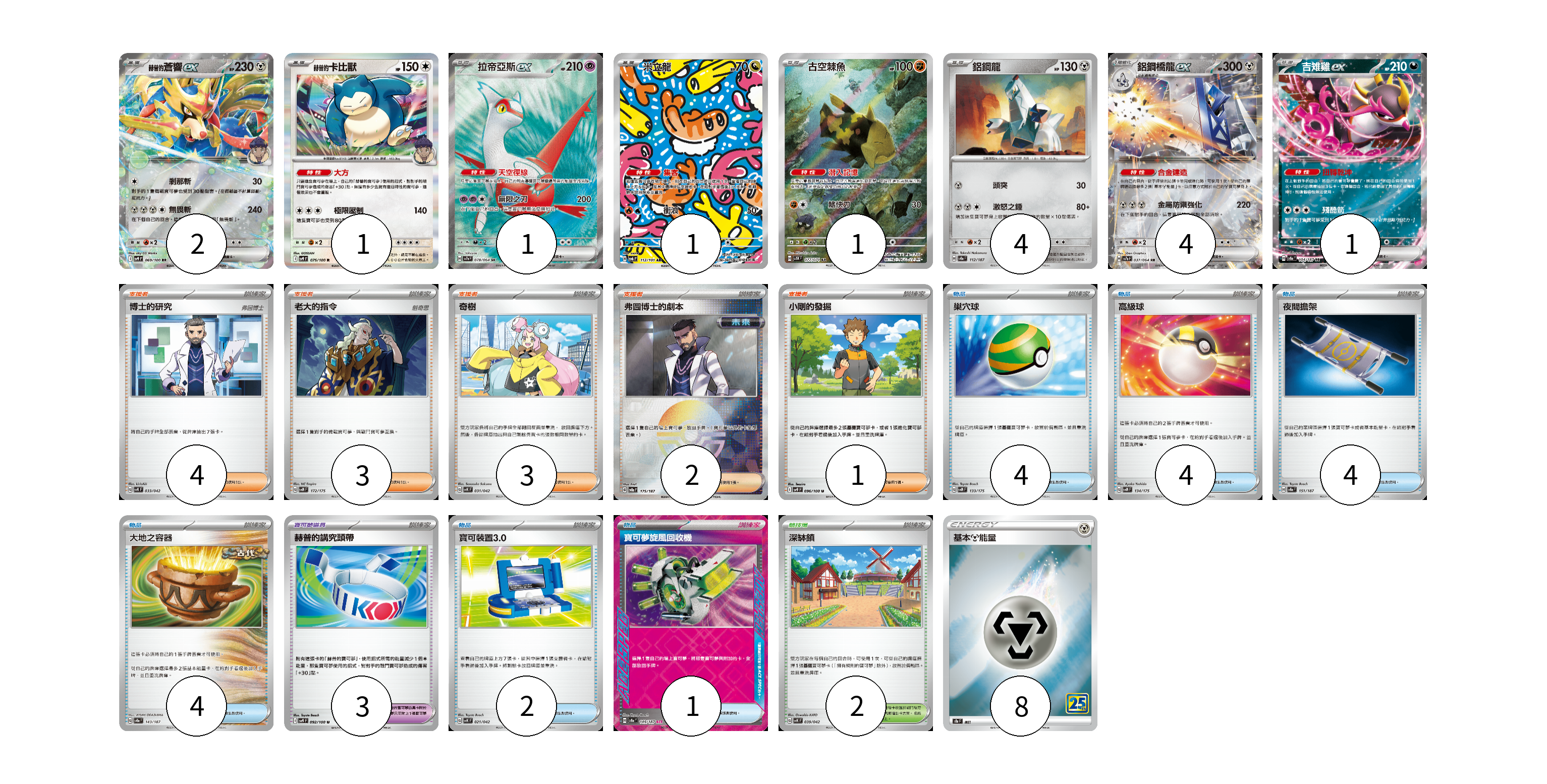 牌組構築方案 以此牌組為基礎新構築牌組 顯示卡面 顯示列表 寶可夢卡(15) 2 1 1 1 1 4 4 1 寶可夢道具(3) 3 物品卡(19) 4 4 4 4 2 1 支援者卡(13) 4 3 3 2 1 競技場卡(2) 2 能量卡(8) 8 寶可夢卡(15) 卡牌名稱 張數 卡牌名稱 張數 赫普的蒼響ex SV9 069/100 02 赫普的卡比獸 SV9 075/100 01 拉帝亞斯ex SV7a 078/064 01 米立龍 SV6 112/101 01 古空棘魚 SV5K 077/071 01 鋁鋼龍 SV8a 112/187 04 鋁鋼橋龍ex SV7a 037/064 04 吉雉雞ex SV8a 104/187 01 寶可夢道具(3) 卡牌名稱 張數 卡牌名稱 張數 赫普的講究頭帶 SV9 092/100 03 物品卡(19) 卡牌名稱 張數 卡牌名稱 張數 巢穴球 SVM 133/175 04 高級球 SVM 134/175 04 夜間擔架 SV8a 151/187 04 大地之容器 SV8a 143/187 04 寶可裝置3.0 SVK 021/042 02 寶可夢旋風回收機 SV8a 149/187 01 支援者卡(13) 卡牌名稱 張數 卡牌名稱 張數 博士的研究 SVK 033/042 04 老大的指令 SVM 172/175 03 奇樹 SVK 031/042 03 弗圖博士的劇本 SV8a 175/187 02 小剛的發掘 SV9 096/100 01 競技場卡(2) 卡牌名稱 張數 卡牌名稱 張數 深缽鎮 SVK 039/042 02 能量卡(8) 卡牌名稱 張數 卡牌名稱 張數 基本鋼能量 S8a MET 08 以此牌組為基礎新構築牌組 牌組編碼 kyIkkO-gbHDmH-JxQDgu copy 列印牌組單 牌組編碼已複製 分享至SNS
