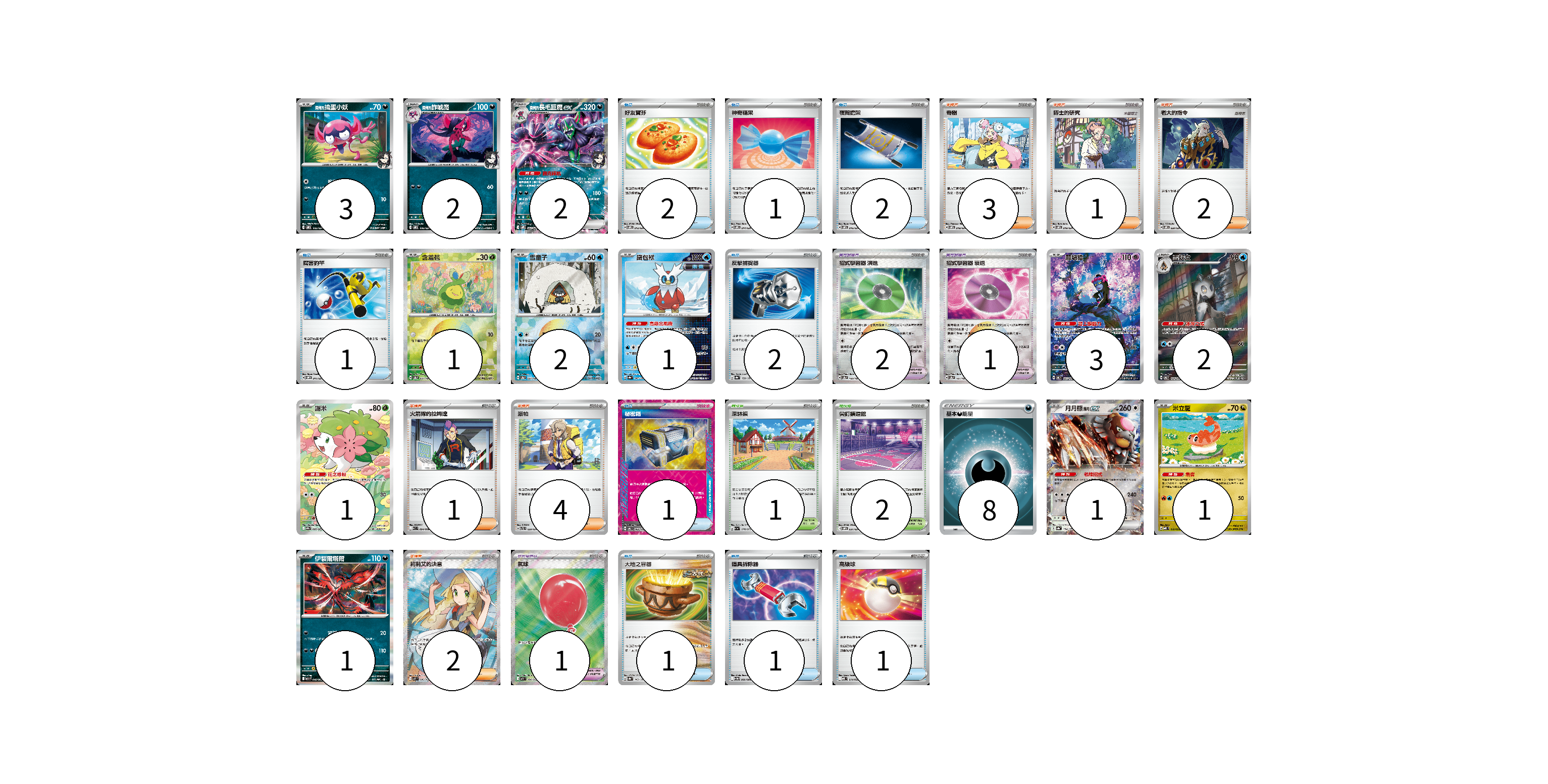牌組構築方案 以此牌組為基礎新構築牌組 顯示卡面 顯示列表 寶可夢卡(20) 3 2 2 1 2 1 3 2 1 1 1 1 寶可夢道具(4) 2 1 1 物品卡(12) 2 1 2 1 2 1 1 1 1 支援者卡(13) 3 1 2 1 4 2 競技場卡(3) 1 2 能量卡(8) 8 寶可夢卡(20) 卡牌名稱 張數 卡牌名稱 張數 <瑪俐的>搗蛋小妖 SVOM 005/021 03 <瑪俐的>詐唬魔 SVOM 006/021 02 <瑪俐的>長毛巨魔ex SVOM 007/021 02 含羞苞 SV8a 001/187 01 雪童子 SV8a 037/187 02 鐵包袱 SV8a 047/187 01 願增猿 SV6 107/101 03 雪妖女 SV6 104/101 02 謝米 SV9a 066/063 01 月月熊 赫月ex SV8a 134/187 01 米立龍 MBD 010/022 01 伊裴爾塔爾 M1L 040/063 01 寶可夢道具(4) 卡牌名稱 張數 卡牌名稱 張數 招式學習器 演進 SV8a 160/187 02 招式學習器 衰退 SV8a 161/187 01 氣球 M1L 084/063 01 物品卡(12) 卡牌名稱 張數 卡牌名稱 張數 好友寶芬 SVOM 012/021 02 神奇糖果 SVOM 014/021 01 夜間擔架 SVOM 016/021 02 厲害釣竿 SVOM 011/021 01 反擊捕捉器 SV8a 139/187 02 秘密箱 SV6 092/101 01 大地之容器 SV8a 143/187 01 道具拆除器 SV11W 080/086 01 高級球 MBD 014/022 01 支援者卡(13) 卡牌名稱 張數 卡牌名稱 張數 奇樹 SVOM 018/021 03 博士的研究 SVOM 019/021 01 老大的指令 SVOM 020/021 02 火箭隊的拉姆達 SV10 094/098 01 派帕 SVTL 020/021 04 莉莉艾的決意 M1L 086/063 02 競技場卡(3) 卡牌名稱 張數 卡牌名稱 張數 深缽鎮 SV1a 070/073 01 尖釘鎮道館 SVOM 021/021 02 能量卡(8) 卡牌名稱 張數 卡牌名稱 張數 基本惡能量 SLD DAR 08 以此牌組為基礎新構築牌組 牌組編碼 kyJIkg-RlfBug-dvCvoR copy 列印牌組單 牌組編碼已複製 分享至SNS