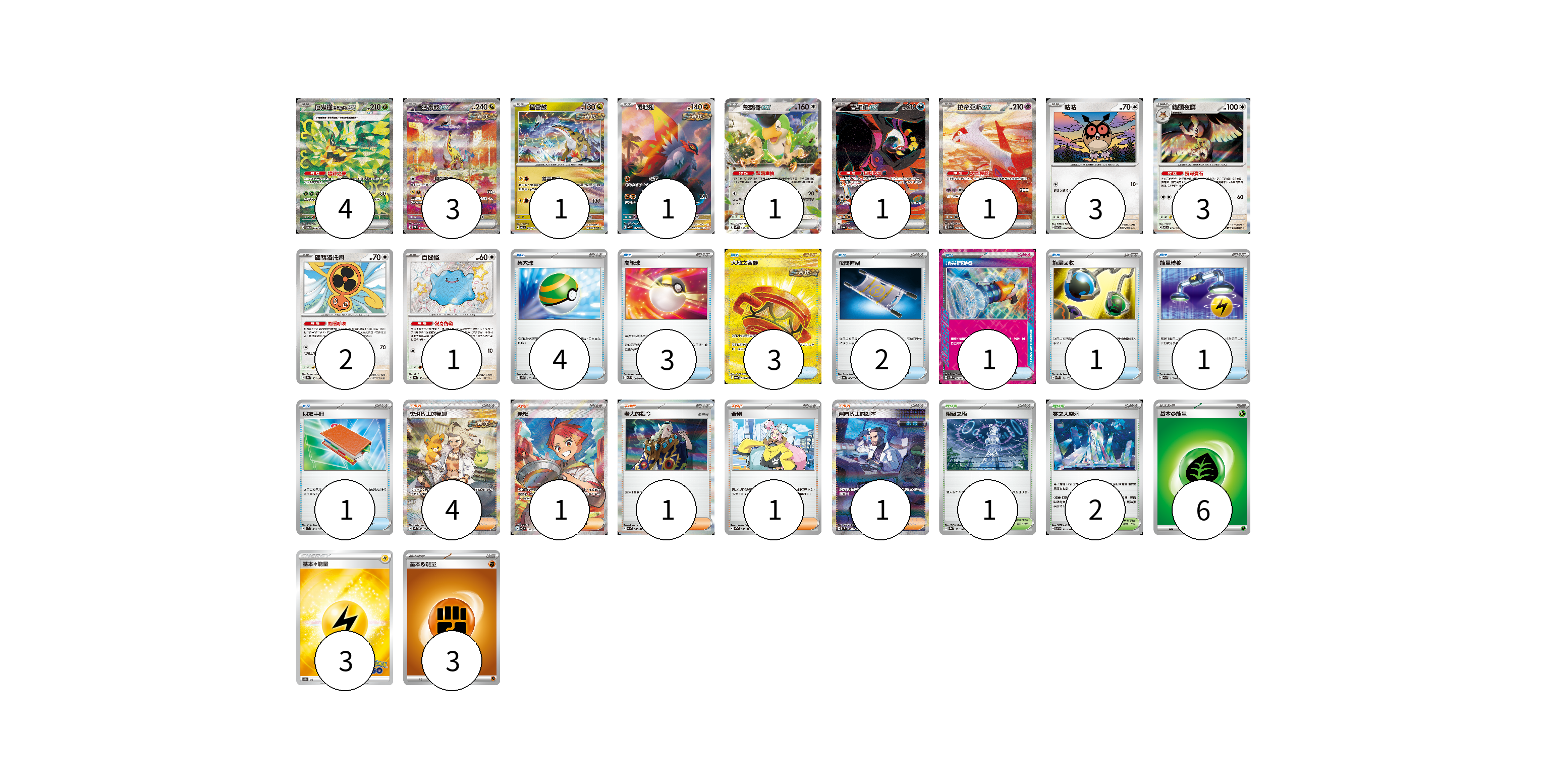 牌組構築方案 以此牌組為基礎新構築牌組 顯示卡面 顯示列表 寶可夢卡(21) 4 3 1 1 1 1 1 3 3 2 1 物品卡(16) 4 3 3 2 1 1 1 1 支援者卡(8) 4 1 1 1 1 競技場卡(3) 1 2 能量卡(12) 6 3 3 寶可夢卡(21) 卡牌名稱 張數 卡牌名稱 張數 厄鬼椪 碧草面具ex SV6 125/101 04 猛雷鼓ex SV5K 095/071 03 猛雷鼓 SV7 075/102 01 爬地翅 SV4K 074/066 01 怒鸚哥ex SV2P 065/071 01 吉雉雞ex SV6a 089/064 01 拉帝亞斯ex SV7a 087/064 01 咕咕 SV7 076/102 03 貓頭夜鷹 SV7 077/102 03 旋轉洛托姆 SV8a 131/187 02 百變怪 SV4a 309/190 01 物品卡(16) 卡牌名稱 張數 卡牌名稱 張數 巢穴球 SV1S 070/078 04 高級球 SVB 002/028 03 大地之容器 SV6a 093/064 03 夜間擔架 SV6a 056/064 02 頂尖捕捉器 SV5M 062/071 01 能量回收 SVAW 011/023 01 能量轉移 SVAM 012/023 01 朋友手冊 SV1S 069/078 01 支援者卡(8) 卡牌名稱 張數 卡牌名稱 張數 奧琳博士的氣魄 SV4K 091/066 04 赤松 SV7 123/102 01 老大的指令 SV1a 069/073 01 奇樹 SV2D 069/071 01 弗圖博士的劇本 SV4M 091/066 01 競技場卡(3) 卡牌名稱 張數 卡牌名稱 張數 阻礙之塔 SV8a 181/187 01 零之大空洞 SV7 102/102 02 能量卡(12) 卡牌名稱 張數 卡牌名稱 張數 基本【草】能量 SVF GRA 06 基本雷能量 S10b LIG 03 基本【鬥】能量 SVHK FIG 03 以此牌組為基礎新構築牌組 牌組編碼 kykYKA-pCcTZv-YPqwSp copy 列印牌組單 牌組編碼已複製 分享至SNS