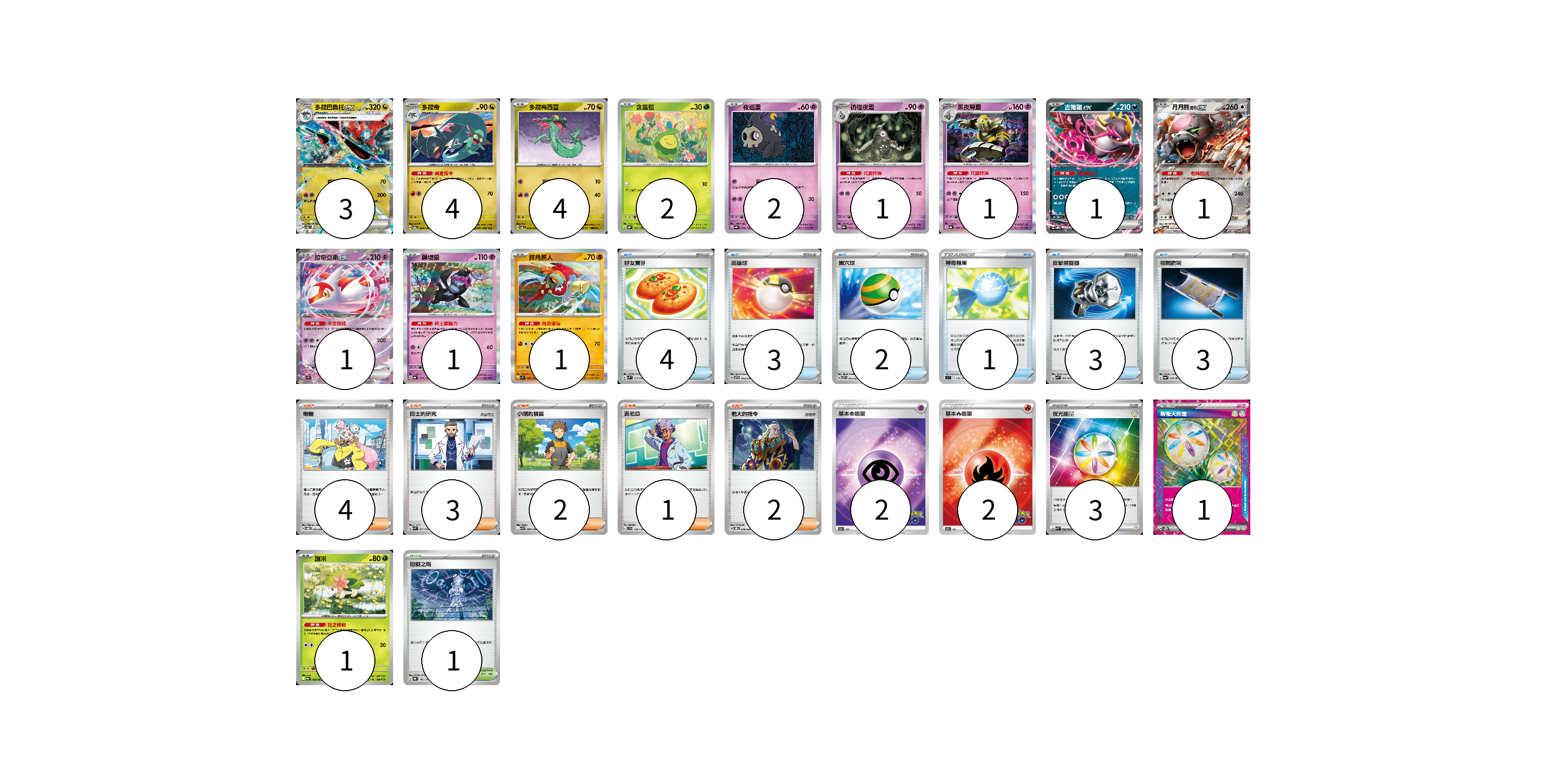 牌組構築方案 以此牌組為基礎新構築牌組 顯示卡面 顯示列表 寶可夢卡(23) 3 4 4 2 2 1 1 1 1 1 1 1 1 物品卡(16) 4 3 2 1 3 3 支援者卡(12) 4 3 2 1 2 競技場卡(1) 1 能量卡(8) 2 2 3 1 寶可夢卡(23) 卡牌名稱 張數 卡牌名稱 張數 多龍巴魯托ex SV6 081/101 03 多龍奇 SV6 080/101 04 多龍梅西亞 SV6 079/101 04 含羞苞 SV8a 001/187 02 夜巡靈 SV8a 064/187 02 彷徨夜靈 SV8a 065/187 01 黑夜魔靈 SV8a 066/187 01 吉雉雞ex SVOD 004/020 01 月月熊 赫月 ex SV5a 052/066 01 拉帝亞斯ex SV7a 019/064 01 願增猿 SV8a 075/187 01 摔角鷹人 SV1S 045/078 01 謝米 SV9a 006/063 01 物品卡(16) 卡牌名稱 張數 卡牌名稱 張數 好友寶芬 SVK 015/042 04 高級球 SVTG 013/019 03 巢穴球 SVTS 013/022 02 神奇糖果 SI 376/414 01 反擊捕捉器 SVK 009/042 03 夜間擔架 SV6a 056/064 03 支援者卡(12) 卡牌名稱 張數 卡牌名稱 張數 奇樹 SVOD 016/020 04 博士的研究 SVK 033/042 03 小剛的發掘 SV9 096/100 02 吉尼亞 SVD 129/139 01 老大的指令 SVOD 019/020 02 競技場卡(1) 卡牌名稱 張數 卡牌名稱 張數 阻礙之塔 SV8a 181/187 01 能量卡(8) 卡牌名稱 張數 卡牌名稱 張數 基本超能量 S10b PSY 02 基本火能量 S10b FIR 02 夜光能量 SVK 042/042 03 新衝天能量 SV5K 071/071 01 以此牌組為基礎新構築牌組 牌組編碼 kzgBoR-TgpUNZ-CEXpUZ copy 列印牌組單 牌組編碼已複製 分享至SNS