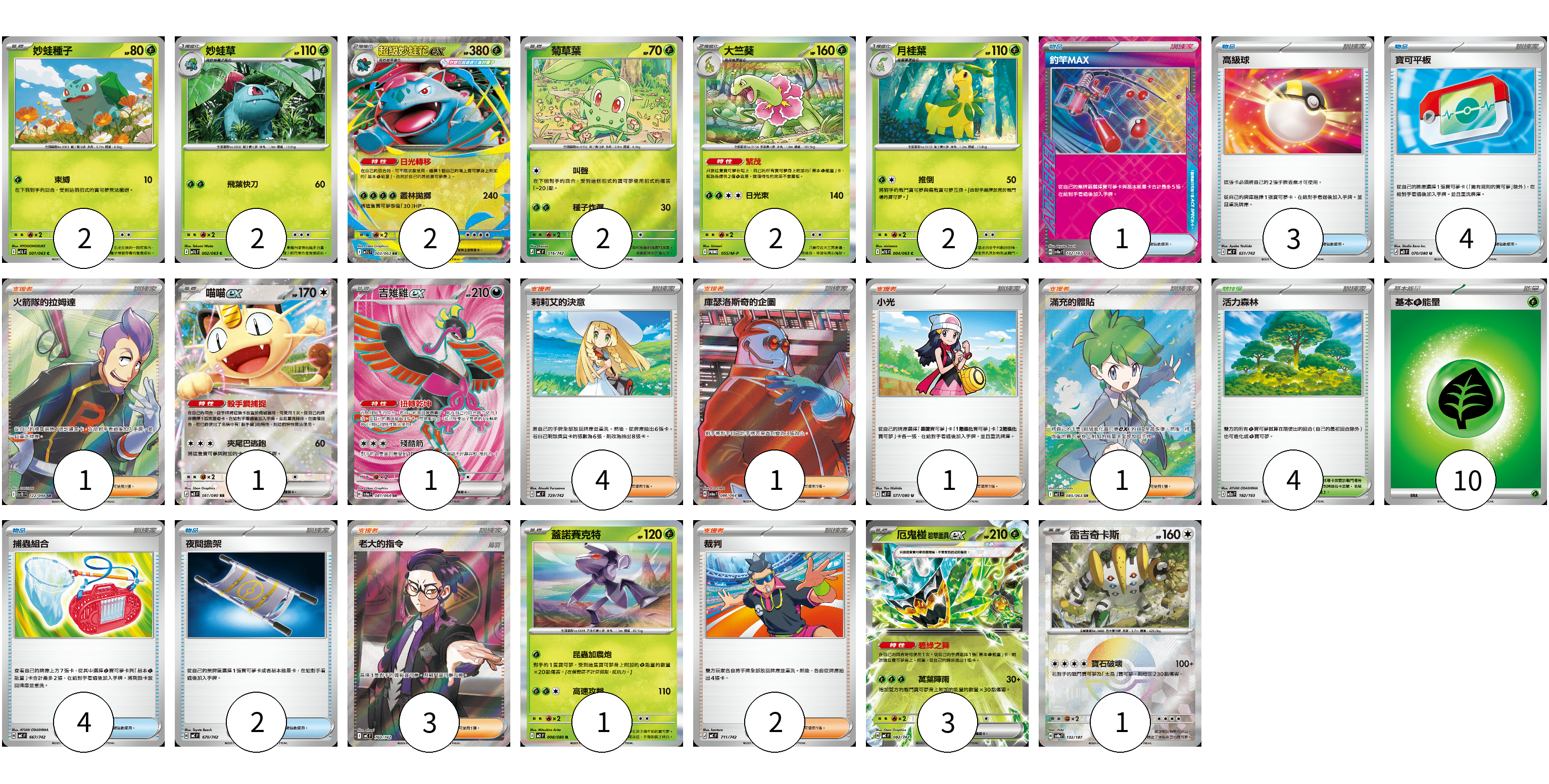 牌組構築方案 以此牌組為基礎新構築牌組 顯示卡面 顯示列表 寶可夢卡(19) 2 2 2 2 2 2 1 1 1 3 1 物品卡(14) 1 3 4 4 2 支援者卡(13) 1 4 1 1 1 3 2 競技場卡(4) 4 能量卡(10) 10 寶可夢卡(19) 卡牌名稱 張數 卡牌名稱 張數 妙蛙種子 M1L 001/063 02 妙蛙草 M1L 002/063 02 超級妙蛙花ex M1L 003/063 02 菊草葉 MC 016/742 02 大竺葵 M-P 055/M-P 02 月桂葉 M1S 004/063 02 喵喵ex M3 061/080 01 吉雉雞ex SV6a 081/064 01 蓋諾賽克特 M2 008/080 01 厄鬼椪 碧草面具ex MC 082/742 03 雷吉奇卡斯 SV8a 132/187 01 物品卡(14) 卡牌名稱 張數 卡牌名稱 張數 釣竿MAX SV8a 142/187 01 高級球 MC 651/742 03 寶可平板 M3 070/080 04 捕蟲組合 MC 667/742 04 夜間擔架 MC 670/742 02 支援者卡(13) 卡牌名稱 張數 卡牌名稱 張數 火箭隊的拉姆達 SV10 122/098 01 莉莉艾的決意 MC 729/742 04 庫瑟洛斯奇的企圖 SV6a 086/064 01 小光 M2 077/080 01 滿充的體貼 M1S 085/063 01 老大的指令(烏羽) MC 760/742 03 裁判 MC 711/742 02 競技場卡(4) 卡牌名稱 張數 卡牌名稱 張數 活力森林 M2a 182/193 04 能量卡(10) 卡牌名稱 張數 卡牌名稱 張數 基本【草】能量 MC GRA 10 以此牌組為基礎新構築牌組 牌組編碼 lArIvO-TBiRaU-fMjOMx copy 列印牌組單 牌組編碼已複製 分享至SNS