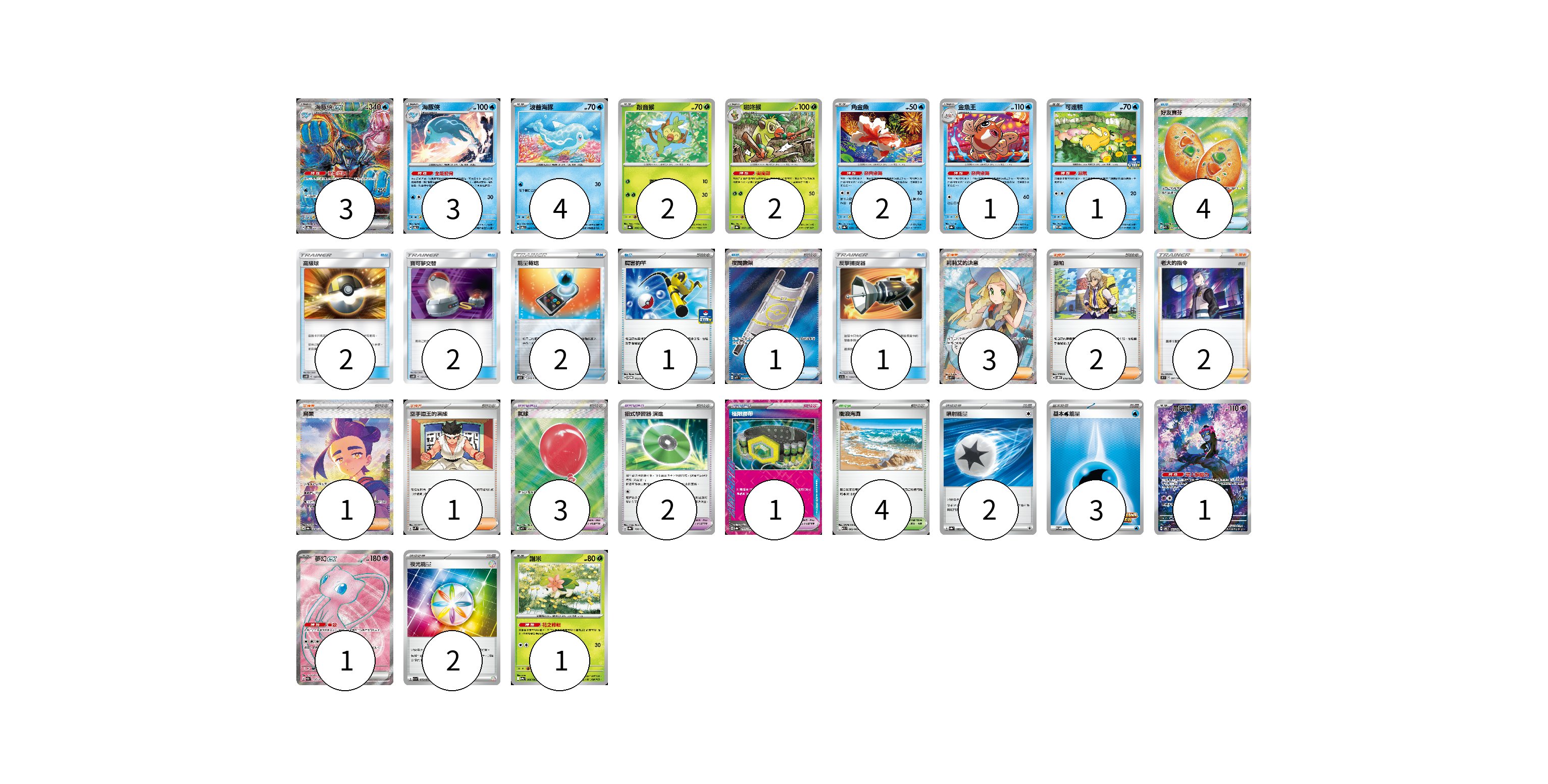 牌組構築方案 以此牌組為基礎新構築牌組 顯示卡面 顯示列表 寶可夢卡(21) 3 3 4 2 2 2 1 1 1 1 1 寶可夢道具(6) 3 2 1 物品卡(13) 4 2 2 2 1 1 1 支援者卡(9) 3 2 2 1 1 競技場卡(4) 4 能量卡(7) 2 3 2 寶可夢卡(21) 卡牌名稱 張數 卡牌名稱 張數 海豚俠ex SV8a 207/187 03 海豚俠 SV6 035/101 03 波普海豚 SV6 034/101 04 敲音猴 SV8a 006/187 02 啪咚猴 SV8a 007/187 02 角金魚 SV8a 028/187 02 金魚王 SV8a 029/187 01 可達鴨 SV-P 220/SV-P 01 願增猿 SV6 107/101 01 夢幻ex SV2a 195/165 01 謝米 SV9a 006/063 01 寶可夢道具(6) 卡牌名稱 張數 卡牌名稱 張數 氣球 M1L 084/063 03 招式學習器 演進 SV8a 160/187 02 極限腰帶 SV8a 159/187 01 物品卡(13) 卡牌名稱 張數 卡牌名稱 張數 好友寶芬 M1S 081/063 04 高級球 AS6D 147/168 02 寶可夢交替 AS6D 151/168 02 能量輸送 SO 018/030 02 厲害釣竿 SV-P 112/SV-P 01 夜間擔架 M1L 083/063 01 反擊捕捉器 AC1a 130/158 01 支援者卡(9) 卡牌名稱 張數 卡牌名稱 張數 莉莉艾的決意 M1L 086/063 03 派帕 SVOD 018/020 02 老大的指令(赤日) S9 097/100 02 烏栗 SV8a 230/187 01 空手道王的演練 SVM 143/175 01 競技場卡(4) 卡牌名稱 張數 卡牌名稱 張數 衝浪海灘 M1S 062/063 04 能量卡(7) 卡牌名稱 張數 卡牌名稱 張數 噴射能量 SV8a 185/187 02 基本【水】能量 SV-P 259/SV-P 03 夜光能量 SV1a 073/073 02 以此牌組為基礎新構築牌組 牌組編碼 lCRklQ-WypGIy-AAOtxB copy 列印牌組單 牌組編碼已複製 分享至SNS