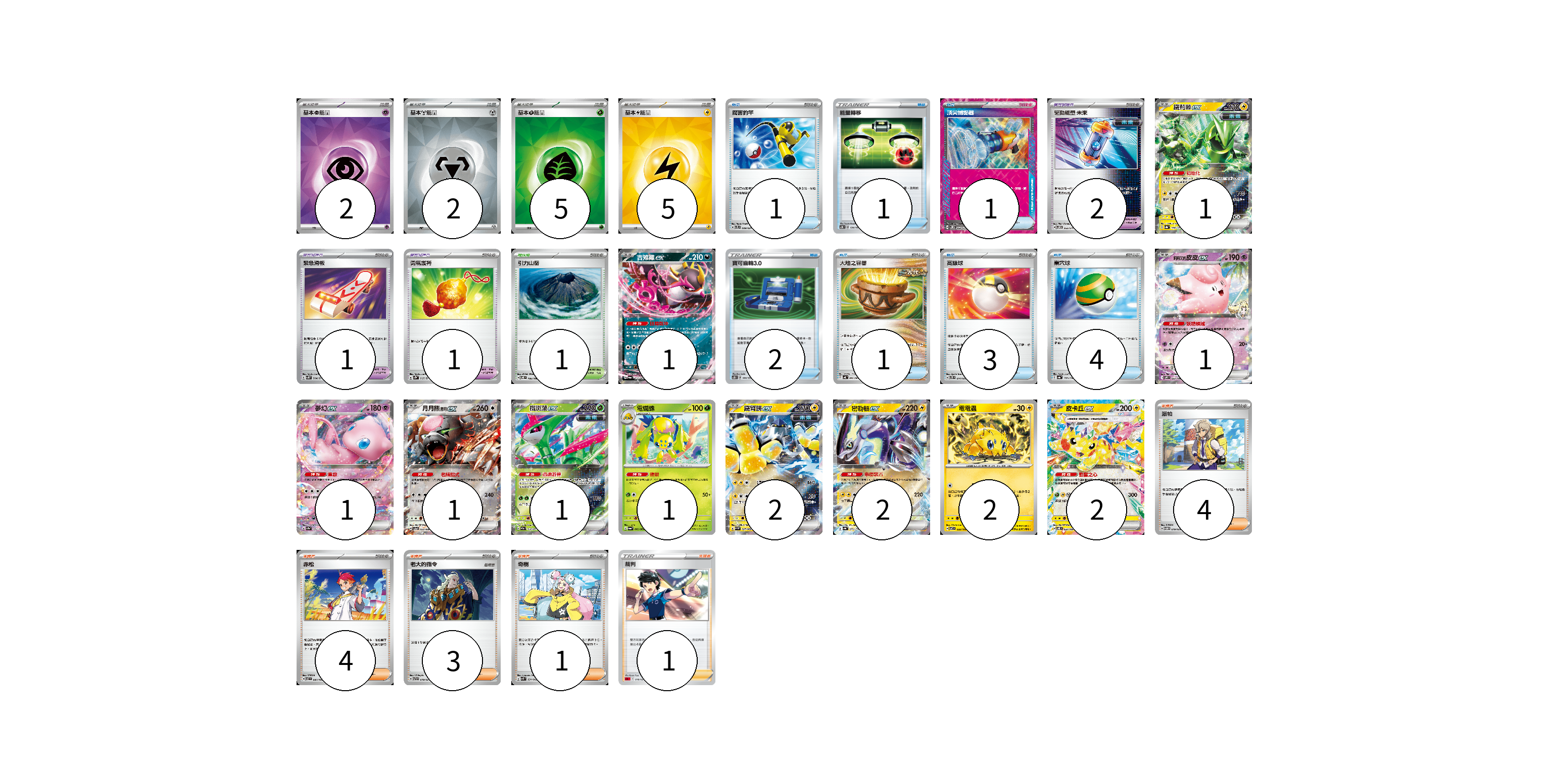 牌組構築方案 以此牌組為基礎新構築牌組 顯示卡面 顯示列表 寶可夢卡(15) 1 1 1 1 1 1 1 2 2 2 2 寶可夢道具(4) 2 1 1 物品卡(13) 1 1 1 2 1 3 4 支援者卡(13) 4 4 3 1 1 競技場卡(1) 1 能量卡(14) 2 2 5 5 寶可夢卡(15) 卡牌名稱 張數 卡牌名稱 張數 鐵荊棘ex SV8a 056/187 01 吉雉雞ex SV6a 038/064 01 莉莉艾的皮皮ex SV9 033/100 01 夢幻ex SV2a 151/165 01 月月熊 赫月 ex SV5a 052/066 01 鐵斑葉ex SV5M 016/071 01 電蜘蛛 SV6a 002/064 01 鐵臂膀ex SV4M 027/066 02 密勒頓ex SV4a 071/190 02 電電蟲 SV7 032/102 02 皮卡丘ex SV8 033/106 02 寶可夢道具(4) 卡牌名稱 張數 卡牌名稱 張數 驅勁能量 未來 SV5M 065/071 02 緊急滑板 SV5K 064/071 01 勇氣護符 SV2D 067/071 01 物品卡(13) 卡牌名稱 張數 卡牌名稱 張數 厲害釣竿 SVTL 009/021 01 能量轉移 SC2D 134/157 01 頂尖捕捉器 SV5M 062/071 01 寶可齒輪3.0 SC2D 144/157 02 大地之容器 SV4K 060/066 01 高級球 SVTS 014/022 03 巢穴球 SV4a 159/190 04 支援者卡(13) 卡牌名稱 張數 卡牌名稱 張數 派帕 SVTM 019/022 04 赤松 SV7 097/102 04 老大的指令 SVTR 019/021 03 奇樹 SVK 031/042 01 裁判 SDL 018/021 01 競技場卡(1) 卡牌名稱 張數 卡牌名稱 張數 引力山岳 SV8 106/106 01 能量卡(14) 卡牌名稱 張數 卡牌名稱 張數 基本【超】能量 SVOD PSY 02 基本【鋼】能量 SVOD MET 02 基本【草】能量 SVK GRA 05 基本【雷】能量 SVK LIG 05 以此牌組為基礎新構築牌組 牌組編碼 lDgAiM-SFFWnX-fbdCEE copy 列印牌組單 牌組編碼已複製 分享至SNS