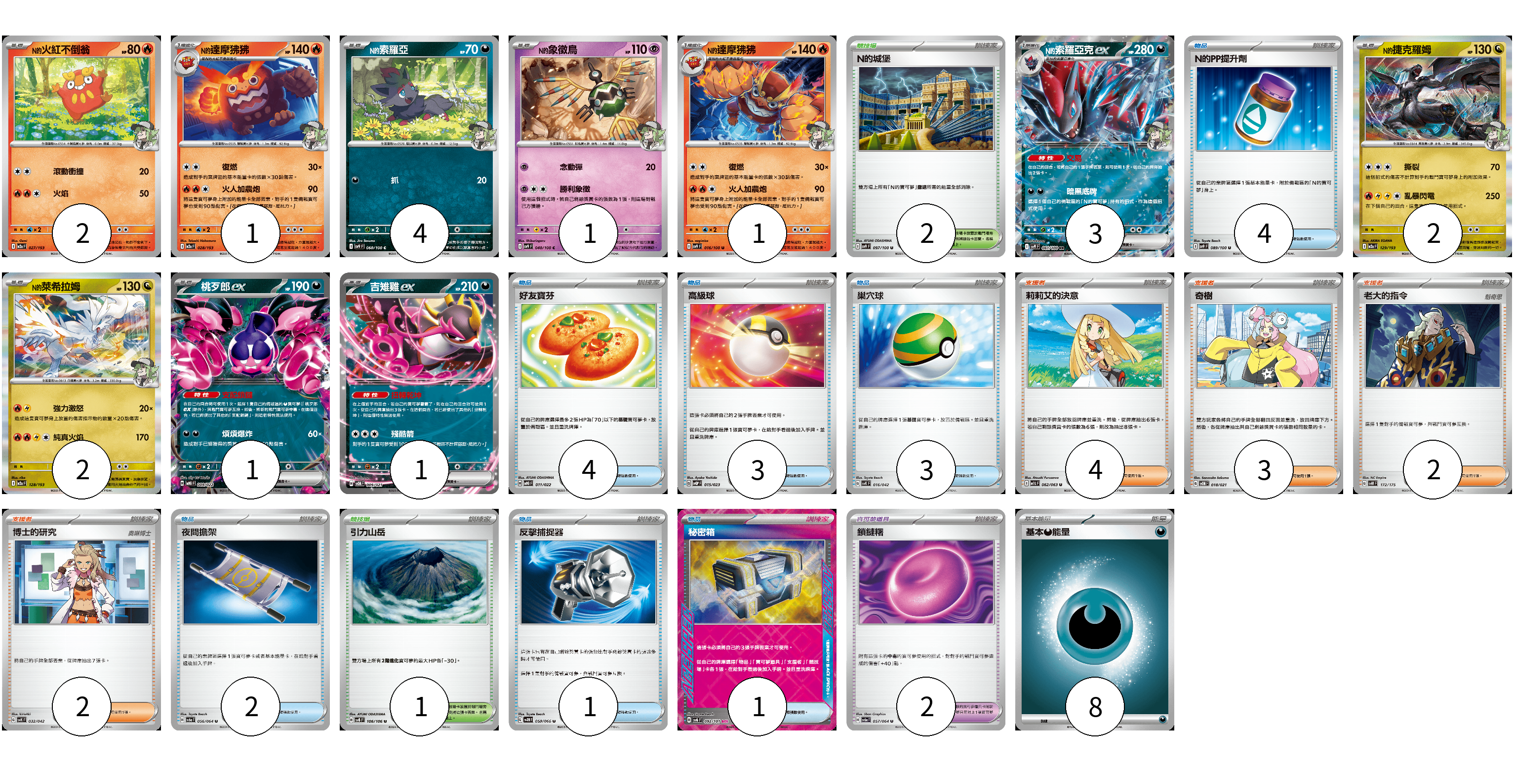 牌組構築方案 以此牌組為基礎新構築牌組 顯示卡面 顯示列表 寶可夢卡(18) 2 1 4 1 1 3 2 2 1 1 寶可夢道具(2) 2 物品卡(18) 4 4 3 3 2 1 1 支援者卡(11) 4 3 2 2 競技場卡(3) 2 1 能量卡(8) 8 寶可夢卡(18) 卡牌名稱 張數 卡牌名稱 張數 N的火紅不倒翁 M2a 027/193 02 N的達摩狒狒 M2a 028/193 01 N的索羅亞 SV9 060/100 04 N的象徵鳥 SV9 040/100 01 N的達摩狒狒 SV9 016/100 01 N的索羅亞克ex SV9 061/100 03 N的捷克羅姆 M2a 129/193 02 N的萊希拉姆 M2a 128/193 02 桃歹郎ex MBG 009/022 01 吉雉雞ex SVOM 009/021 01 寶可夢道具(2) 卡牌名稱 張數 卡牌名稱 張數 鎖鏈糬 SV6a 057/064 02 物品卡(18) 卡牌名稱 張數 卡牌名稱 張數 N的PP提升劑 SV9 089/100 04 好友寶芬 MBG 011/022 04 高級球 SVQP 015/023 03 巢穴球 SVK 016/042 03 夜間擔架 SV6a 056/064 02 反擊捕捉器 SV4M 059/066 01 秘密箱 SV6 092/101 01 支援者卡(11) 卡牌名稱 張數 卡牌名稱 張數 莉莉艾的決意 M1L 062/063 04 奇樹 SVOM 018/021 03 老大的指令 SVM 172/175 02 博士的研究 SVK 032/042 02 競技場卡(3) 卡牌名稱 張數 卡牌名稱 張數 N的城堡 SV9 097/100 02 引力山岳 SV8 106/106 01 能量卡(8) 卡牌名稱 張數 卡牌名稱 張數 基本【惡】能量 M-P DAR 08 以此牌組為基礎新構築牌組 牌組編碼 lDxWFc-RAlheo-vJOHsL copy 列印牌組單 牌組編碼已複製 分享至SNS