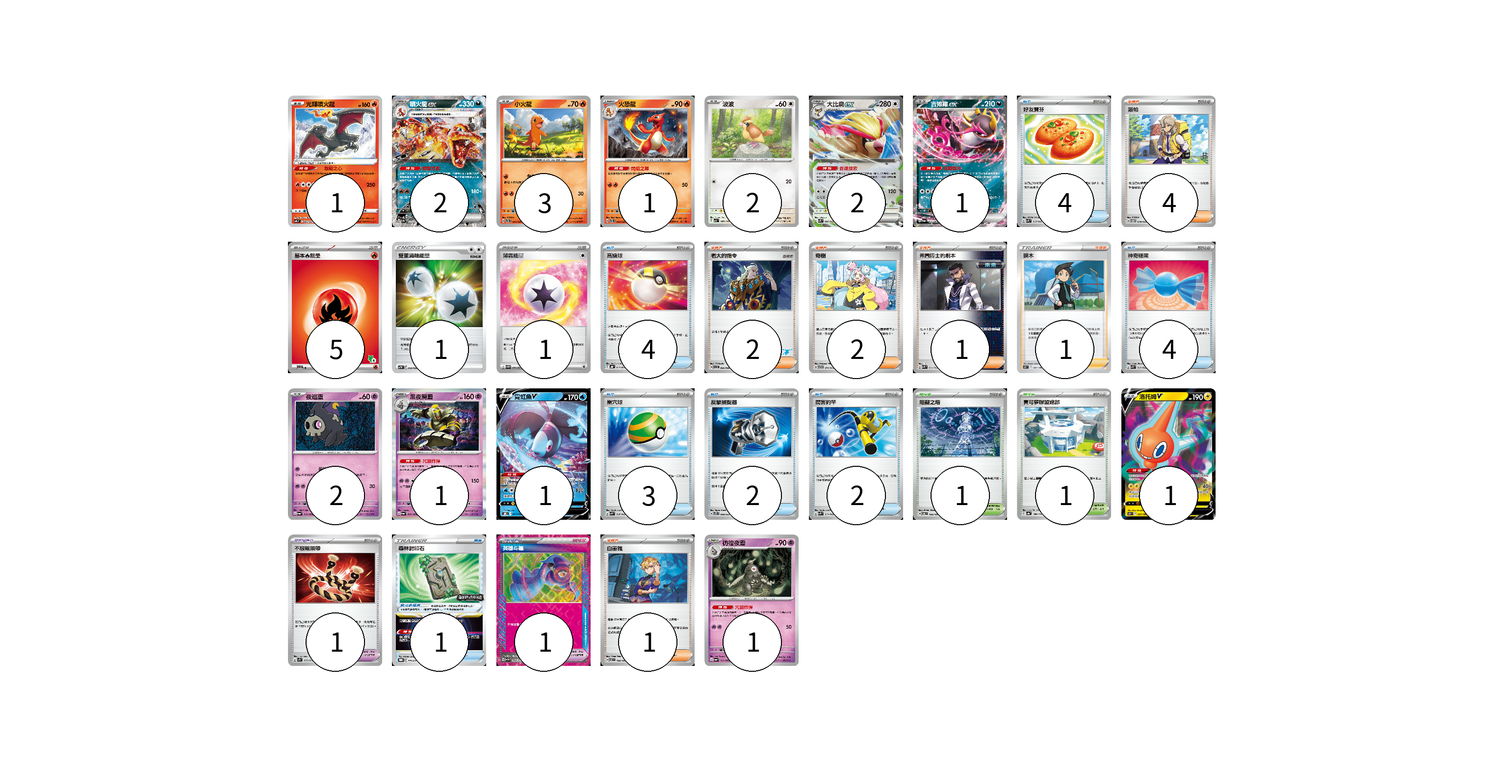 牌組構築方案 以此牌組為基礎新構築牌組 顯示卡面 顯示列表 寶可夢卡(18) 1 2 3 1 2 2 1 2 1 1 1 1 寶可夢道具(3) 1 1 1 物品卡(19) 4 4 4 3 2 2 支援者卡(11) 4 2 2 1 1 1 競技場卡(2) 1 1 能量卡(7) 5 1 1 寶可夢卡(18) 卡牌名稱 張數 卡牌名稱 張數 光輝噴火龍 SVTL 003/021 01 噴火龍ex SV4a 115/190 02 小火龍 SVTL 001/021 03 火恐龍 SVTL 002/021 01 波波 SV3 087/108 02 大比鳥ex SVK 005/042 02 吉雉雞ex SV6a 038/064 01 夜巡靈 SV6a 018/064 02 黑夜魔靈 SV6a 020/064 01 霓虹魚V SVHM 001/022 01 洛托姆V S11 037/100 01 彷徨夜靈 SV6a 019/064 01 寶可夢道具(3) 卡牌名稱 張數 卡牌名稱 張數 不服輸頭帶 SV1S 073/078 01 森林封印石 SV-P 141/SV-P 01 英雄斗篷 SV5M 064/071 01 物品卡(19) 卡牌名稱 張數 卡牌名稱 張數 好友寶芬 SVK 015/042 04 高級球 SVHK 013/022 04 神奇糖果 SVK 019/042 04 巢穴球 SVK 016/042 03 反擊捕捉器 SVTS 009/022 02 厲害釣竿 SVK 011/042 02 支援者卡(11) 卡牌名稱 張數 卡牌名稱 張數 派帕 SVTM 019/022 04 老大的指令 SVI 066/066 02 奇樹 SVTG 017/019 02 弗圖博士的劇本 SVK 034/042 01 捩木 S11 097/100 01 白蕾雅 SV7 100/102 01 競技場卡(2) 卡牌名稱 張數 卡牌名稱 張數 阻礙之塔 SV6 100/101 01 寶可夢聯盟總部 SV4a 186/190 01 能量卡(7) 卡牌名稱 張數 卡牌名稱 張數 基本【火】能量 SVI FIR 05 雙重渦輪能量 SVTM 022/022 01 薄霧能量 SV5M 071/071 01 以此牌組為基礎新構築牌組 牌組編碼 lEkFGu-gtEoEu-wJmHPp copy 列印牌組單 牌組編碼已複製 分享至SNS