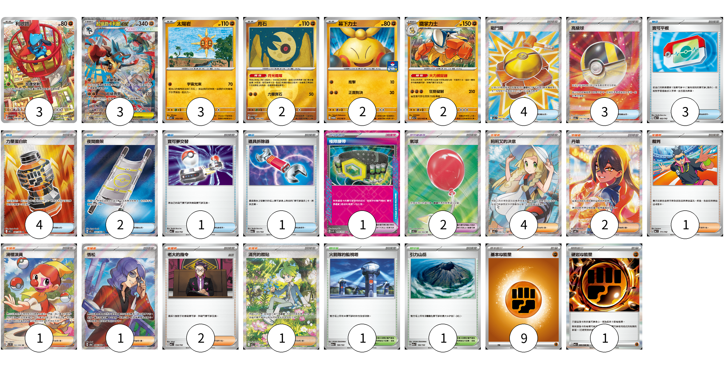 牌組構築方案 以此牌組為基礎新構築牌組 顯示卡面 顯示列表 寶可夢卡(15) 3 3 3 2 2 2 寶可夢道具(3) 1 2 物品卡(18) 4 3 3 4 2 1 1 支援者卡(12) 4 2 1 1 1 2 1 競技場卡(2) 1 1 能量卡(10) 9 1 寶可夢卡(15) 卡牌名稱 張數 卡牌名稱 張數 利歐路 M1L 068/063 03 超級路卡利歐ex M1L 088/063 03 太陽岩 MC 372/742 03 月石 M2a 086/193 02 幕下力士 M-P 015/M-P 02 鐵掌力士 M1L 025/063 02 寶可夢道具(3) 卡牌名稱 張數 卡牌名稱 張數 極限腰帶 SV5K 066/071 01 氣球 M1L 084/063 02 物品卡(18) 卡牌名稱 張數 卡牌名稱 張數 戰鬥鑼 M1L 082/063 04 高級球 M2a 216/193 03 寶可平板 MC 662/742 03 力量蛋白飲 M1L 081/063 04 夜間擔架 M1L 083/063 02 寶可夢交替 MC 663/742 01 道具拆除器 M2a 151/193 01 支援者卡(12) 卡牌名稱 張數 卡牌名稱 張數 莉莉艾的決意 M1L 086/063 04 丹瑜 SV6 130/101 02 裁判 MC 711/742 01 滑稽演員 SV11W 165/086 01 悟松 SV5a 086/066 01 老大的指令 MC 724/742 02 滿充的體貼 M1S 091/063 01 競技場卡(2) 卡牌名稱 張數 卡牌名稱 張數 火箭隊的監視塔 M2a 189/193 01 引力山岳 M2a 183/193 01 能量卡(10) 卡牌名稱 張數 卡牌名稱 張數 基本【鬥】能量 MC FIG 09 硬岩【鬥】能量 M3 080/080 01 以此牌組為基礎新構築牌組 牌組編碼 lFMBbw-yxdBpo-Liteuc copy 列印牌組單 牌組編碼已複製 分享至SNS