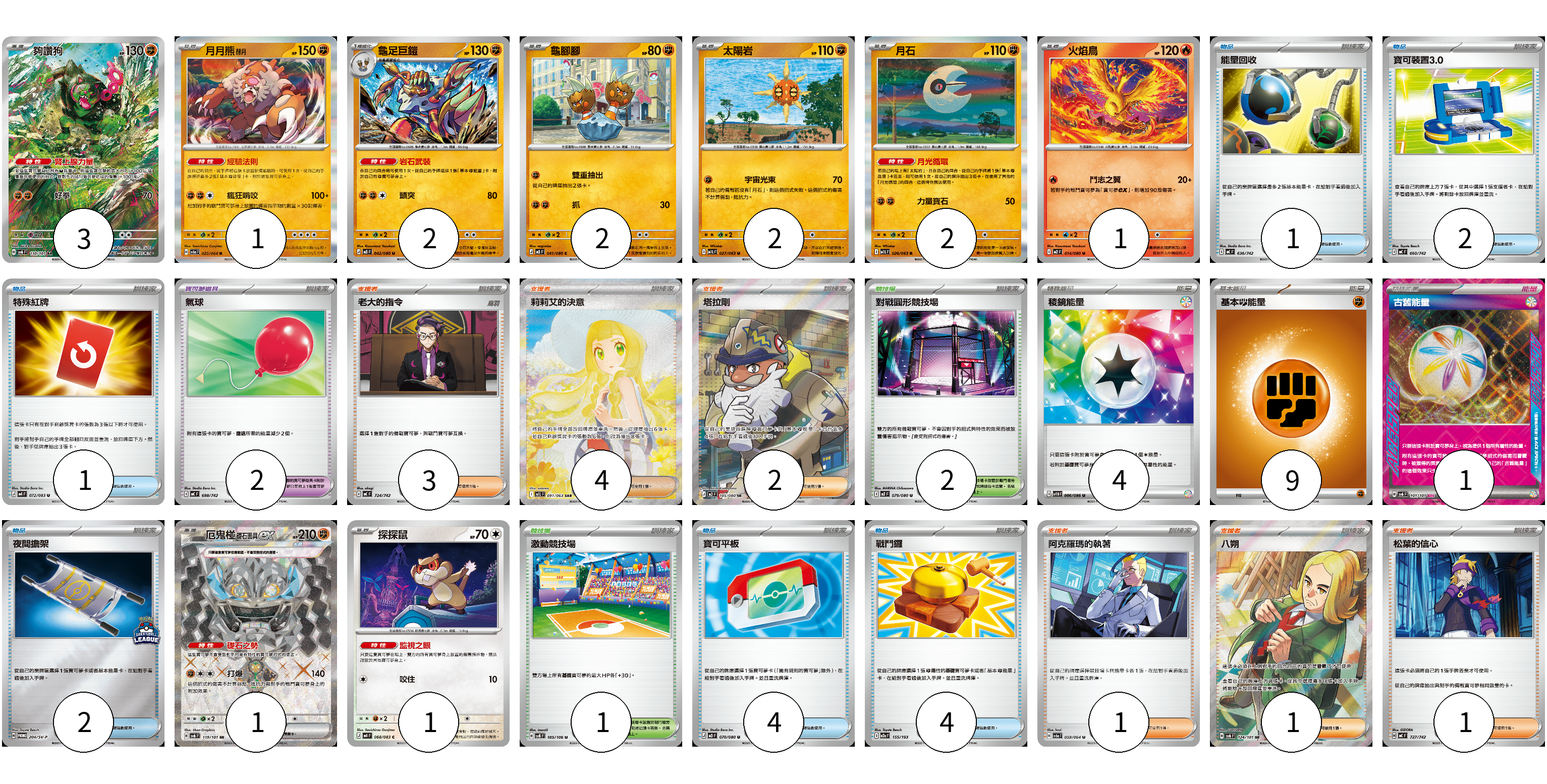 牌組構築方案 以此牌組為基礎新構築牌組 顯示卡面 顯示列表 寶可夢卡(15) 3 1 2 2 2 2 1 1 1 寶可夢道具(2) 2 物品卡(14) 1 2 1 2 4 4 支援者卡(12) 3 4 2 1 1 1 競技場卡(3) 2 1 能量卡(14) 4 9 1 寶可夢卡(15) 卡牌名稱 張數 卡牌名稱 張數 夠讚狗 SV6 110/101 03 月月熊 赫月 SV6a 025/064 01 龜足巨鎧 M3 042/080 02 龜腳腳 M3 041/080 02 太陽岩 M1L 027/063 02 月石 M1L 026/063 02 火焰鳥 M2 014/080 01 厄鬼椪 礎石面具ex SV6 119/101 01 探探鼠 M4 068/083 01 寶可夢道具(2) 卡牌名稱 張數 卡牌名稱 張數 氣球 MC 688/742 02 物品卡(14) 卡牌名稱 張數 卡牌名稱 張數 能量回收 MC 636/742 01 寶可裝置3.0 MC 660/742 02 特殊紅牌 M4 072/083 01 夜間擔架 SV-P 204/SV-P 02 寶可平板 M3 070/080 04 戰鬥鑼 M2a 155/193 04 支援者卡(12) 卡牌名稱 張數 卡牌名稱 張數 老大的指令 MC 724/742 03 莉莉艾的決意 M1L 091/063 04 塔拉剛 M3 105/080 02 阿克羅瑪的執著 SV6a 059/064 01 八朔 SV6 124/101 01 松葉的信心 MC 727/742 01 競技場卡(3) 卡牌名稱 張數 卡牌名稱 張數 對戰圓形競技場 M2 079/080 02 激動競技場 SV8 105/106 01 能量卡(14) 卡牌名稱 張數 卡牌名稱 張數 稜鏡能量 SV11B 086/086 04 基本【鬥】能量 MC FIG 09 古舊能量 SV6 101/101 01 以此牌組為基礎新構築牌組 牌組編碼 lFjUnD-trJFPR-AMlFWT copy 列印牌組單 牌組編碼已複製 分享至SNS