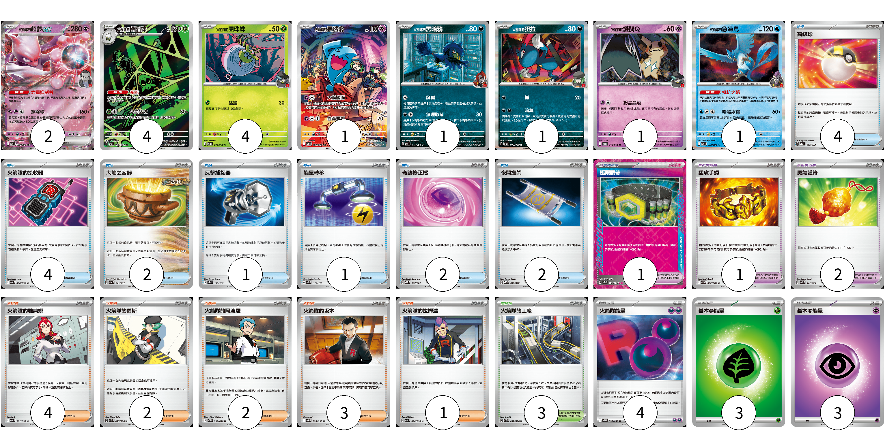 牌組構築方案 以此牌組為基礎新構築牌組 顯示卡面 顯示列表 寶可夢卡(15) 2 4 4 1 1 1 1 1 寶可夢道具(4) 1 1 2 物品卡(16) 4 4 2 1 1 2 2 支援者卡(12) 4 2 2 3 1 競技場卡(3) 3 能量卡(10) 4 3 3 寶可夢卡(15) 卡牌名稱 張數 卡牌名稱 張數 <火箭隊的>超夢ex SV10 039/098 02 <火箭隊的>操陷蛛 SV10 099/098 04 <火箭隊的>團珠蛛 SV10 008/098 04 <火箭隊的>果然翁 SV10 103/098 01 <火箭隊的>黑暗鴉 SV10 071/098 01 <火箭隊的>狃拉 SV10 072/098 01 <火箭隊的>謎擬Q SV10 042/098 01 <火箭隊的>急凍鳥 SV10 022/098 01 寶可夢道具(4) 卡牌名稱 張數 卡牌名稱 張數 極限腰帶 SV8a 159/187 01 猛攻手鐲 SV11W 082/086 01 勇氣護符 SVM 142/175 02 物品卡(16) 卡牌名稱 張數 卡牌名稱 張數 高級球 MBG 012/022 04 火箭隊的接收器 SV10 090/098 04 大地之容器 SV8a 143/187 02 反擊捕捉器 SV8a 139/187 01 能量轉移 SVM 127/175 01 奇跡修正檔 MBD 017/022 02 夜間擔架 MBD 016/022 02 支援者卡(12) 卡牌名稱 張數 卡牌名稱 張數 火箭隊的雅典娜 SV10 091/098 04 火箭隊的蘭斯 SV10 095/098 02 火箭隊的阿波羅 SV10 092/098 02 火箭隊的坂木 SV10 093/098 03 火箭隊的拉姆達 SV10 094/098 01 競技場卡(3) 卡牌名稱 張數 卡牌名稱 張數 火箭隊的工廠 SV10 097/098 03 能量卡(10) 卡牌名稱 張數 卡牌名稱 張數 火箭隊能量 SV10 098/098 04 基本【草】能量 M-P GRA 03 基本【超】能量 M-P PSY 03 以此牌組為基礎新構築牌組 牌組編碼 lINGeI-HNSwKU-VwDIKi copy 列印牌組單 牌組編碼已複製 分享至SNS