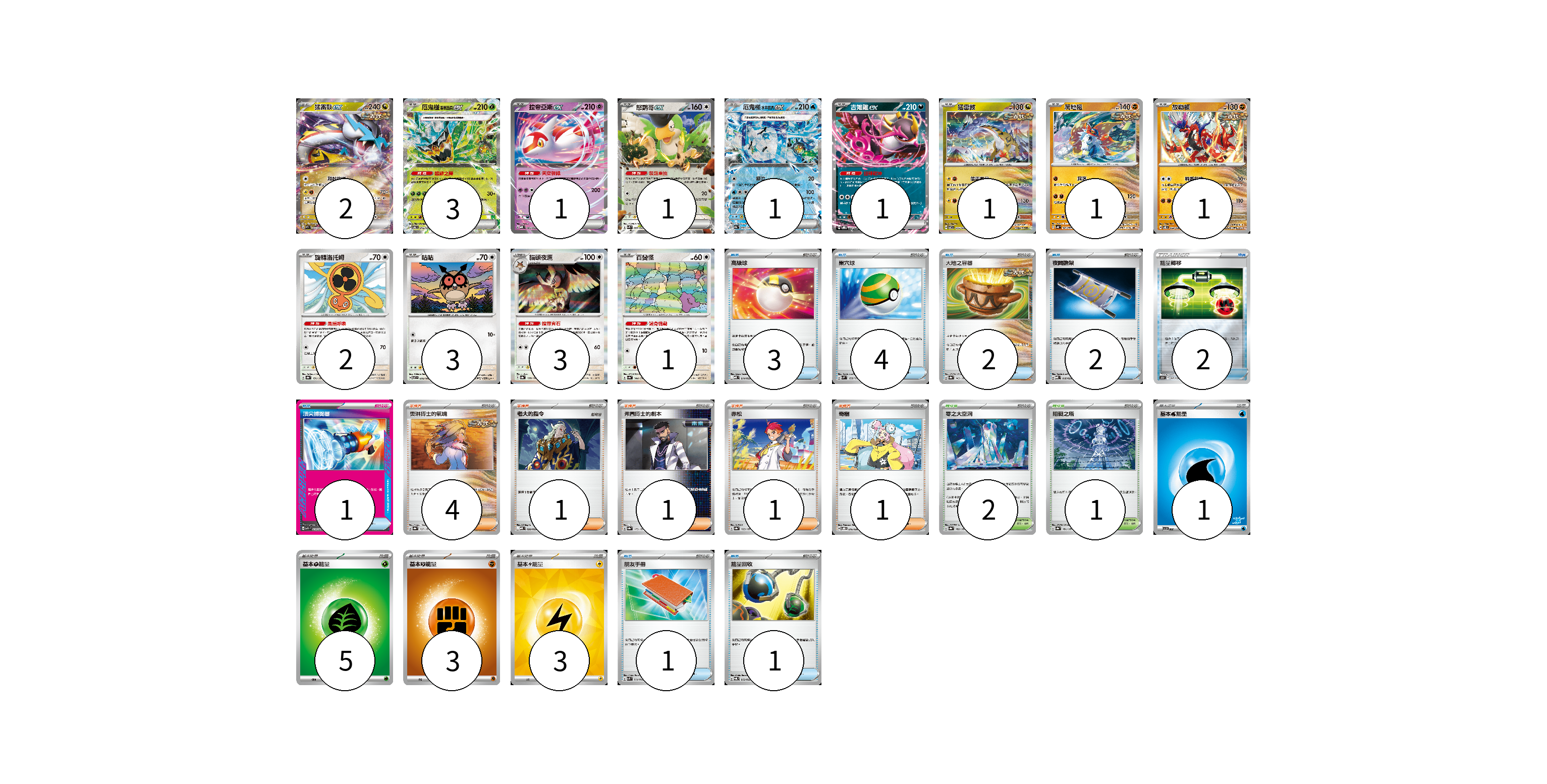 牌組構築方案 以此牌組為基礎新構築牌組 顯示卡面 顯示列表 寶可夢卡(21) 2 3 1 1 1 1 1 1 1 2 3 3 1 物品卡(16) 3 4 2 2 2 1 1 1 支援者卡(8) 4 1 1 1 1 競技場卡(3) 2 1 能量卡(12) 1 5 3 3 寶可夢卡(21) 卡牌名稱 張數 卡牌名稱 張數 猛雷鼓ex SV5K 053/071 02 厄鬼椪 碧草面具ex SV6 016/101 03 拉帝亞斯ex MBD 003/022 01 怒鸚哥ex SVK 006/042 01 厄鬼椪 水井面具ex SV8a 050/187 01 吉雉雞ex SVOD 004/020 01 猛雷鼓 SV7 075/102 01 爬地翅 SV4K 041/066 01 故勒頓 SV8 069/106 01 旋轉洛托姆 SV8a 131/187 02 咕咕 SV7 076/102 03 貓頭夜鷹 SV8a 128/187 03 百變怪 SV4a 144/190 01 物品卡(16) 卡牌名稱 張數 卡牌名稱 張數 高級球 MBD 014/022 03 巢穴球 SVM 133/175 04 大地之容器 SV8a 143/187 02 夜間擔架 MBD 016/022 02 能量轉移 SO 017/030 02 頂尖捕捉器 MBG 014/022 01 朋友手冊 SVK 014/042 01 能量回收 SVQL 012/022 01 支援者卡(8) 卡牌名稱 張數 卡牌名稱 張數 奧琳博士的氣魄 SV8a 167/187 04 老大的指令 MBD 020/022 01 弗圖博士的劇本 SV8a 175/187 01 赤松 SV8a 163/187 01 奇樹 SVOD 016/020 01 競技場卡(3) 卡牌名稱 張數 卡牌名稱 張數 零之大空洞 SV8a 182/187 02 阻礙之塔 SV8a 181/187 01 能量卡(12) 卡牌名稱 張數 卡牌名稱 張數 基本【水】能量 SVI WAT 01 基本【草】能量 M-P GRA 05 基本【鬥】能量 M-P FIG 03 基本【雷】能量 SVQP LIG 03 以此牌組為基礎新構築牌組 牌組編碼 lKfChq-zuqSQc-aMocef copy 列印牌組單 牌組編碼已複製 分享至SNS