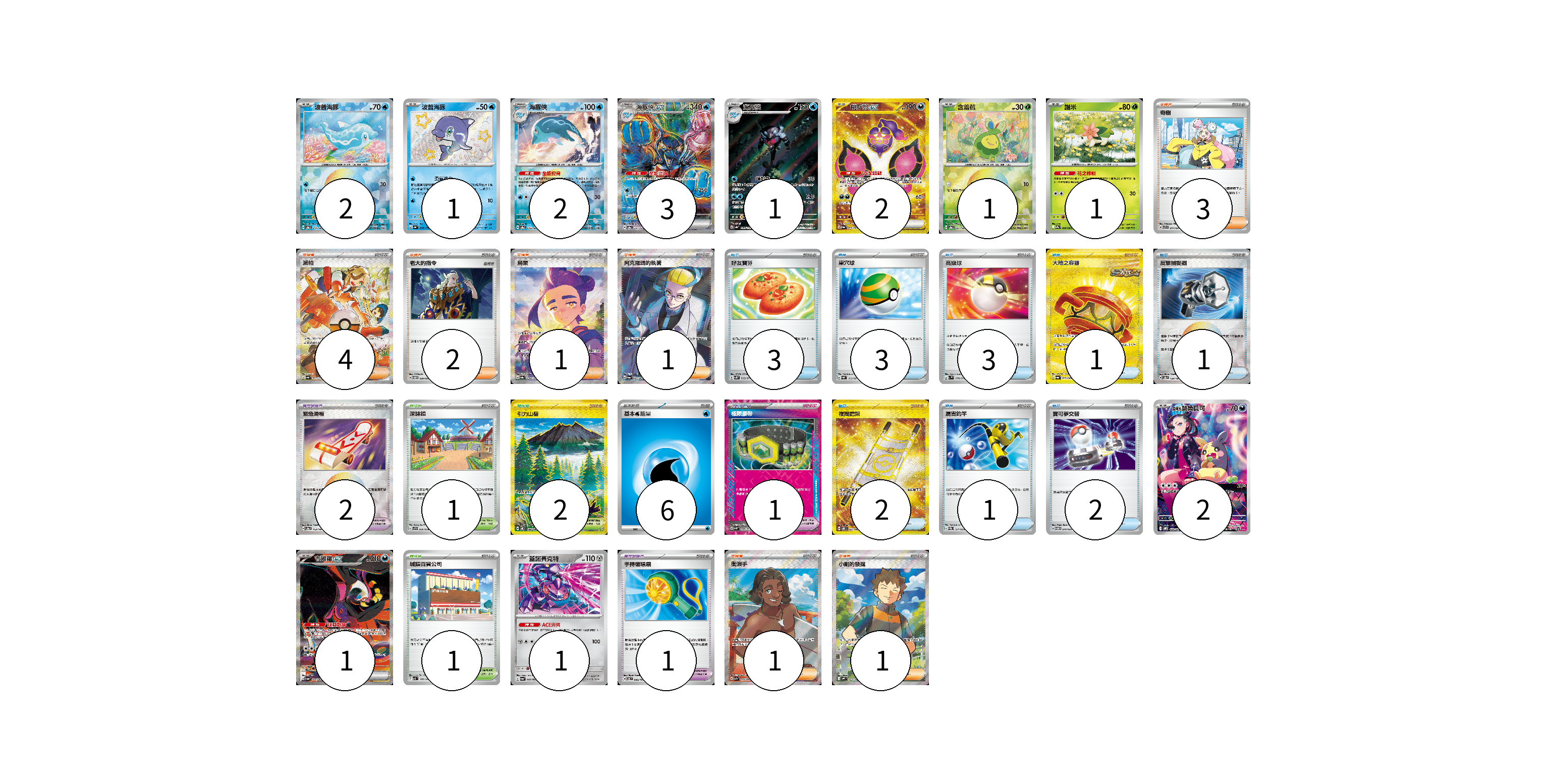 牌組構築方案 以此牌組為基礎新構築牌組 顯示卡面 顯示列表 寶可夢卡(17) 2 1 2 3 1 2 1 1 2 1 1 寶可夢道具(4) 2 1 1 物品卡(16) 3 3 3 1 1 2 1 2 支援者卡(13) 3 4 2 1 1 1 1 競技場卡(4) 1 2 1 能量卡(6) 6 寶可夢卡(17) 卡牌名稱 張數 卡牌名稱 張數 波普海豚 SV8a 044/187 02 波普海豚 SV4a 228/190 01 海豚俠 SV8a 045/187 02 海豚俠ex SV8a 207/187 03 海豚俠 SV4a 339/190 01 桃歹郎ex SV6a 092/064 02 含羞苞 SV8a 001/187 01 謝米 SV9a 006/063 01 <瑪俐的>莫魯貝可 SVOM 022/021 02 吉雉雞ex SV6a 089/064 01 蓋諾賽克特 SV6a 040/064 01 寶可夢道具(4) 卡牌名稱 張數 卡牌名稱 張數 緊急滑板 SV8a 153/187 02 極限腰帶 SV5K 066/071 01 手持循環扇 SV6 095/101 01 物品卡(16) 卡牌名稱 張數 卡牌名稱 張數 好友寶芬 SV5K 063/071 03 巢穴球 SVAL 012/021 03 高級球 SV1V 070/078 03 大地之容器 SV6a 093/064 01 反擊捕捉器 SV8a 139/187 01 夜間擔架 SV8 137/106 02 厲害釣竿 SVEM 011/020 01 寶可夢交替 SVTM 014/022 02 支援者卡(13) 卡牌名稱 張數 卡牌名稱 張數 奇樹 SVTR 017/021 03 派帕 SV4a 353/190 04 老大的指令 SVTM 020/022 02 烏栗 SV8a 230/187 01 阿克羅瑪的執著 SV6a 083/064 01 衝浪手 SV7a 084/064 01 小剛的發掘 SV9 123/100 01 競技場卡(4) 卡牌名稱 張數 卡牌名稱 張數 深缽鎮 SVF 036/038 01 引力山岳 SV8 138/106 02 城鎮百貨公司 SV3 107/108 01 能量卡(6) 卡牌名稱 張數 卡牌名稱 張數 基本【水】能量 SVF WAT 06 以此牌組為基礎新構築牌組 牌組編碼 lMbVSv-GSynXn-rGyXot copy 列印牌組單 牌組編碼已複製 分享至SNS