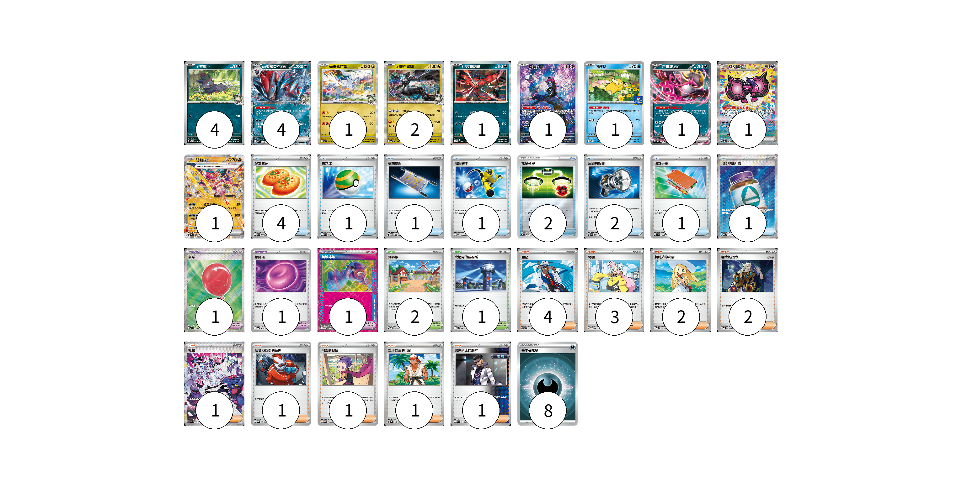 牌組構築方案 以此牌組為基礎新構築牌組 顯示卡面 顯示列表 寶可夢卡(17) 4 4 1 2 1 1 1 1 1 1 寶可夢道具(3) 1 1 1 物品卡(13) 4 1 1 1 2 2 1 1 支援者卡(16) 4 3 2 2 1 1 1 1 1 競技場卡(3) 2 1 能量卡(8) 8 寶可夢卡(17) 卡牌名稱 張數 卡牌名稱 張數 N的索羅亞 SV9 060/100 04 N的索羅亞克ex SV9 061/100 04 N的萊希拉姆 SV9 074/100 01 N的捷克羅姆 M2a 129/193 02 伊裴爾塔爾 M1L 040/063 01 願增猿 SV6 107/101 01 可達鴨 SV-P 220/SV-P 01 吉雉雞ex SVOM 009/021 01 桃歹郎ex SV8a 219/187 01 胡帕ex SV3a 029/062 01 寶可夢道具(3) 卡牌名稱 張數 卡牌名稱 張數 氣球 M1L 084/063 01 鎖鏈糬 SV8a 154/187 01 英雄斗篷 SV5M 064/071 01 物品卡(13) 卡牌名稱 張數 卡牌名稱 張數 好友寶芬 SVK 015/042 04 巢穴球 SVM 133/175 01 夜間擔架 M2a 159/193 01 厲害釣竿 SVTL 009/021 01 能量轉移 SO 017/030 02 反擊捕捉器 SVK 009/042 02 朋友手冊 SV1S 069/078 01 N的PP提升劑 M2a 214/193 01 支援者卡(16) 卡牌名稱 張數 卡牌名稱 張數 席藍 SV8 102/106 04 奇樹 SVOD 016/020 03 莉莉艾的決意 M2a 175/193 02 老大的指令 MBD 020/022 02 枇琶 SV5K 096/071 01 庫瑟洛斯奇的企圖 SV6a 062/064 01 阿杏的秘招 SV8a 166/187 01 空手道王的演練 SVM 149/175 01 弗圖博士的劇本 SVK 034/042 01 競技場卡(3) 卡牌名稱 張數 卡牌名稱 張數 深缽鎮 SVK 039/042 02 火箭隊的監視塔 M2a 189/193 01 能量卡(8) 卡牌名稱 張數 卡牌名稱 張數 基本惡能量 SLD DAR 08 以此牌組為基礎新構築牌組 牌組編碼 lMrGql-tptriO-ztWZUm copy 列印牌組單 牌組編碼已複製 分享至SNS