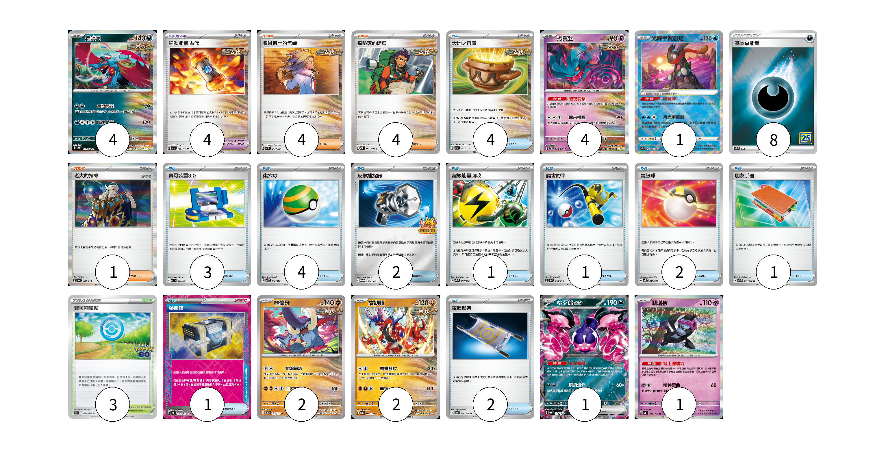 牌組構築方案 以此牌組為基礎新構築牌組 顯示卡面 顯示列表 寶可夢卡(15) 4 4 1 2 2 1 1 寶可夢道具(4) 4 物品卡(21) 4 3 4 2 1 1 2 1 1 2 支援者卡(9) 4 4 1 競技場卡(3) 3 能量卡(8) 8 寶可夢卡(15) 卡牌名稱 張數 卡牌名稱 張數 轟鳴月 SV5K 051/071 04 振翼髮 SV5K 033/071 04 光輝甲賀忍蛙 S9a 026/067 01 雄偉牙 SV5K 042/071 02 故勒頓 SV8 069/106 02 桃歹郎ex SV6a 039/064 01 願增猿 SV6 055/101 01 寶可夢道具(4) 卡牌名稱 張數 卡牌名稱 張數 驅勁能量 古代 SV5K 065/071 04 物品卡(21) 卡牌名稱 張數 卡牌名稱 張數 大地之容器 SVHK 011/022 04 寶可裝置3.0 SVEL 014/020 03 巢穴球 SVHK 012/022 04 反擊捕捉器 SV-P 083/SV-P 02 超級能量回收 SV4a 157/190 01 厲害釣竿 SV4a 158/190 01 高級球 SVHK 013/022 02 朋友手冊 SV1S 069/078 01 秘密箱 SV6 092/101 01 夜間擔架 SV6a 056/064 02 支援者卡(9) 卡牌名稱 張數 卡牌名稱 張數 奧琳博士的氣魄 SVHK 017/022 04 探險家的嚮導 SV5K 067/071 04 老大的指令 SV4a 181/190 01 競技場卡(3) 卡牌名稱 張數 卡牌名稱 張數 寶可補給站 S10b 071/071 03 能量卡(8) 卡牌名稱 張數 卡牌名稱 張數 基本惡能量 S8a DAR 08 以此牌組為基礎新構築牌組 牌組編碼 lRofaq-lHkQxA-vyYjSu copy 列印牌組單 牌組編碼已複製 分享至SNS