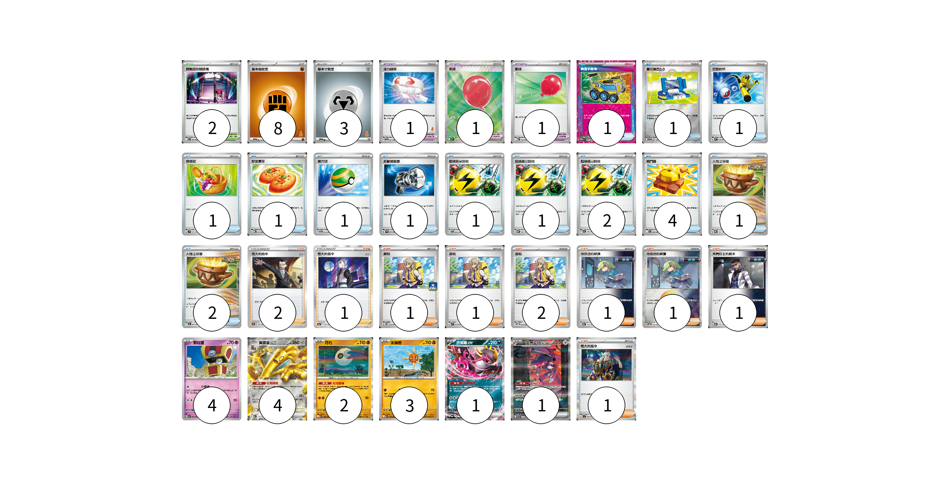 牌組構築方案 以此牌組為基礎新構築牌組 顯示卡面 顯示列表 寶可夢卡(15) 4 4 2 3 1 1 寶可夢道具(3) 1 1 1 物品卡(18) 1 1 1 1 1 1 1 1 1 2 4 1 2 支援者卡(11) 2 1 1 1 2 1 1 1 1 競技場卡(2) 2 能量卡(11) 8 3 寶可夢卡(15) 卡牌名稱 張數 卡牌名稱 張數 索財靈 SV7a 024/064 04 賽富豪ex SV8a 117/187 04 月石 M1L 026/063 02 太陽岩 M1L 027/063 03 吉雉雞ex SV8a 104/187 01 蓋諾賽克特ex SV11B 172/086 01 寶可夢道具(3) 卡牌名稱 張數 卡牌名稱 張數 活力頭帶 SVI 057/066 01 氣球 M1L 084/063 01 氣球 MBG 019/022 01 物品卡(18) 卡牌名稱 張數 卡牌名稱 張數 貴重手推車 SVK 020/042 01 寶可裝置3.0 SV11B 081/086 01 厲害釣竿 SV2P 066/071 01 野餐籃 SV1V 071/078 01 好友寶芬 MBG 011/022 01 巢穴球 SVTS 013/022 01 反擊捕捉器 SV4M 059/066 01 超級能量回收 SVEL 009/020 01 超級能量回收 SV8a 141/187 01 超級能量回收 SV4a 157/190 02 戰鬥鑼 M1L 059/063 04 大地之容器 SV8a 143/187 01 大地之容器 SV4K 060/066 02 支援者卡(11) 卡牌名稱 張數 卡牌名稱 張數 老大的指令(坂木) SC1D 161/164 02 老大的指令(赤日) S12a 161/172 01 派帕 SV-P 213/SV-P 01 派帕 SVK 035/042 01 派帕 SVOD 018/020 02 暗碼迷的解讀 SV8a 165/187 01 暗碼迷的解讀 SV8a 165/187 01 弗圖博士的劇本 SV8a 175/187 01 老大的指令 SV1a 069/073 01 競技場卡(2) 卡牌名稱 張數 卡牌名稱 張數 對戰圓形競技場 M2 079/080 02 能量卡(11) 卡牌名稱 張數 卡牌名稱 張數 基本【鬥】能量 SVI FIG 08 基本【鋼】能量 SVI MET 03 以此牌組為基礎新構築牌組 牌組編碼 lSZLvJ-DrKqkt-UlijqT copy 列印牌組單 牌組編碼已複製 分享至SNS