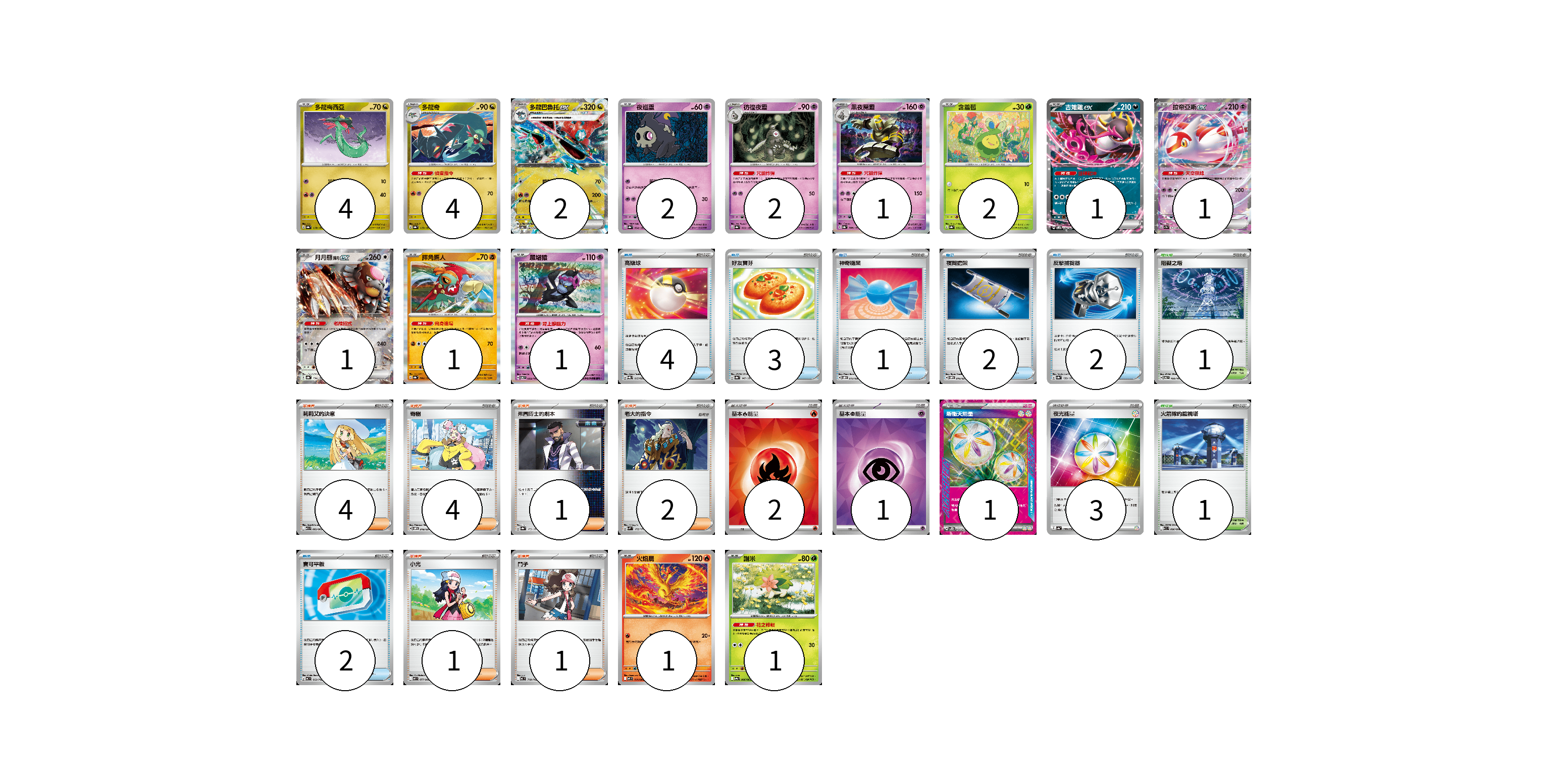 牌組構築方案 以此牌組為基礎新構築牌組 顯示卡面 顯示列表 寶可夢卡(24) 4 4 2 2 2 1 2 1 1 1 1 1 1 1 物品卡(14) 4 3 1 2 2 2 支援者卡(13) 4 4 1 2 1 1 競技場卡(2) 1 1 能量卡(7) 2 1 1 3 寶可夢卡(24) 卡牌名稱 張數 卡牌名稱 張數 多龍梅西亞 SV8a 118/187 04 多龍奇 SV8a 119/187 04 多龍巴魯托ex SV6 081/101 02 夜巡靈 SV8a 064/187 02 彷徨夜靈 SV8a 065/187 02 黑夜魔靈 SV8a 066/187 01 含羞苞 SV8a 001/187 02 吉雉雞ex SVOM 009/021 01 拉帝亞斯ex SV7a 019/064 01 月月熊 赫月ex SV8a 134/187 01 摔角鷹人 SV8a 084/187 01 願增猿 SV6 055/101 01 火焰鳥 M2 014/080 01 謝米 SV9a 006/063 01 物品卡(14) 卡牌名稱 張數 卡牌名稱 張數 高級球 SVQL 015/022 04 好友寶芬 SV8a 147/187 03 神奇糖果 SVOD 013/020 01 夜間擔架 SVOM 016/021 02 反擊捕捉器 SV8a 139/187 02 寶可平板 MC 662/742 02 支援者卡(13) 卡牌名稱 張數 卡牌名稱 張數 莉莉艾的決意 M1L 062/063 04 奇樹 SVOM 018/021 04 弗圖博士的劇本 SV8a 175/187 01 老大的指令 SVM 172/175 02 小光 M2 077/080 01 鬥子 MC 718/742 01 競技場卡(2) 卡牌名稱 張數 卡牌名稱 張數 阻礙之塔 SV6 100/101 01 火箭隊的監視塔 SV10 096/098 01 能量卡(7) 卡牌名稱 張數 卡牌名稱 張數 基本【火】能量 SVQL FIR 02 基本【超】能量 SVOD PSY 01 新衝天能量 SV5K 071/071 01 夜光能量 SV4a 190/190 03 以此牌組為基礎新構築牌組 牌組編碼 lTtrAt-itqevy-HdibIH copy 列印牌組單 牌組編碼已複製 分享至SNS