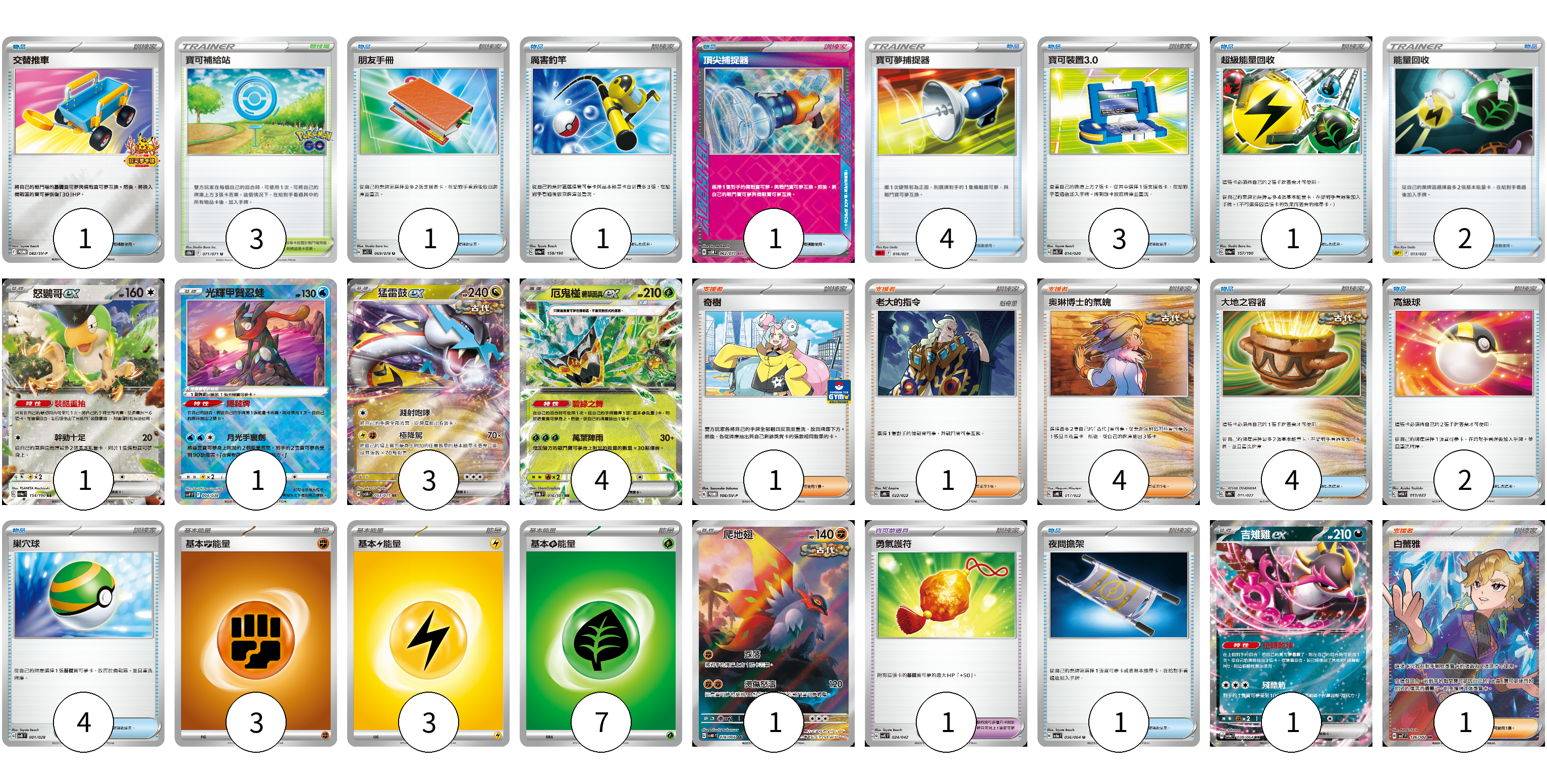 牌組構築方案 以此牌組為基礎新構築牌組 顯示卡面 顯示列表 寶可夢卡(11) 1 1 3 4 1 1 寶可夢道具(1) 1 物品卡(25) 1 1 1 1 4 3 1 2 4 2 4 1 支援者卡(7) 1 1 4 1 競技場卡(3) 3 能量卡(13) 3 3 7 寶可夢卡(11) 卡牌名稱 張數 卡牌名稱 張數 怒鸚哥ex SV4a 154/190 01 光輝甲賀忍蛙 SVF 004/038 01 猛雷鼓ex SV5K 053/071 03 厄鬼椪 碧草面具ex SV6 016/101 04 爬地翅 SV4K 074/066 01 吉雉雞ex SV6a 038/064 01 寶可夢道具(1) 卡牌名稱 張數 卡牌名稱 張數 勇氣護符 SVK 024/042 01 物品卡(25) 卡牌名稱 張數 卡牌名稱 張數 交替推車 SV-P 082/SV-P 01 朋友手冊 SV1S 069/078 01 厲害釣竿 SV4a 158/190 01 頂尖捕捉器 SV5M 062/071 01 寶可夢捕捉器 SDL 016/021 04 寶可裝置3.0 SVEL 014/020 03 超級能量回收 SV4a 157/190 01 能量回收 SDP 013/022 02 大地之容器 SVHK 011/022 04 高級球 SVHM 013/022 02 巢穴球 SVB 001/028 04 夜間擔架 SV6a 056/064 01 支援者卡(7) 卡牌名稱 張數 卡牌名稱 張數 奇樹 SV-P 106/SV-P 01 老大的指令 SVHK 022/022 01 奧琳博士的氣魄 SVHK 017/022 04 白蕾雅 SV7 126/102 01 競技場卡(3) 卡牌名稱 張數 卡牌名稱 張數 寶可補給站 S10b 071/071 03 能量卡(13) 卡牌名稱 張數 卡牌名稱 張數 基本鬥能量 sv-p FIG 03 基本【雷】能量 SVHM LIG 03 基本草能量 sv-p GRA 07 以此牌組為基礎新構築牌組 牌組編碼 lTyXcf-CfXIdf-BiVPso copy 列印牌組單 牌組編碼已複製 分享至SNS