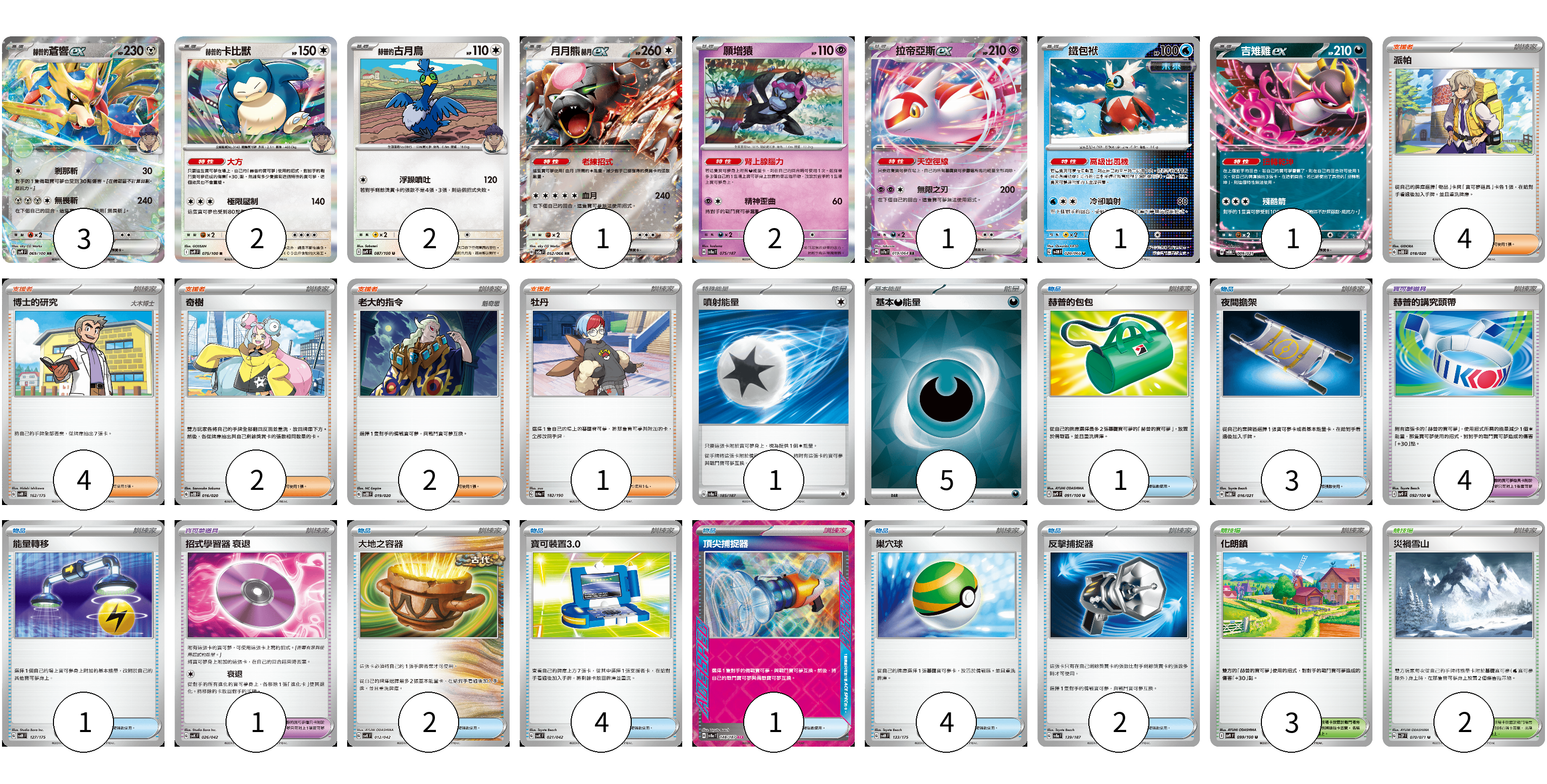 牌組構築方案 以此牌組為基礎新構築牌組 顯示卡面 顯示列表 寶可夢卡(13) 3 2 2 1 2 1 1 1 寶可夢道具(5) 4 1 物品卡(18) 1 3 1 2 4 1 4 2 支援者卡(13) 4 4 2 2 1 競技場卡(5) 3 2 能量卡(6) 1 5 寶可夢卡(13) 卡牌名稱 張數 卡牌名稱 張數 赫普的蒼響ex SV9 069/100 03 赫普的卡比獸 SV9 075/100 02 赫普的古月鳥 SV9 087/100 02 月月熊 赫月 ex SV5a 052/066 01 願增猿 SV8a 075/187 02 拉帝亞斯ex SV7a 019/064 01 鐵包袱 SV4M 020/066 01 吉雉雞ex SVOM 009/021 01 寶可夢道具(5) 卡牌名稱 張數 卡牌名稱 張數 赫普的講究頭帶 SV9 092/100 04 招式學習器 衰退 SVK 026/042 01 物品卡(18) 卡牌名稱 張數 卡牌名稱 張數 赫普的包包 SV9 091/100 01 夜間擔架 SVOM 016/021 03 能量轉移 SVM 127/175 01 大地之容器 SVK 012/042 02 寶可裝置3.0 SVK 021/042 04 頂尖捕捉器 SV8a 148/187 01 巢穴球 SVM 133/175 04 反擊捕捉器 SV8a 139/187 02 支援者卡(13) 卡牌名稱 張數 卡牌名稱 張數 派帕 SVOD 018/020 04 博士的研究 SVM 162/175 04 奇樹 SVOD 016/020 02 老大的指令 SVOD 019/020 02 牡丹 SV4a 182/190 01 競技場卡(5) 卡牌名稱 張數 卡牌名稱 張數 化朗鎮 SV9 099/100 03 災禍雪山 SV2P 070/071 02 能量卡(6) 卡牌名稱 張數 卡牌名稱 張數 噴射能量 SV8a 185/187 01 基本【惡】能量 SVOM DAR 05 以此牌組為基礎新構築牌組 牌組編碼 lUPzTR-MoTWRi-KJZJlQ copy 列印牌組單 牌組編碼已複製 分享至SNS