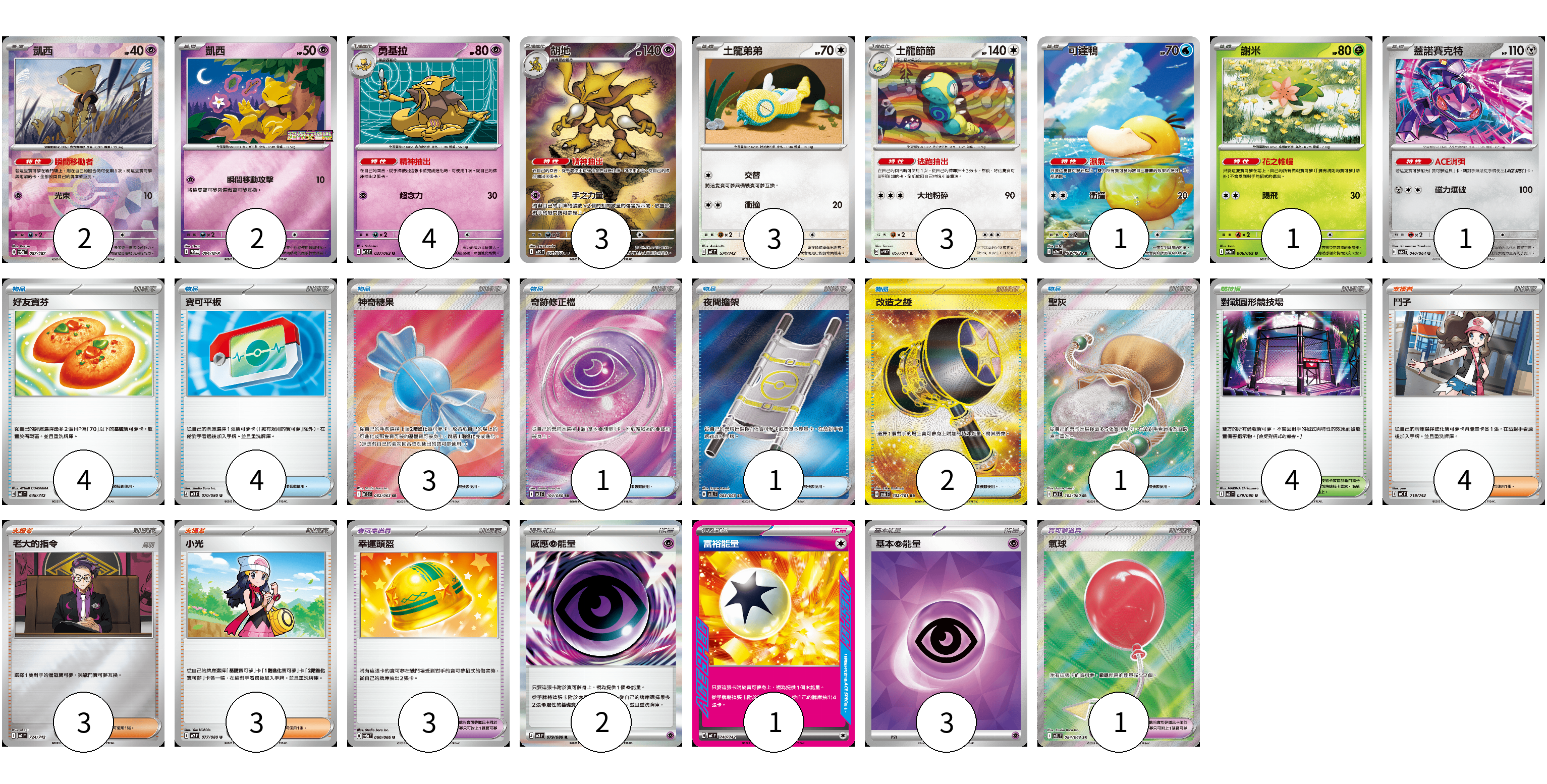 牌組構築方案 以此牌組為基礎新構築牌組 顯示卡面 顯示列表 寶可夢卡(20) 2 2 4 3 3 3 1 1 1 寶可夢道具(4) 3 1 物品卡(16) 4 4 3 1 1 2 1 支援者卡(10) 4 3 3 競技場卡(4) 4 能量卡(6) 2 1 3 寶可夢卡(20) 卡牌名稱 張數 卡牌名稱 張數 凱西 SV8a 057/187 02 凱西 M-P 004/M-P 02 勇基拉 M1S 037/063 04 胡地 M1S 071/063 03 土龍弟弟 MC 574/742 03 土龍節節 SV5K 057/071 03 可達鴨 M2a 199/193 01 謝米 SV9a 006/063 01 蓋諾賽克特 SV6a 040/064 01 寶可夢道具(4) 卡牌名稱 張數 卡牌名稱 張數 幸運頭盔 SV5a 060/066 03 氣球 M1L 084/063 01 物品卡(16) 卡牌名稱 張數 卡牌名稱 張數 好友寶芬 MC 648/742 04 寶可平板 M3 070/080 04 神奇糖果 M1S 082/063 03 奇跡修正檔 M3 104/080 01 夜間擔架 M1L 083/063 01 改造之錘 SV6 132/101 02 聖灰 M3 102/080 01 支援者卡(10) 卡牌名稱 張數 卡牌名稱 張數 鬥子 MC 718/742 04 老大的指令 MC 724/742 03 小光 M2 077/080 03 競技場卡(4) 卡牌名稱 張數 卡牌名稱 張數 對戰圓形競技場 M2 079/080 04 能量卡(6) 卡牌名稱 張數 卡牌名稱 張數 感應【超】能量 M3 079/080 02 富裕能量 MC 740/742 01 基本【超】能量 SVOD PSY 03 以此牌組為基礎新構築牌組 牌組編碼 lUQdji-ZSrFAe-USjvrv copy 列印牌組單 牌組編碼已複製 分享至SNS