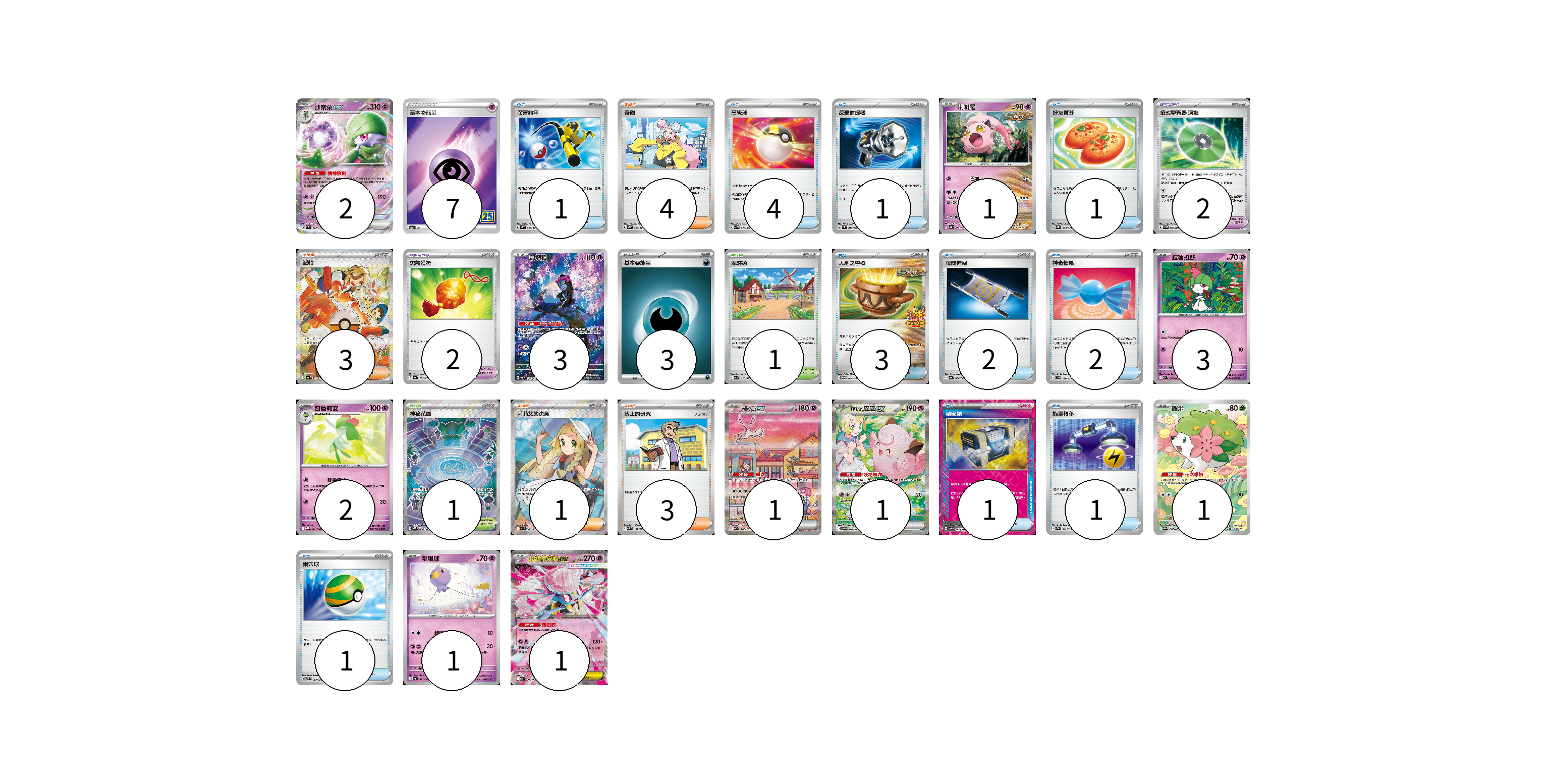 牌組構築方案 以此牌組為基礎新構築牌組 顯示卡面 顯示列表 寶可夢卡(16) 2 1 3 3 2 1 1 1 1 1 寶可夢道具(4) 2 2 物品卡(17) 1 4 1 1 3 2 2 1 1 1 支援者卡(11) 4 3 1 3 競技場卡(2) 1 1 能量卡(10) 7 3 寶可夢卡(16) 卡牌名稱 張數 卡牌名稱 張數 沙奈朵ex SV1S 028/078 02 吼叫尾 SV4K 032/066 01 願增猿 SV6 107/101 03 拉魯拉絲 M1S 040/063 03 奇魯莉安 M1S 041/063 02 夢幻ex SV2a 205/165 01 莉莉艾的皮皮ex SV9 126/100 01 謝米 SV9a 066/063 01 飄飄球 SV4a 083/190 01 超級蒂安希ex MBD 006/022 01 寶可夢道具(4) 卡牌名稱 張數 卡牌名稱 張數 招式學習器 演進 SV4M 063/066 02 勇氣護符 SV4a 169/190 02 物品卡(17) 卡牌名稱 張數 卡牌名稱 張數 厲害釣竿 SV2P 066/071 01 高級球 SV1V 070/078 04 反擊捕捉器 SV4M 059/066 01 好友寶芬 SV5K 063/071 01 大地之容器 SV-P 084/SV-P 03 夜間擔架 SV6a 056/064 02 神奇糖果 SVD 120/139 02 秘密箱 SV6 092/101 01 能量轉移 SVAM 012/023 01 巢穴球 SVTS 013/022 01 支援者卡(11) 卡牌名稱 張數 卡牌名稱 張數 奇樹 SV2D 069/071 04 派帕 SV4a 353/190 03 莉莉艾的決意 M1L 086/063 01 博士的研究 SVM 162/175 03 競技場卡(2) 卡牌名稱 張數 卡牌名稱 張數 深缽鎮 SV1a 070/073 01 神秘花園 M1S 086/063 01 能量卡(10) 卡牌名稱 張數 卡牌名稱 張數 基本超能量 S8a PSY 07 基本【惡】能量 SVF DAR 03 以此牌組為基礎新構築牌組 牌組編碼 lUxmcX-tHZmuz-yeJWCZ copy 列印牌組單 牌組編碼已複製 分享至SNS