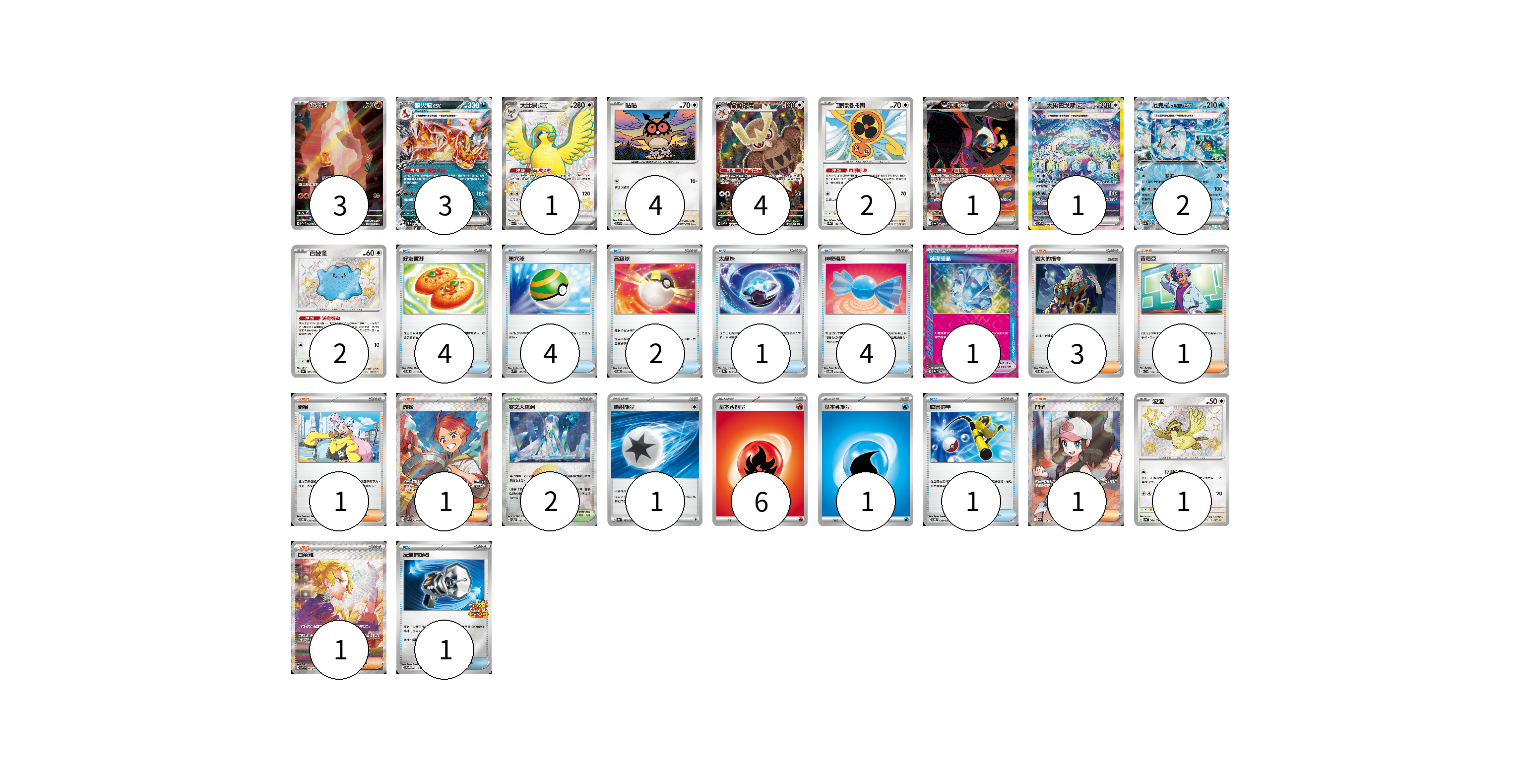 牌組構築方案 以此牌組為基礎新構築牌組 顯示卡面 顯示列表 寶可夢卡(24) 3 3 1 4 4 2 1 1 2 2 1 寶可夢道具(1) 1 物品卡(17) 4 4 2 1 4 1 1 支援者卡(8) 3 1 1 1 1 1 競技場卡(2) 2 能量卡(8) 1 6 1 寶可夢卡(24) 卡牌名稱 張數 卡牌名稱 張數 小火龍 SV2a 168/165 03 噴火龍ex SVTL 006/021 03 大比鳥ex SV4a 335/190 01 咕咕 SV7 076/102 04 貓頭夜鷹 SV7 114/102 04 旋轉洛托姆 SV8a 131/187 02 吉雉雞ex SV6a 089/064 01 太樂巴戈斯ex SV7 130/102 01 厄鬼椪 水井面具ex SV8a 050/187 02 百變怪 SV4a 309/190 02 波波 SV4a 304/190 01 寶可夢道具(1) 卡牌名稱 張數 卡牌名稱 張數 璀璨結晶 SV8a 152/187 01 物品卡(17) 卡牌名稱 張數 卡牌名稱 張數 好友寶芬 SVOD 011/020 04 巢穴球 SVM 133/175 04 高級球 SVOD 012/020 02 太晶珠 SV8a 145/187 01 神奇糖果 SVOD 013/020 04 厲害釣竿 SVOD 010/020 01 反擊捕捉器 SV-P 083/SV-P 01 支援者卡(8) 卡牌名稱 張數 卡牌名稱 張數 老大的指令 SVOD 019/020 03 吉尼亞 SVD 129/139 01 奇樹 SVOD 016/020 01 赤松 SV7 123/102 01 鬥子 SV11W 166/086 01 白蕾雅 SV7 132/102 01 競技場卡(2) 卡牌名稱 張數 卡牌名稱 張數 零之大空洞 SV8a 182/187 02 能量卡(8) 卡牌名稱 張數 卡牌名稱 張數 噴射能量 SV8a 185/187 01 基本火能量 sv-p FIR 06 基本水能量 sv-p WAT 01 以此牌組為基礎新構築牌組 牌組編碼 lWduwW-AKoEXg-dvpwLh copy 列印牌組單 牌組編碼已複製 分享至SNS