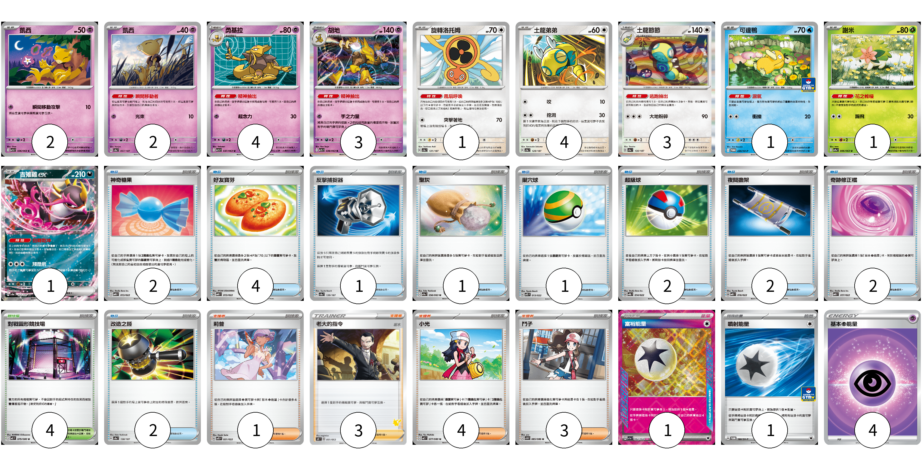 牌組構築方案 以此牌組為基礎新構築牌組 顯示卡面 顯示列表 寶可夢卡(22) 2 2 4 3 1 4 3 1 1 1 物品卡(17) 2 4 1 1 1 2 2 2 2 支援者卡(11) 1 3 4 3 競技場卡(4) 4 能量卡(6) 1 1 4 寶可夢卡(22) 卡牌名稱 張數 卡牌名稱 張數 凱西 M1S 036/063 02 凱西 SV8a 057/187 02 勇基拉 M1S 037/063 04 胡地 M1S 038/063 03 旋轉洛托姆 SV8a 131/187 01 土龍弟弟 SV8a 129/187 04 土龍節節 SV8a 130/187 03 可達鴨 SV-P 220/SV-P 01 謝米 SV9a 006/063 01 吉雉雞ex SV8a 104/187 01 物品卡(17) 卡牌名稱 張數 卡牌名稱 張數 神奇糖果 MBG 013/022 02 好友寶芬 MBD 013/022 04 反擊捕捉器 SV8a 139/187 01 聖灰 SV9a 056/063 01 巢穴球 SVTS 013/022 01 超級球 SVQL 014/022 02 夜間擔架 MBD 016/022 02 奇跡修正檔 MBD 017/022 02 改造之錘 SV8a 138/187 02 支援者卡(11) 卡牌名稱 張數 卡牌名稱 張數 莉普 SVTS 021/022 01 老大的指令(坂木) SH 051/053 03 小光 M2 077/080 04 鬥子 SV11W 085/086 03 競技場卡(4) 卡牌名稱 張數 卡牌名稱 張數 對戰圓形競技場 M2 079/080 04 能量卡(6) 卡牌名稱 張數 卡牌名稱 張數 富裕能量 SV7a 064/064 01 噴射能量 SV-P 180/SV-P 01 基本【超】能量 SI PSY 04 以此牌組為基礎新構築牌組 牌組編碼 lXxtbT-WHkkfv-dmuTFT copy 列印牌組單 牌組編碼已複製 分享至SNS
