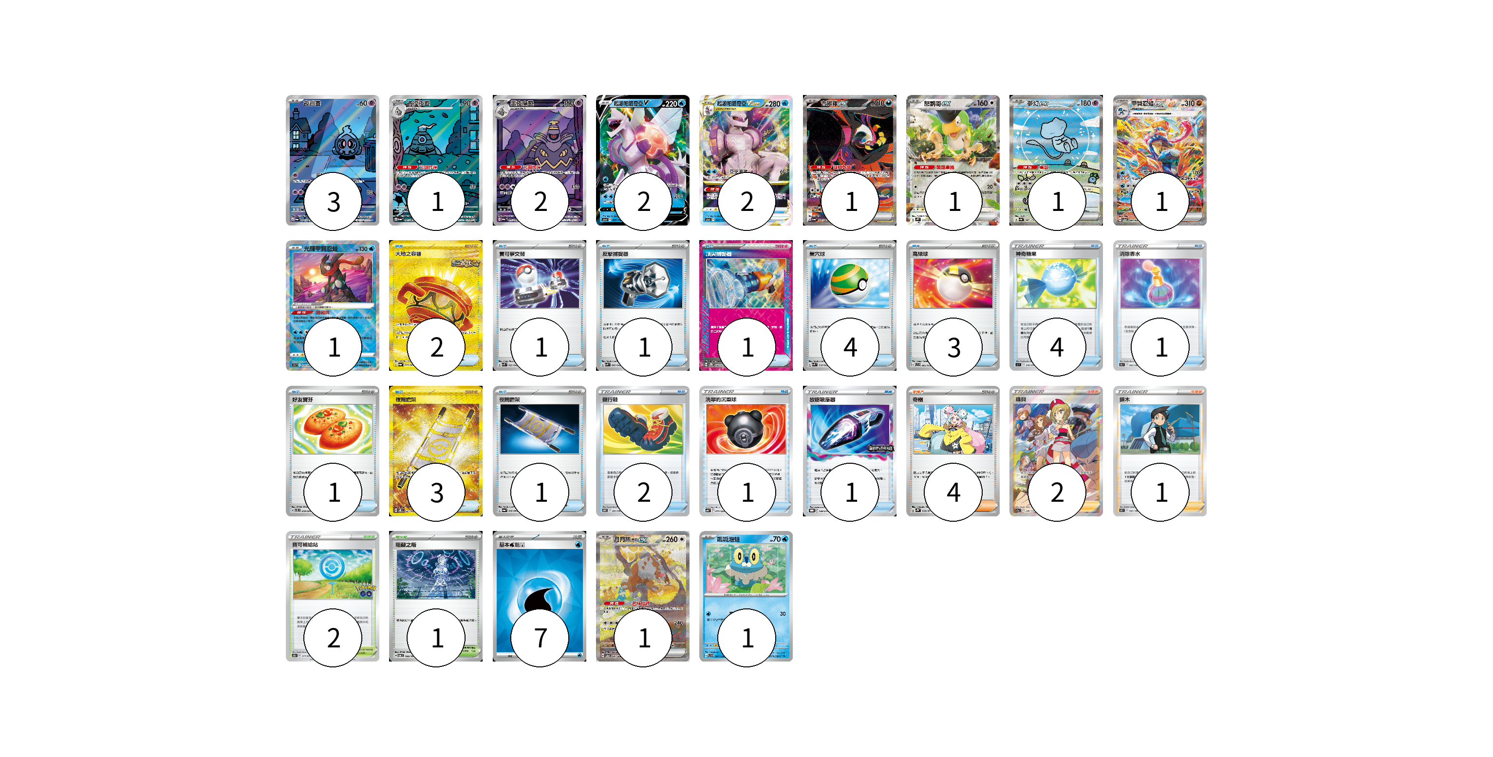 牌組構築方案 以此牌組為基礎新構築牌組 顯示卡面 顯示列表 寶可夢卡(17) 3 1 2 2 2 1 1 1 1 1 1 1 物品卡(26) 2 1 1 1 4 3 4 1 1 3 1 2 1 1 支援者卡(7) 4 2 1 競技場卡(3) 2 1 能量卡(7) 7 寶可夢卡(17) 卡牌名稱 張數 卡牌名稱 張數 夜巡靈 SV6a 068/064 03 彷徨夜靈 SV6a 069/064 01 黑夜魔靈 SV6a 070/064 02 起源帕路奇亞V S12a 027/172 02 起源帕路奇亞VSTAR S12a 028/172 02 吉雉雞ex SV6a 089/064 01 怒鸚哥ex SV2P 065/071 01 夢幻ex SV4a 347/190 01 甲賀忍蛙ex SV5a 090/066 01 光輝甲賀忍蛙 S9a 026/067 01 月月熊 赫月 ex SV5a 091/066 01 呱呱泡蛙 SVD 027/139 01 物品卡(26) 卡牌名稱 張數 卡牌名稱 張數 大地之容器 SV6a 093/064 02 寶可夢交替 SVK 022/042 01 反擊捕捉器 SVK 009/042 01 頂尖捕捉器 SV5M 062/071 01 巢穴球 SVK 016/042 04 高級球 SVB 002/028 03 神奇糖果 SI 376/414 04 消除香水 S9a 063/067 01 好友寶芬 SVTL 010/021 01 夜間擔架 SV8 137/106 03 夜間擔架 SV6a 056/064 01 健行鞋 S10D 061/067 02 洗翠的沉重球 SVB 014/028 01 放逐吸塵器 SV-P 139/SV-P 01 支援者卡(7) 卡牌名稱 張數 卡牌名稱 張數 奇樹 SV2D 069/071 04 珠貝 S12a 236/172 02 捩木 S11 097/100 01 競技場卡(3) 卡牌名稱 張數 卡牌名稱 張數 寶可補給站 S10b 071/071 02 阻礙之塔 SV6 100/101 01 能量卡(7) 卡牌名稱 張數 卡牌名稱 張數 基本【水】能量 SVK WAT 07 以此牌組為基礎新構築牌組 牌組編碼 lazoQF-MozRta-JpbGIa copy 列印牌組單 牌組編碼已複製 分享至SNS
