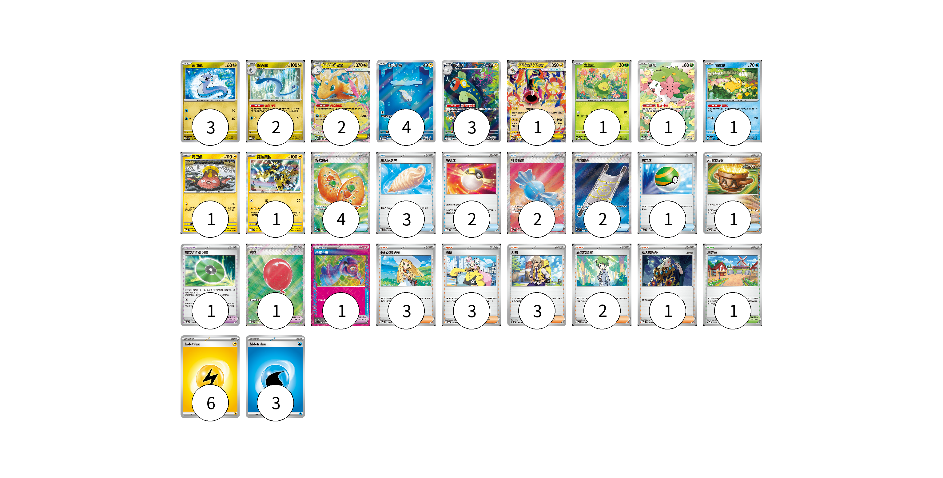 牌組構築方案 以此牌組為基礎新構築牌組 顯示卡面 顯示列表 寶可夢卡(20) 3 2 2 4 3 1 1 1 1 1 1 寶可夢道具(3) 1 1 1 物品卡(15) 4 3 2 2 2 1 1 支援者卡(12) 3 3 3 2 1 競技場卡(1) 1 能量卡(9) 6 3 寶可夢卡(20) 卡牌名稱 張數 卡牌名稱 張數 迷你龍 SV2a 147/165 03 哈克龍 M2a 125/193 02 超級快龍ex M2a 126/193 02 麻麻小魚 SV11B 117/086 04 麻麻鰻 SV11B 118/086 03 超級麻麻鰻魚王ex M2a 049/193 01 含羞苞 M2a 011/193 01 謝米 SV9a 066/063 01 可達鴨 M2a 032/193 01 泥巴魚 M2a 050/193 01 捷拉奧拉 M2a 055/193 01 寶可夢道具(3) 卡牌名稱 張數 卡牌名稱 張數 招式學習器 演進 SV8a 160/187 01 氣球 M1L 084/063 01 英雄斗篷 SV5M 064/071 01 物品卡(15) 卡牌名稱 張數 卡牌名稱 張數 好友寶芬 M1S 081/063 04 超大冰淇淋 M2 073/080 03 高級球 MBD 014/022 02 神奇糖果 M1S 082/063 02 夜間擔架 M1L 083/063 02 巢穴球 SVM 133/175 01 大地之容器 SV8a 143/187 01 支援者卡(12) 卡牌名稱 張數 卡牌名稱 張數 莉莉艾的決意 M2a 175/193 03 奇樹 SVOD 016/020 03 派帕 SV4a 180/190 03 滿充的體貼 M1S 060/063 02 老大的指令 MBD 020/022 01 競技場卡(1) 卡牌名稱 張數 卡牌名稱 張數 深缽鎮 SVK 039/042 01 能量卡(9) 卡牌名稱 張數 卡牌名稱 張數 基本雷能量 sv-p LIG 06 基本水能量 sv-p WAT 03 以此牌組為基礎新構築牌組 牌組編碼 lcYZZM-iUIQvd-xlsvBu copy 列印牌組單 牌組編碼已複製 分享至SNS