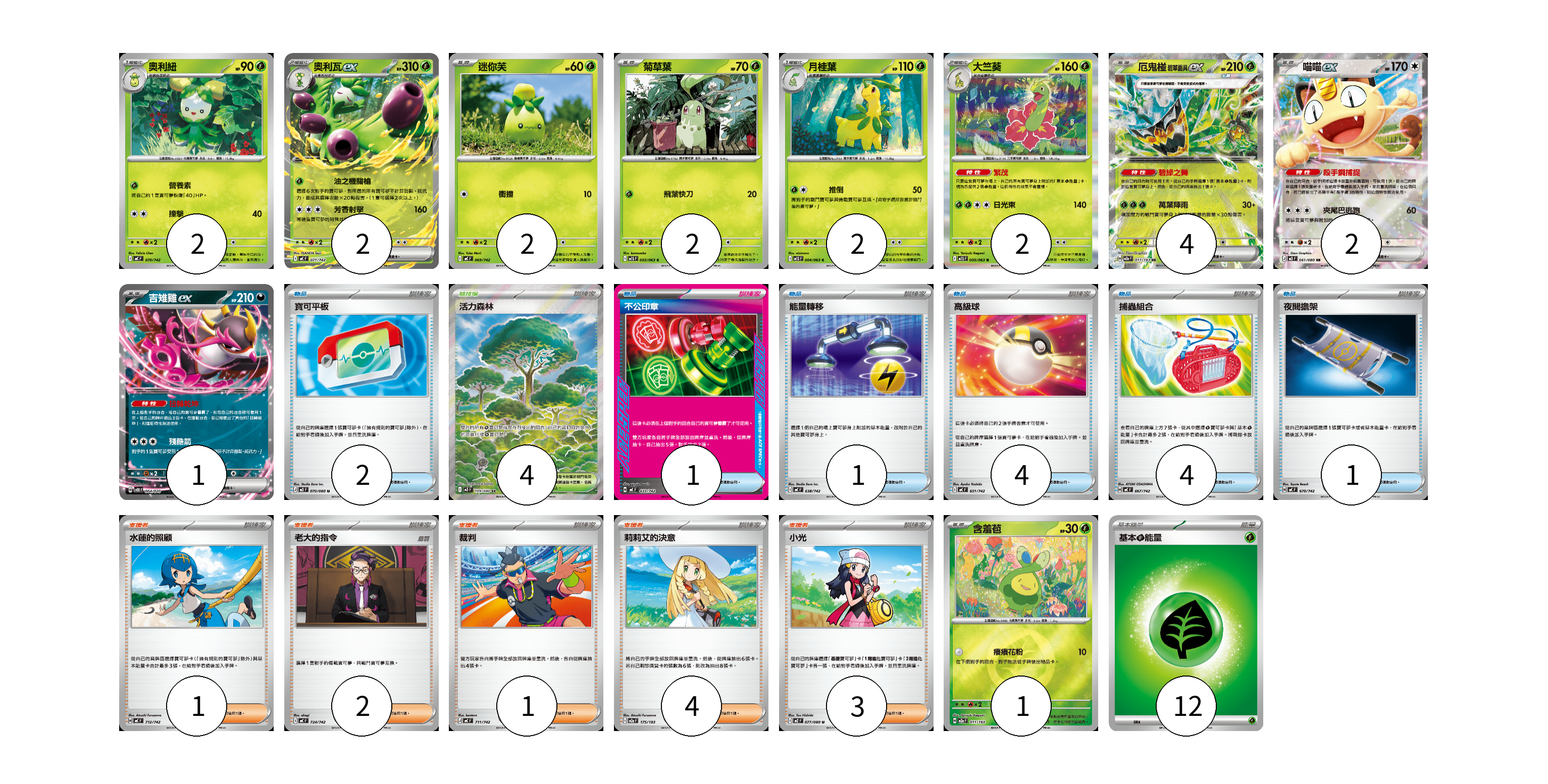 牌組構築方案 以此牌組為基礎新構築牌組 顯示卡面 顯示列表 寶可夢卡(20) 2 2 2 2 2 2 4 2 1 1 物品卡(13) 2 1 1 4 4 1 支援者卡(11) 1 2 1 4 3 競技場卡(4) 4 能量卡(12) 12 寶可夢卡(20) 卡牌名稱 張數 卡牌名稱 張數 奧利紐 MC 070/742 02 奧利瓦ex MC 071/742 02 迷你芙 MC 069/742 02 菊草葉 M1S 003/063 02 月桂葉 M1S 004/063 02 大竺葵 M1S 005/063 02 厄鬼椪 碧草面具ex M2a 017/193 04 喵喵ex M3 061/080 02 吉雉雞ex SVOD 004/020 01 含羞苞 M2a 011/193 01 物品卡(13) 卡牌名稱 張數 卡牌名稱 張數 寶可平板 M3 070/080 02 不公印章 MC 633/742 01 能量轉移 MC 638/742 01 高級球 MC 651/742 04 捕蟲組合 MC 667/742 04 夜間擔架 MC 670/742 01 支援者卡(11) 卡牌名稱 張數 卡牌名稱 張數 水蓮的照顧 MC 712/742 01 老大的指令 MC 724/742 02 裁判 MC 711/742 01 莉莉艾的決意 M2a 175/193 04 小光 M2 077/080 03 競技場卡(4) 卡牌名稱 張數 卡牌名稱 張數 活力森林 M3 109/080 04 能量卡(12) 卡牌名稱 張數 卡牌名稱 張數 基本【草】能量 MJ GRA 12 以此牌組為基礎新構築牌組 牌組編碼 ldeuUb-yHvfVH-LlTGff copy 列印牌組單 牌組編碼已複製 分享至SNS