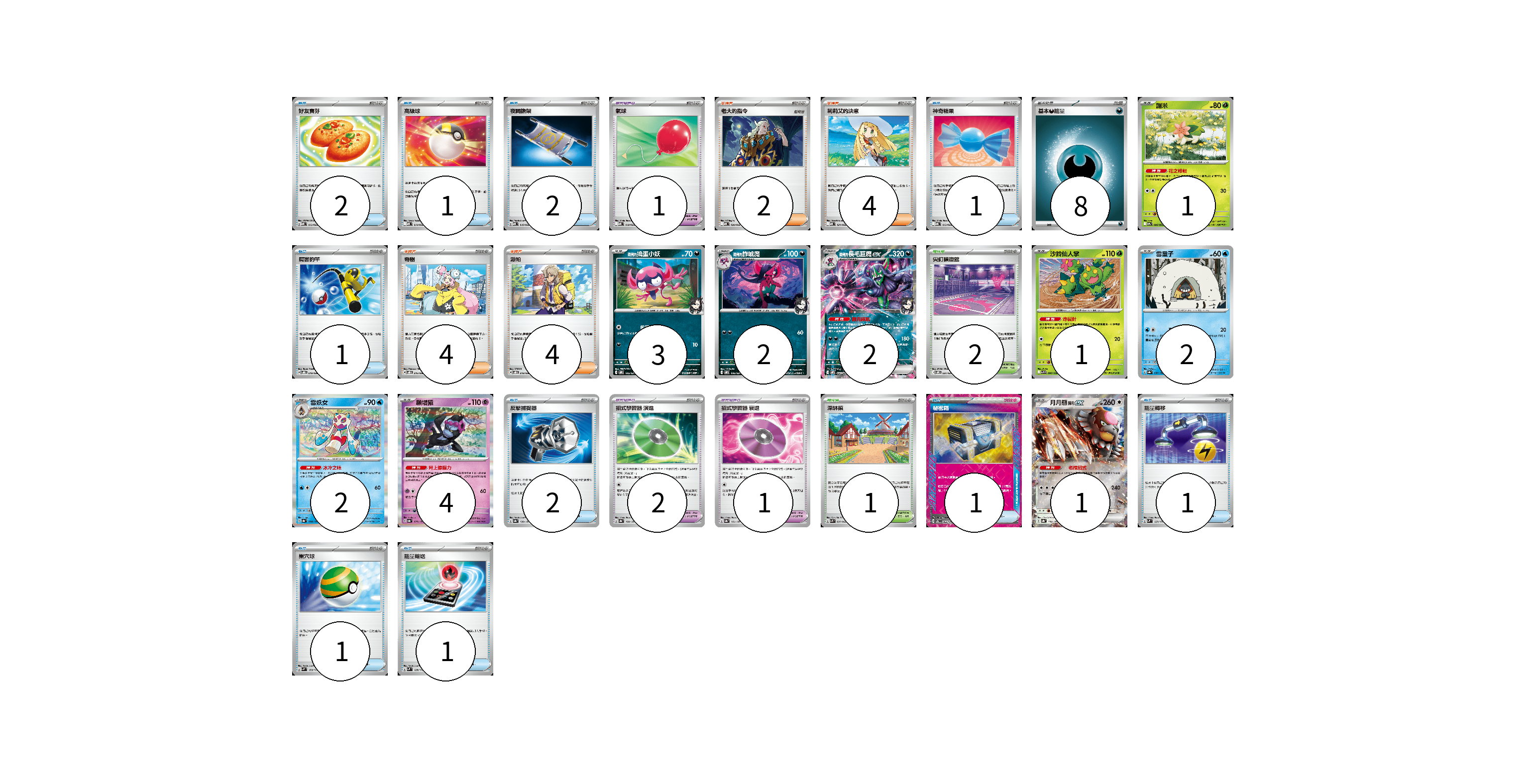 牌組構築方案 以此牌組為基礎新構築牌組 顯示卡面 顯示列表 寶可夢卡(18) 1 3 2 2 1 2 2 4 1 寶可夢道具(4) 1 2 1 物品卡(13) 2 1 2 1 1 2 1 1 1 1 支援者卡(14) 2 4 4 4 競技場卡(3) 2 1 能量卡(8) 8 寶可夢卡(18) 卡牌名稱 張數 卡牌名稱 張數 謝米 SV9a 006/063 01 <瑪俐的>搗蛋小妖 SVOM 005/021 03 <瑪俐的>詐唬魔 SVOM 006/021 02 <瑪俐的>長毛巨魔ex SVOM 007/021 02 沙鈴仙人掌 SV9 006/100 01 雪童子 SV8a 037/187 02 雪妖女 SV8a 038/187 02 願增猿 SV8a 075/187 04 月月熊 赫月ex SV8a 134/187 01 寶可夢道具(4) 卡牌名稱 張數 卡牌名稱 張數 氣球 MBD 018/022 01 招式學習器 演進 SV8a 160/187 02 招式學習器 衰退 SV8a 161/187 01 物品卡(13) 卡牌名稱 張數 卡牌名稱 張數 好友寶芬 MBD 013/022 02 高級球 MBD 014/022 01 夜間擔架 MBD 016/022 02 神奇糖果 MBG 013/022 01 厲害釣竿 SVOD 010/020 01 反擊捕捉器 SV8a 139/187 02 秘密箱 SV6 092/101 01 能量轉移 SVM 127/175 01 巢穴球 SVM 133/175 01 能量輸送 SVM 128/175 01 支援者卡(14) 卡牌名稱 張數 卡牌名稱 張數 老大的指令 MBD 020/022 02 莉莉艾的決意 MBD 021/022 04 奇樹 SVOD 016/020 04 派帕 SVOD 018/020 04 競技場卡(3) 卡牌名稱 張數 卡牌名稱 張數 尖釘鎮道館 SVOM 021/021 02 深缽鎮 SVK 039/042 01 能量卡(8) 卡牌名稱 張數 卡牌名稱 張數 基本【惡】能量 MBG DAR 08 以此牌組為基礎新構築牌組 牌組編碼 ldhKxt-qKVmXq-PmRsVI copy 列印牌組單 牌組編碼已複製 分享至SNS